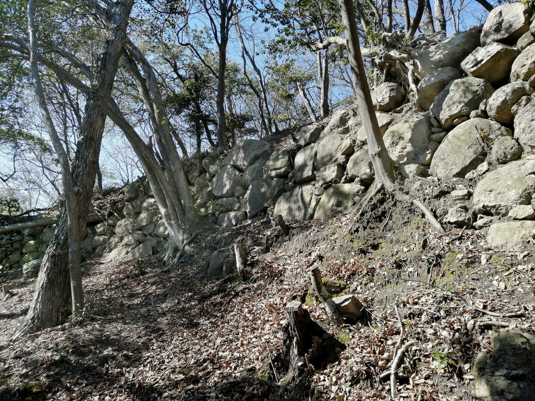 圧巻なのは、郭の南のり面に積まれた石垣です。西虎口から東虎口までつながっており、全長30m以上あります。また石垣は横矢が効くように内側に湾曲した形に積まれています。