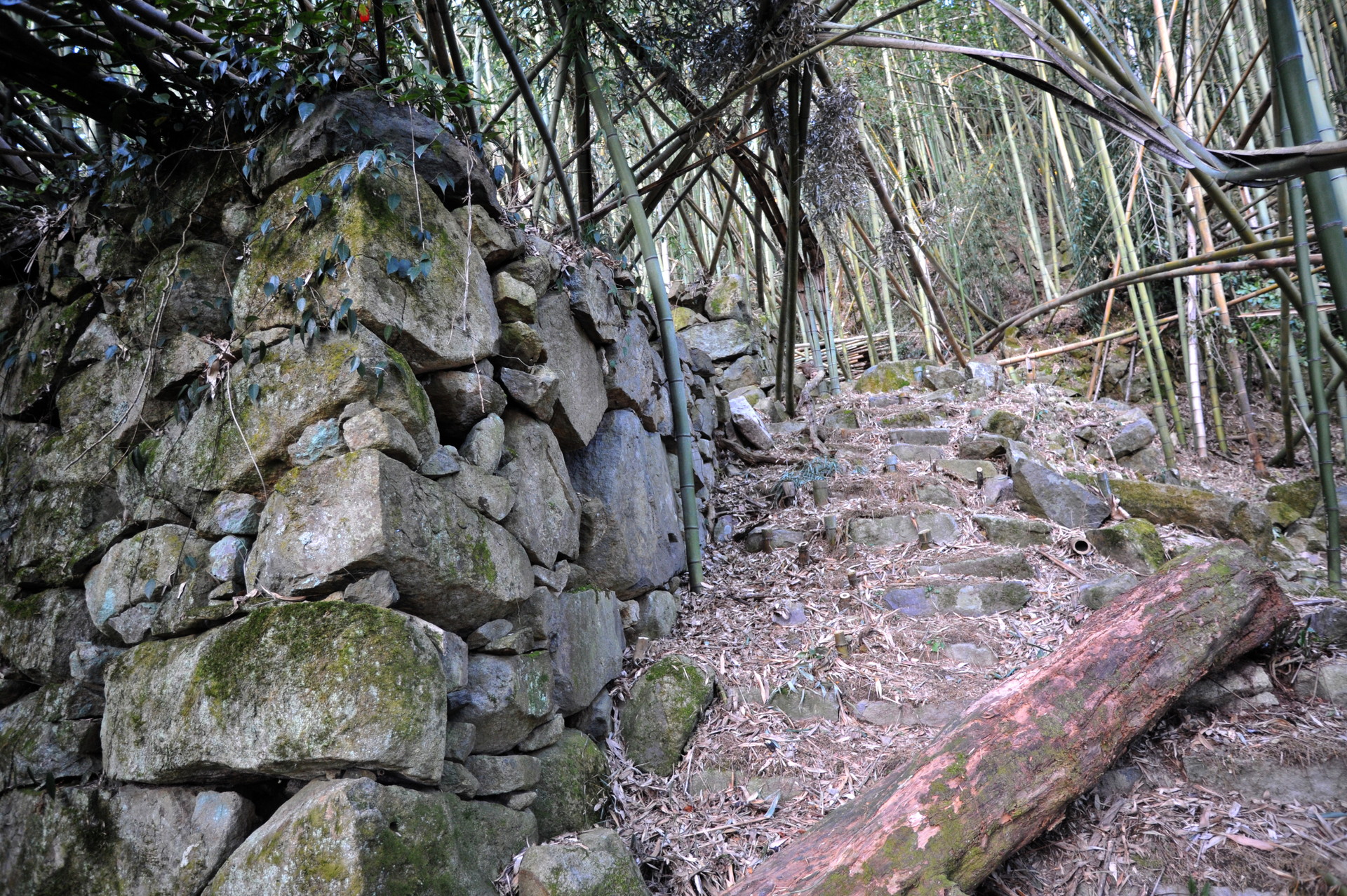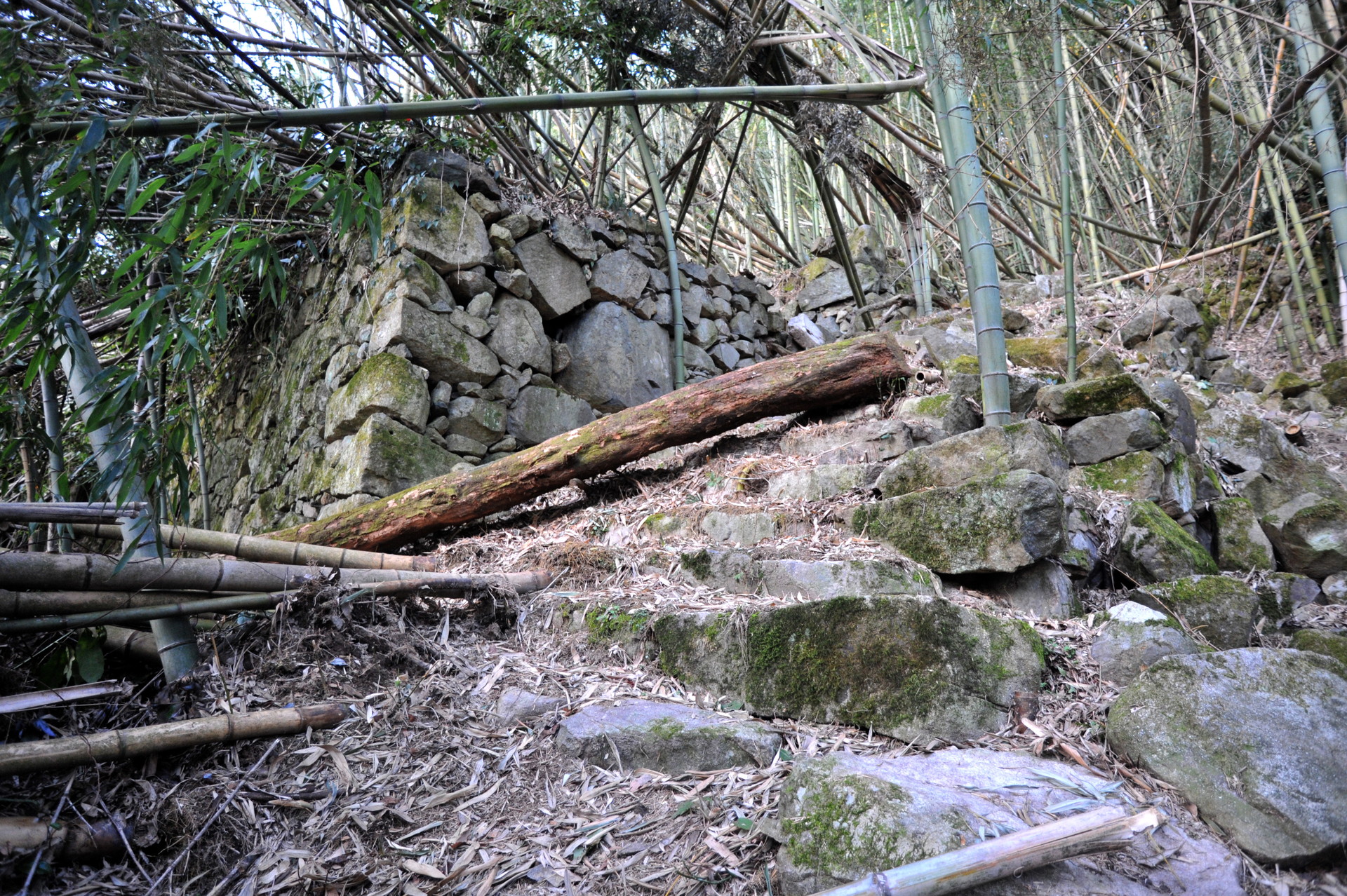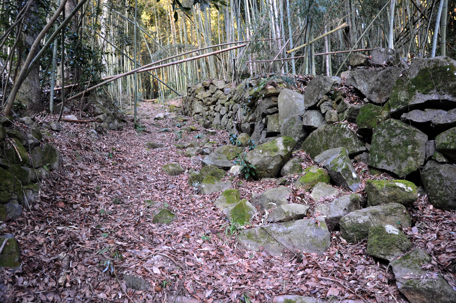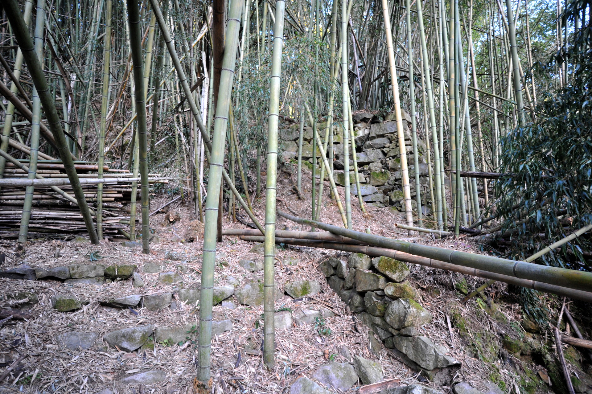後藤郭の中央通路の階段を登り終えると、右手に立派な石垣が見えます。これが後藤郭中段の石垣です。だいぶ前に立入を試みた時、枯れ竹に覆われていて通れそうになかったので、見過ごしていたのですが、友人の案内でようやく中に入る事ができました。