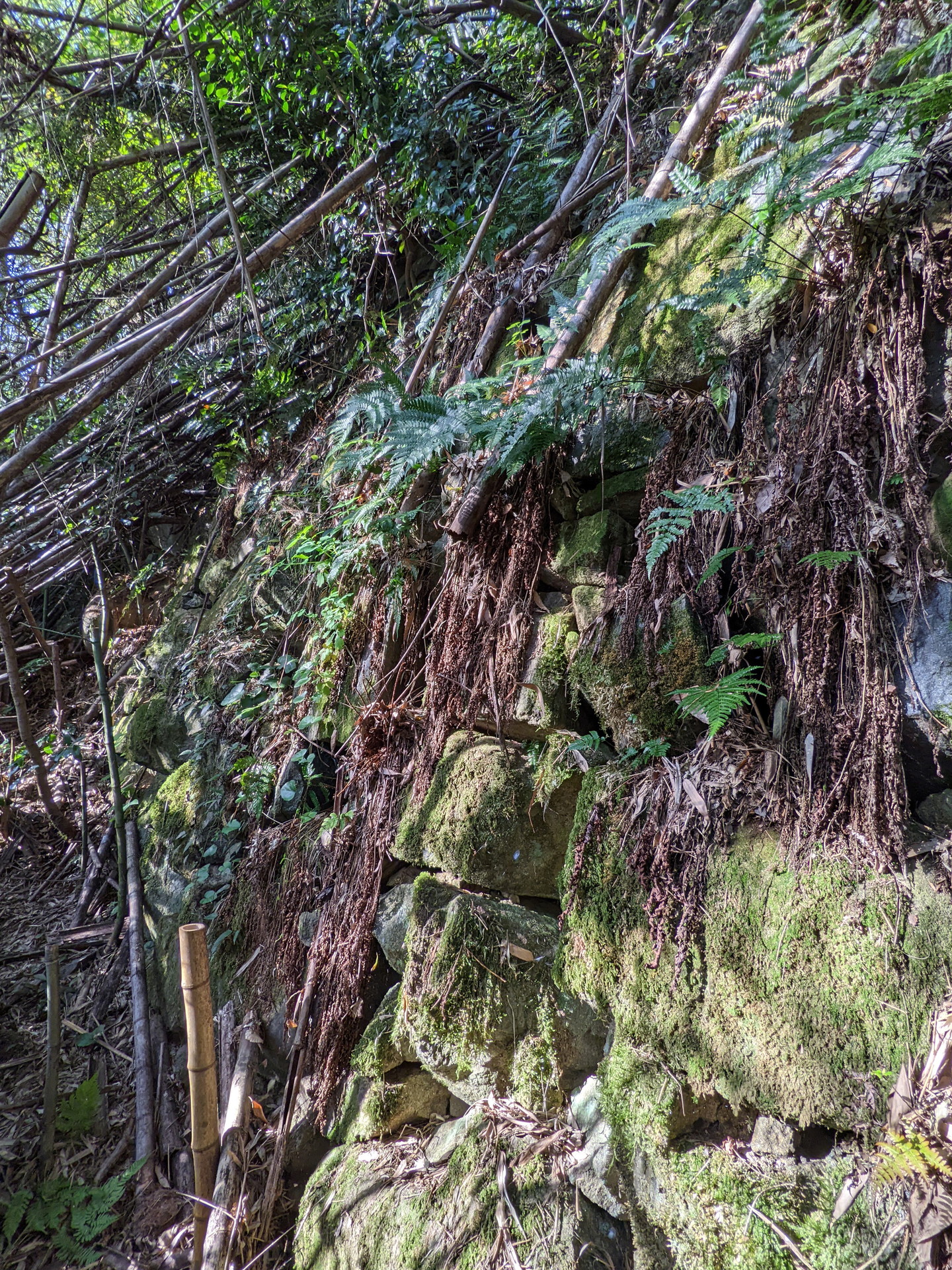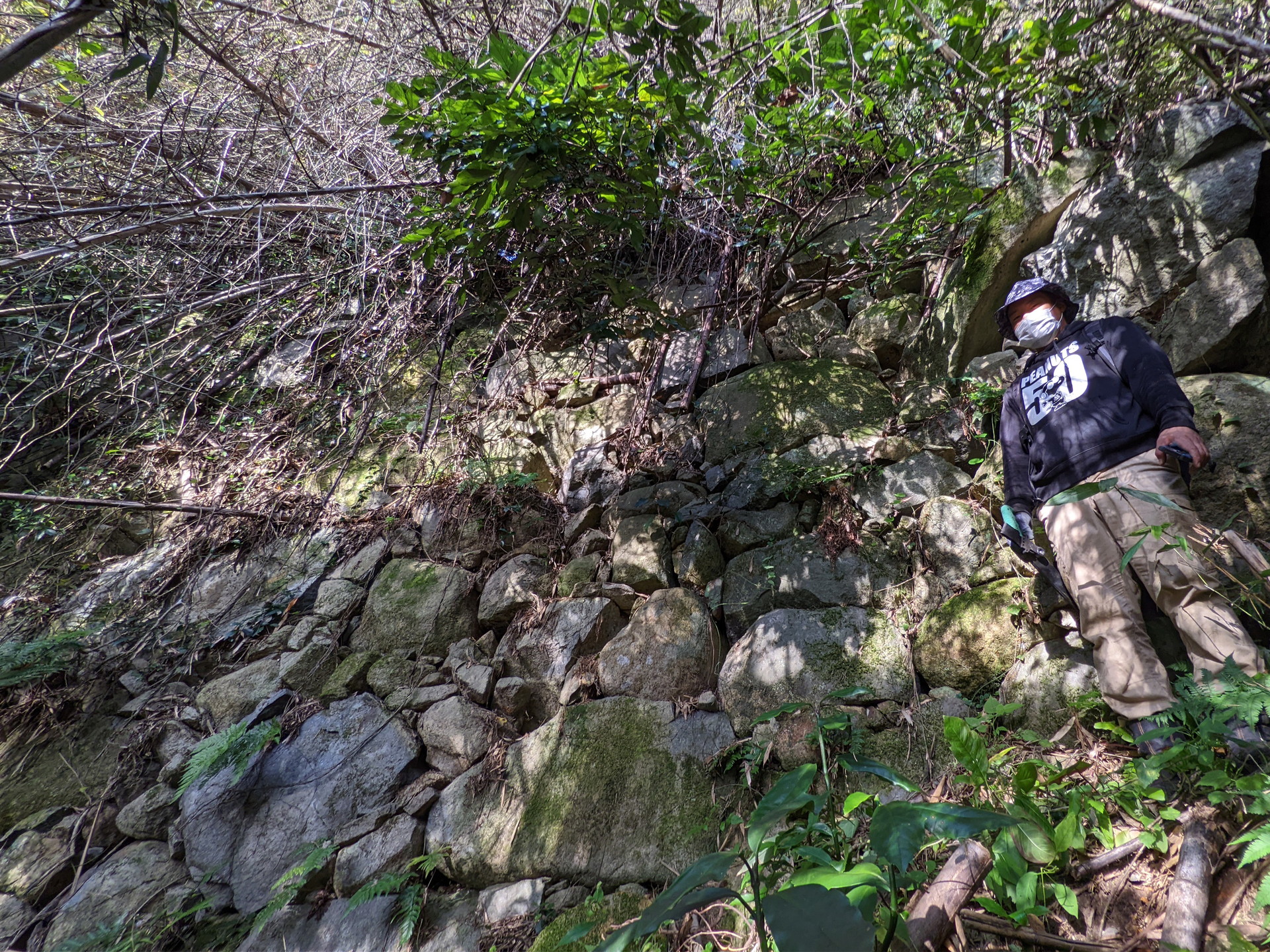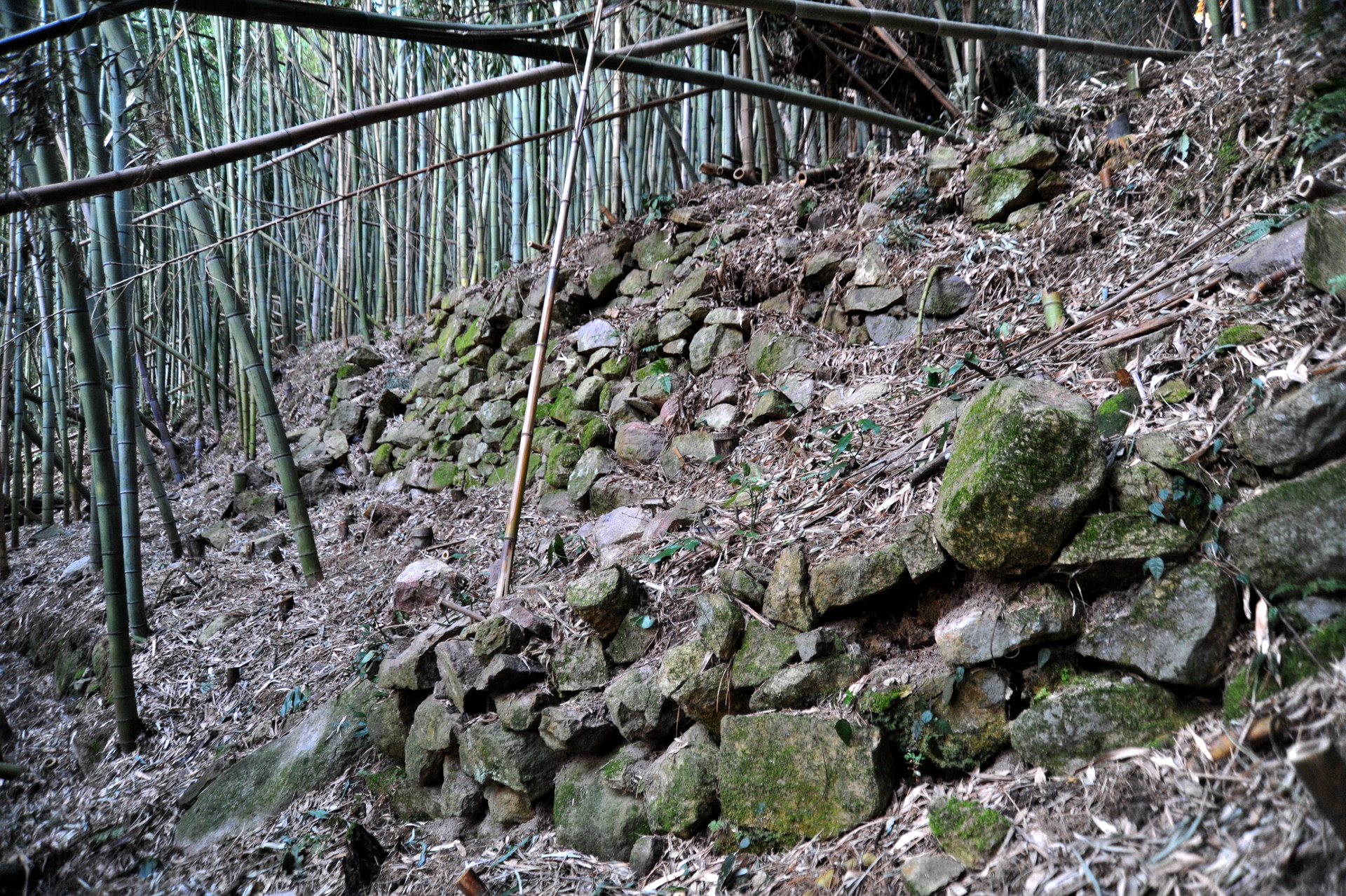 西側からは折り重なった枯れr竹に阻まれて、中に入る事ができません。そこで今回は東側から入る事にしました。やっとの思いで東の角に辿り付き、そこで目に飛び込んできたのは、目を疑うほど巨大な石垣でした。