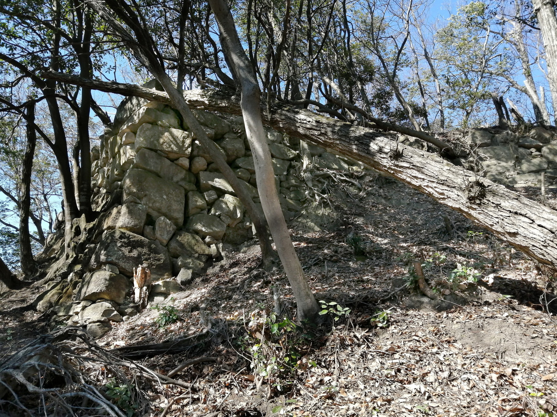 圧巻なのは、郭の南のり面に積まれた石垣です。西虎口から東虎口までつながっており、全長30m以上あります。また石垣は横矢が効くように内側に湾曲した形に積まれています。