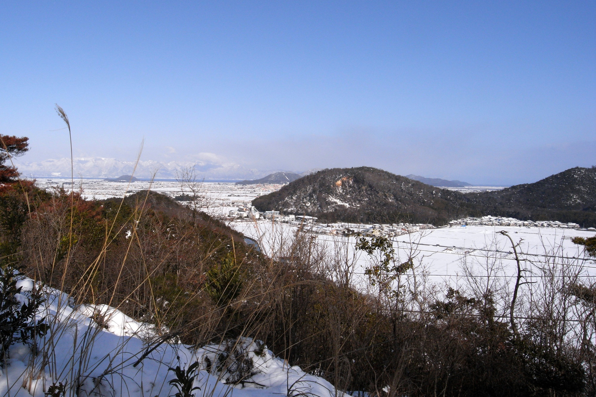 以下の写真は 2010年 5月に大岩展望台から撮影したものです。眼下に町並や美しい田園風景が広がり、天気が良い日には琵琶湖や比良山、伊吹山が良く見えます。この大岩展望台は雪野山北西部に位置する下羽田の里山の中でいちばん展望の良い場所であり、一押しのスポットとしてハイカーの皆さんにお奨めしています。