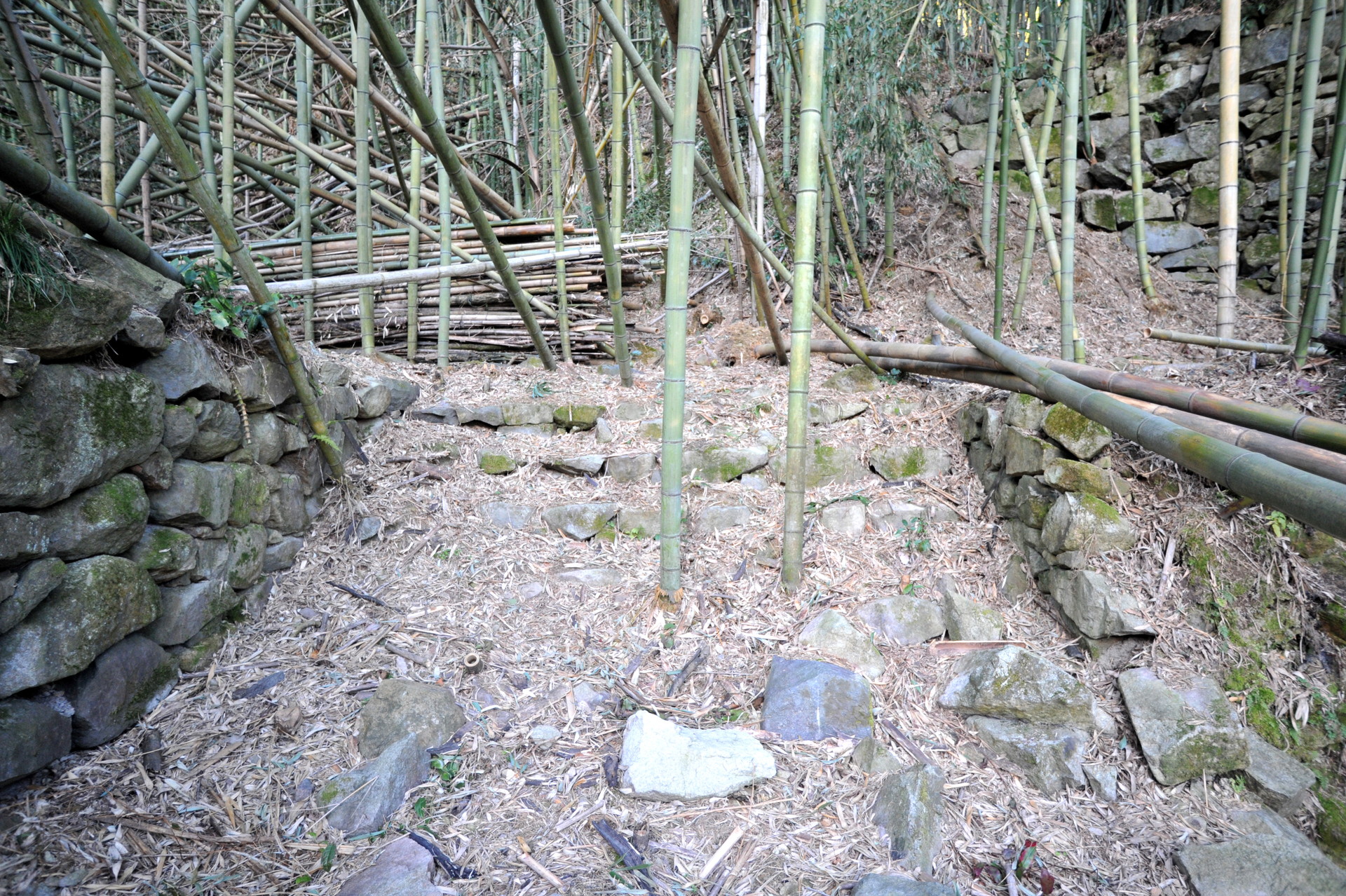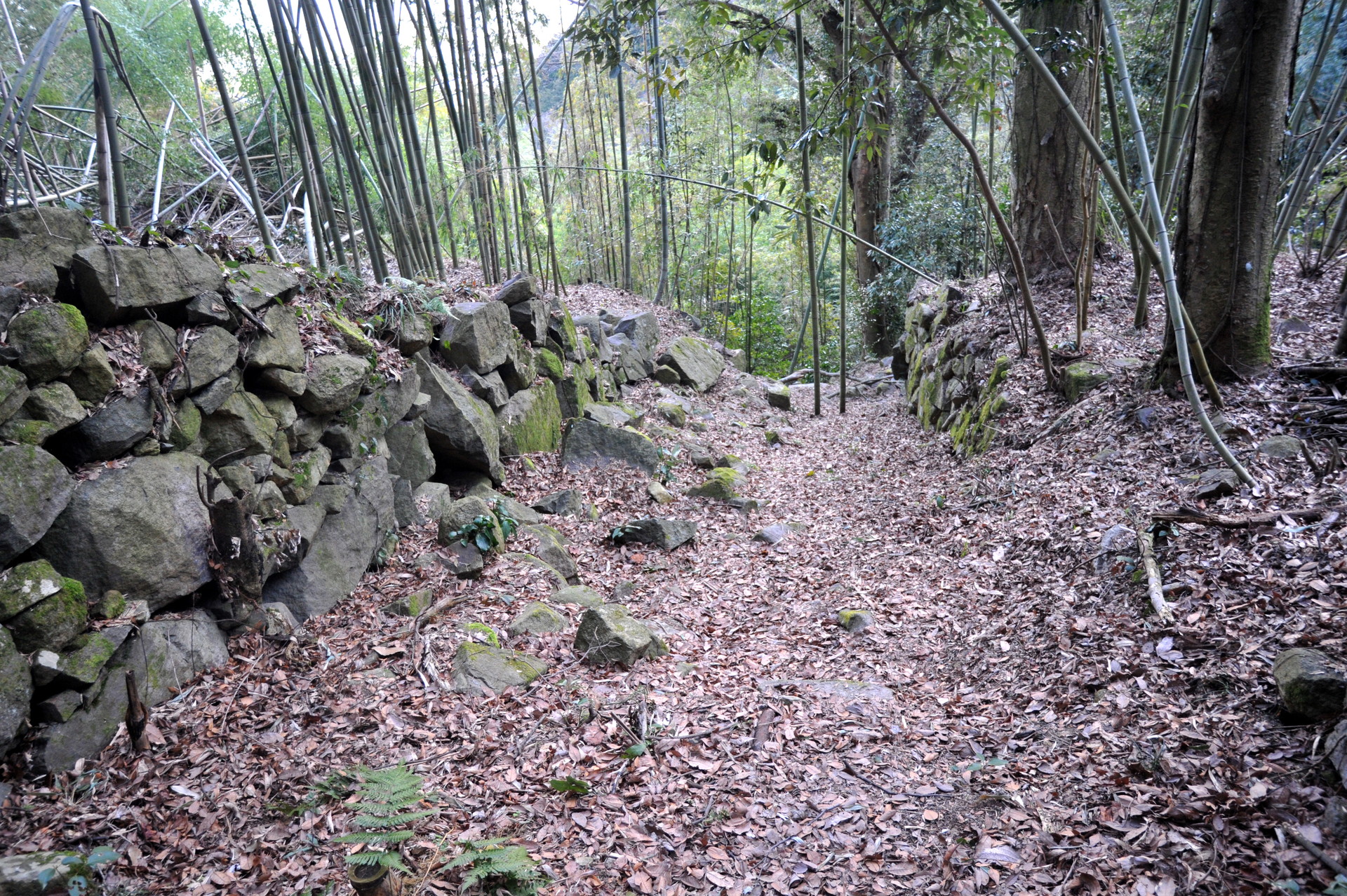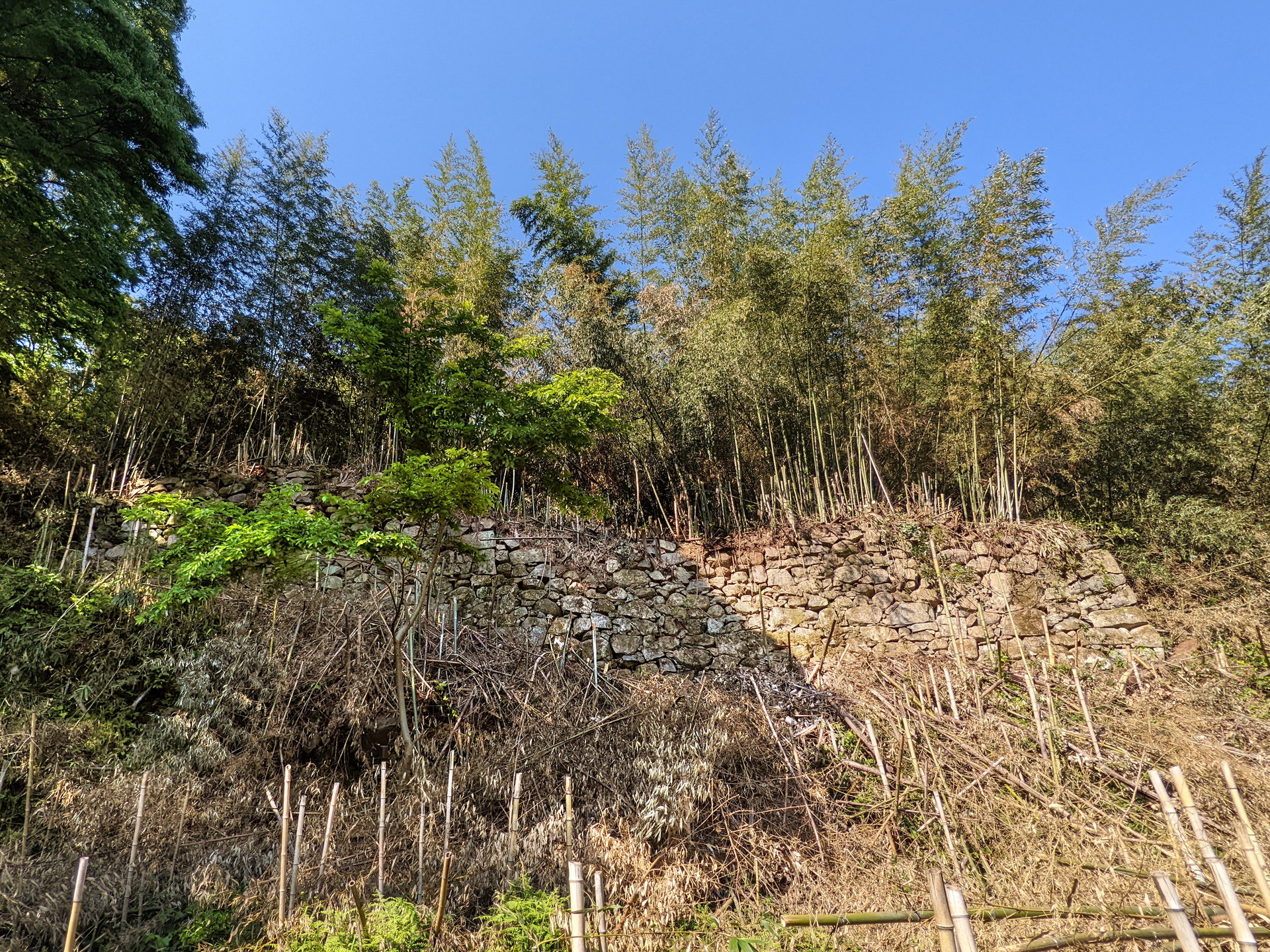 後藤郭の中央通路の階段を登り終えると、右手に立派な石垣が見えます。これが後藤郭中段の石垣です。だいぶ前に立入を試みた時、枯れ竹に覆われていて通れそうになかったので、見過ごしていたのですが、友人の案内でようやく中に入る事ができました。