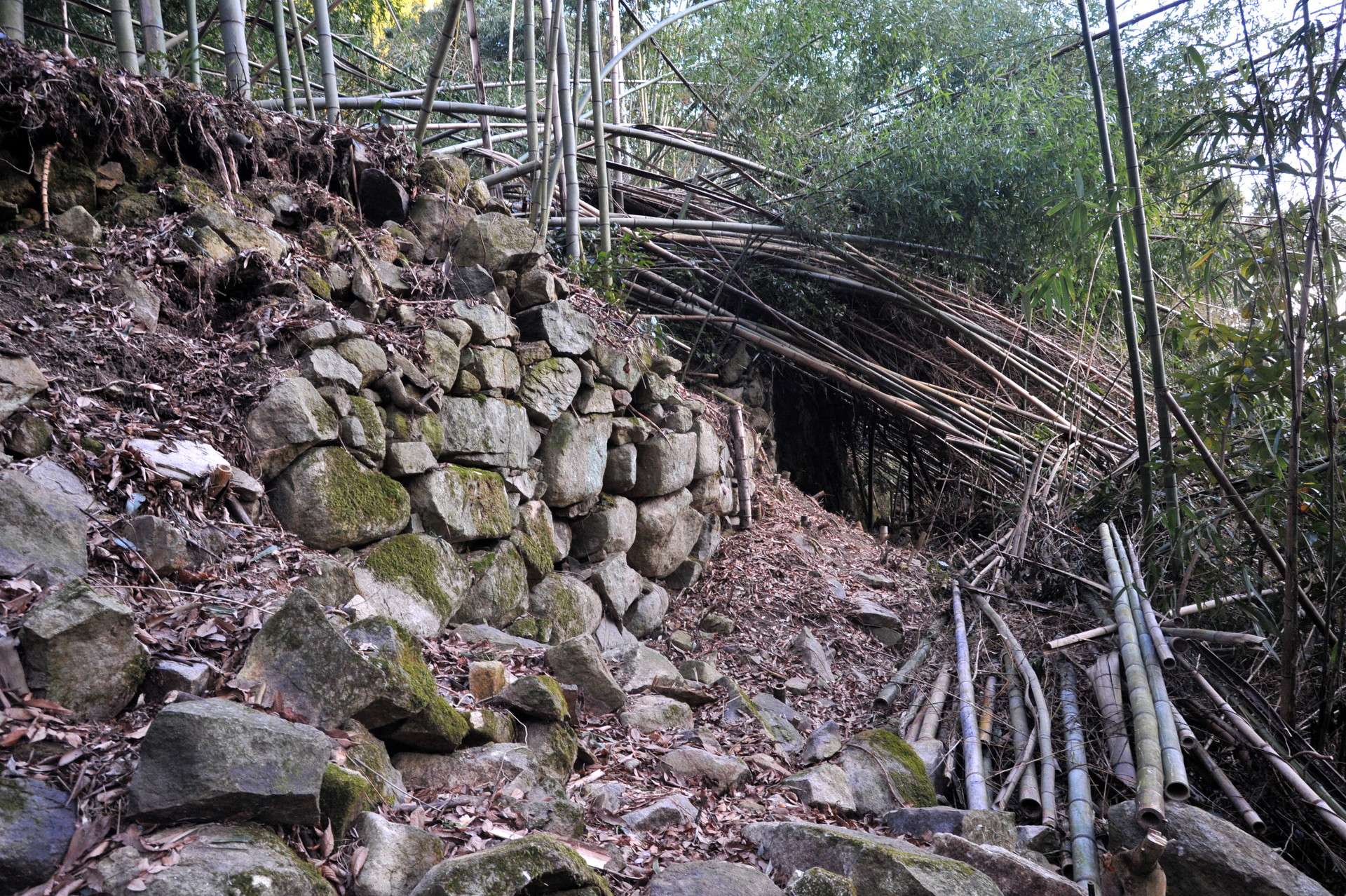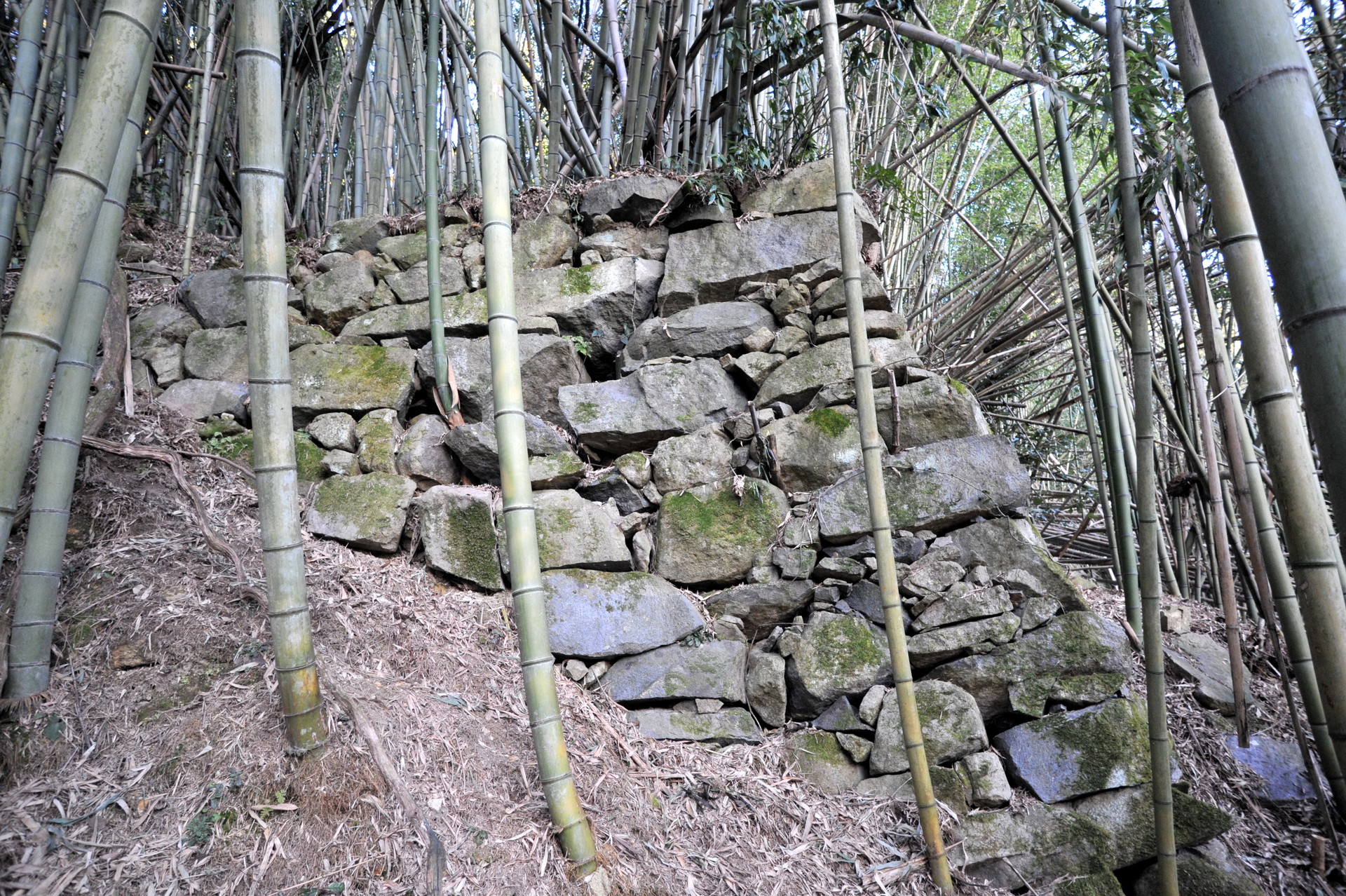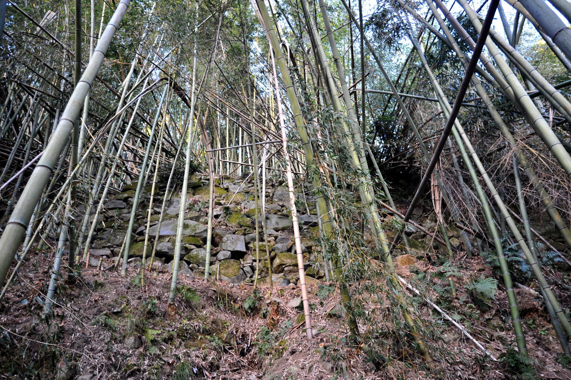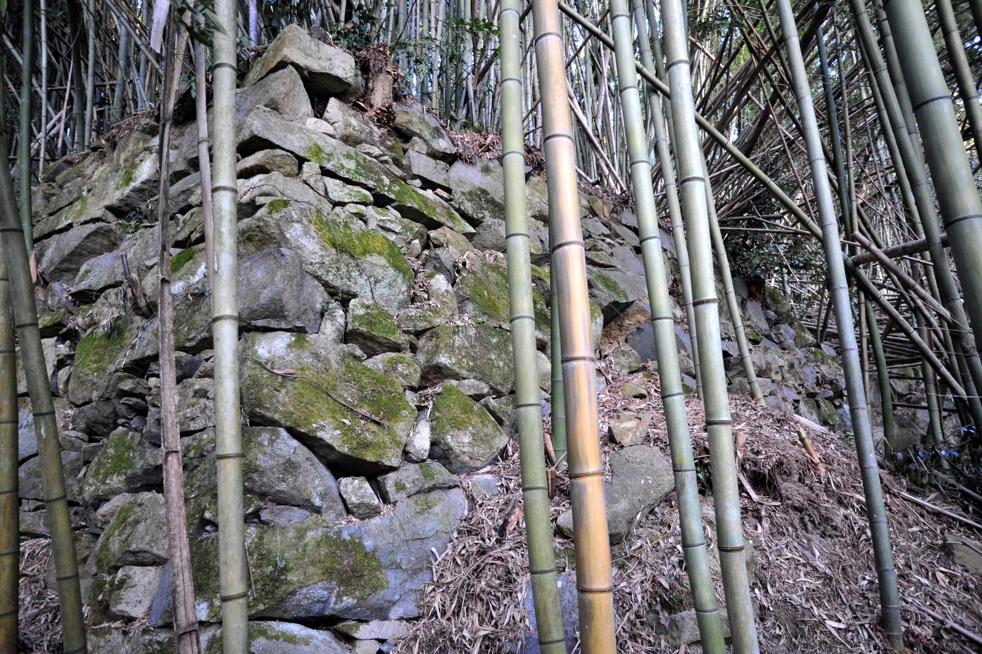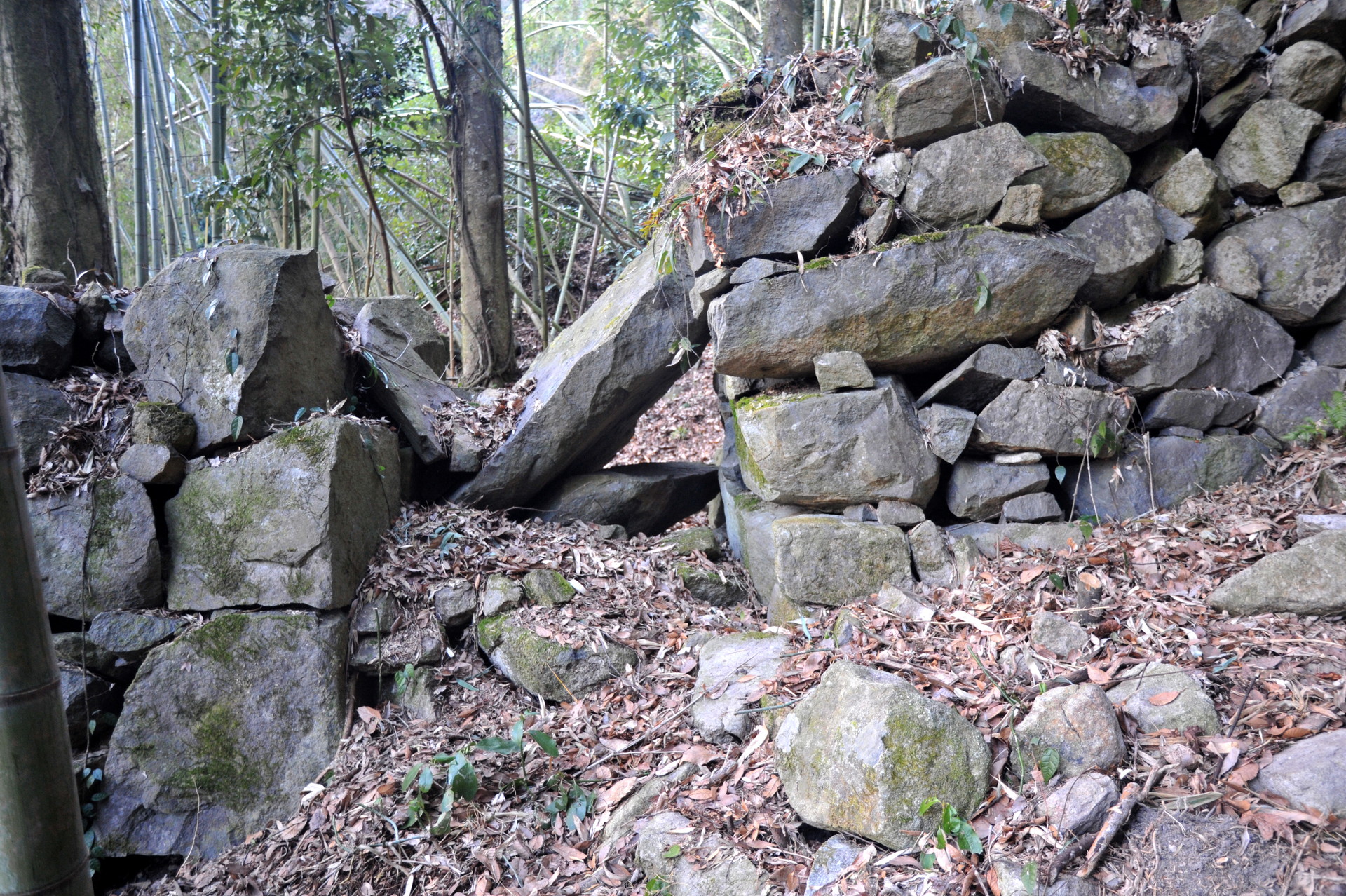 西側からは折り重なった枯れr竹に阻まれて、中に入る事ができません。そこで今回は東側から入る事にしました。やっとの思いで東の角に辿り付き、そこで目に飛び込んできたのは、目を疑うほど巨大な石垣でした。