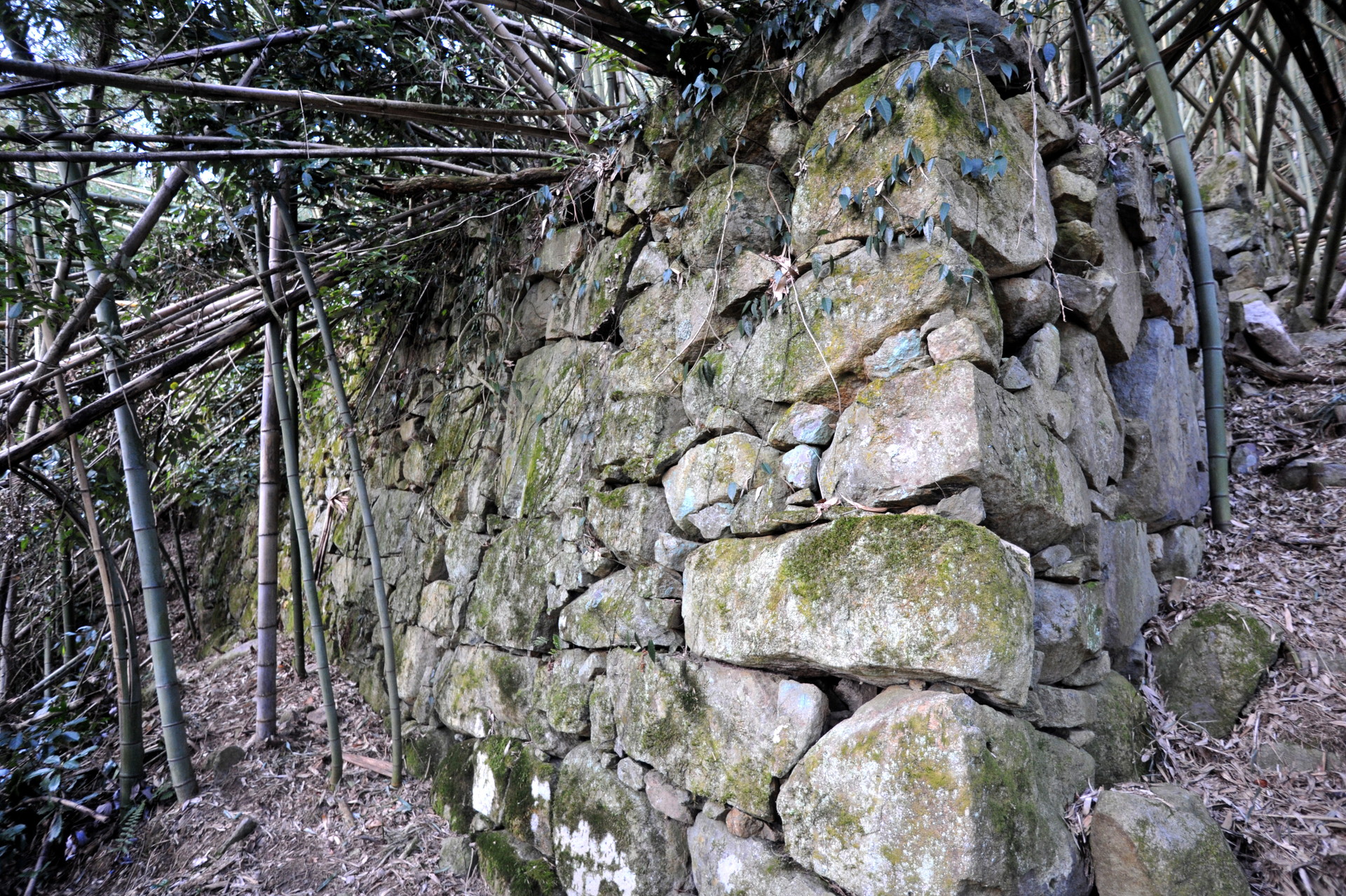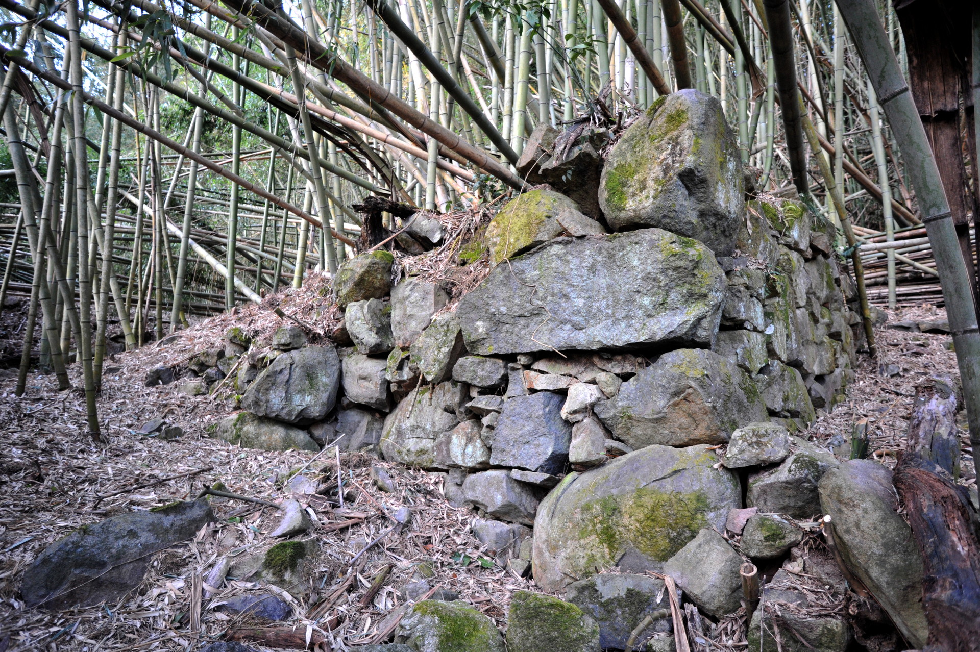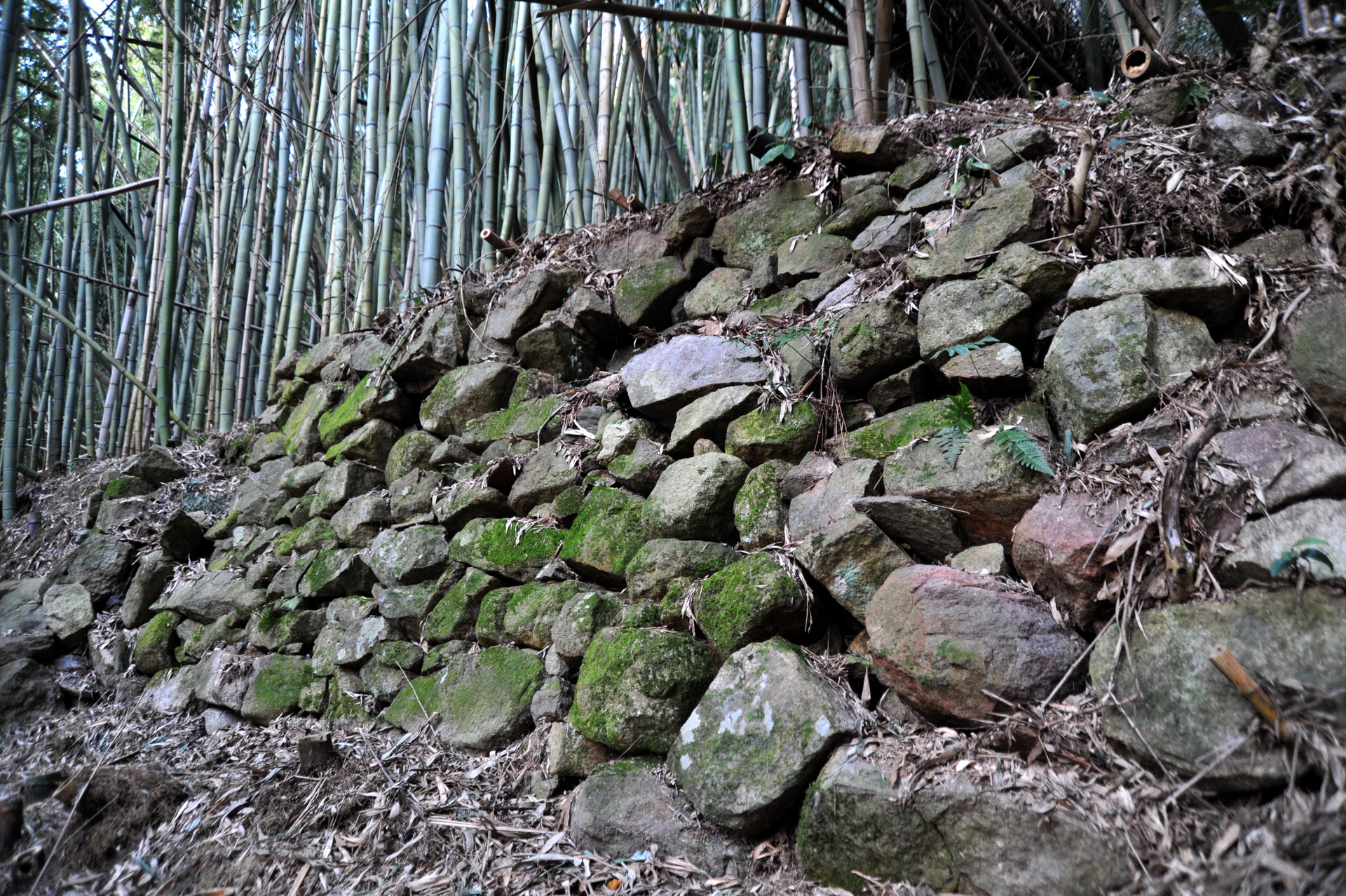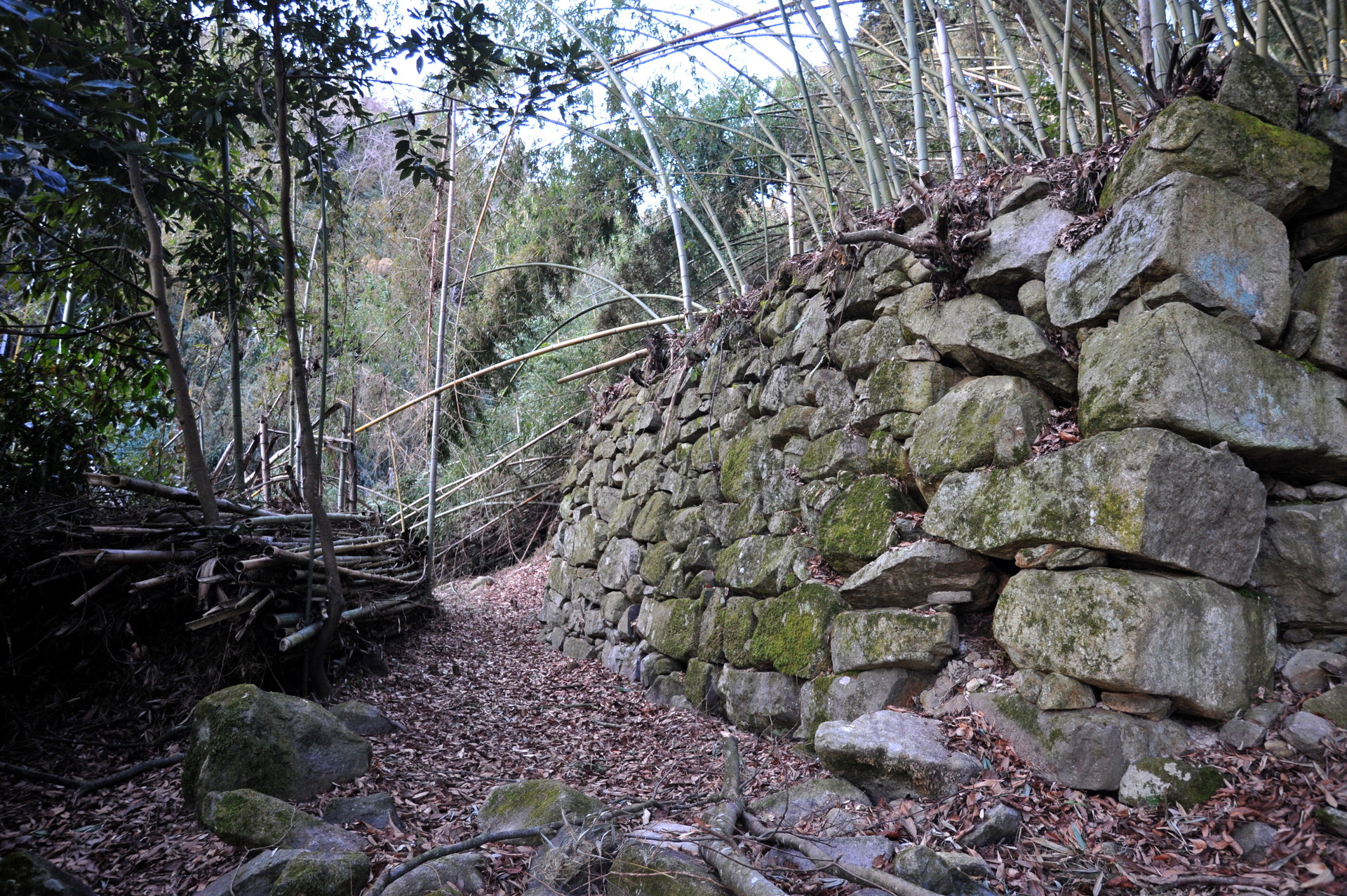 西側からは折り重なった枯れr竹に阻まれて、中に入る事ができません。そこで今回は東側から入る事にしました。やっとの思いで東の角に辿り付き、そこで目に飛び込んできたのは、目を疑うほど巨大な石垣でした。