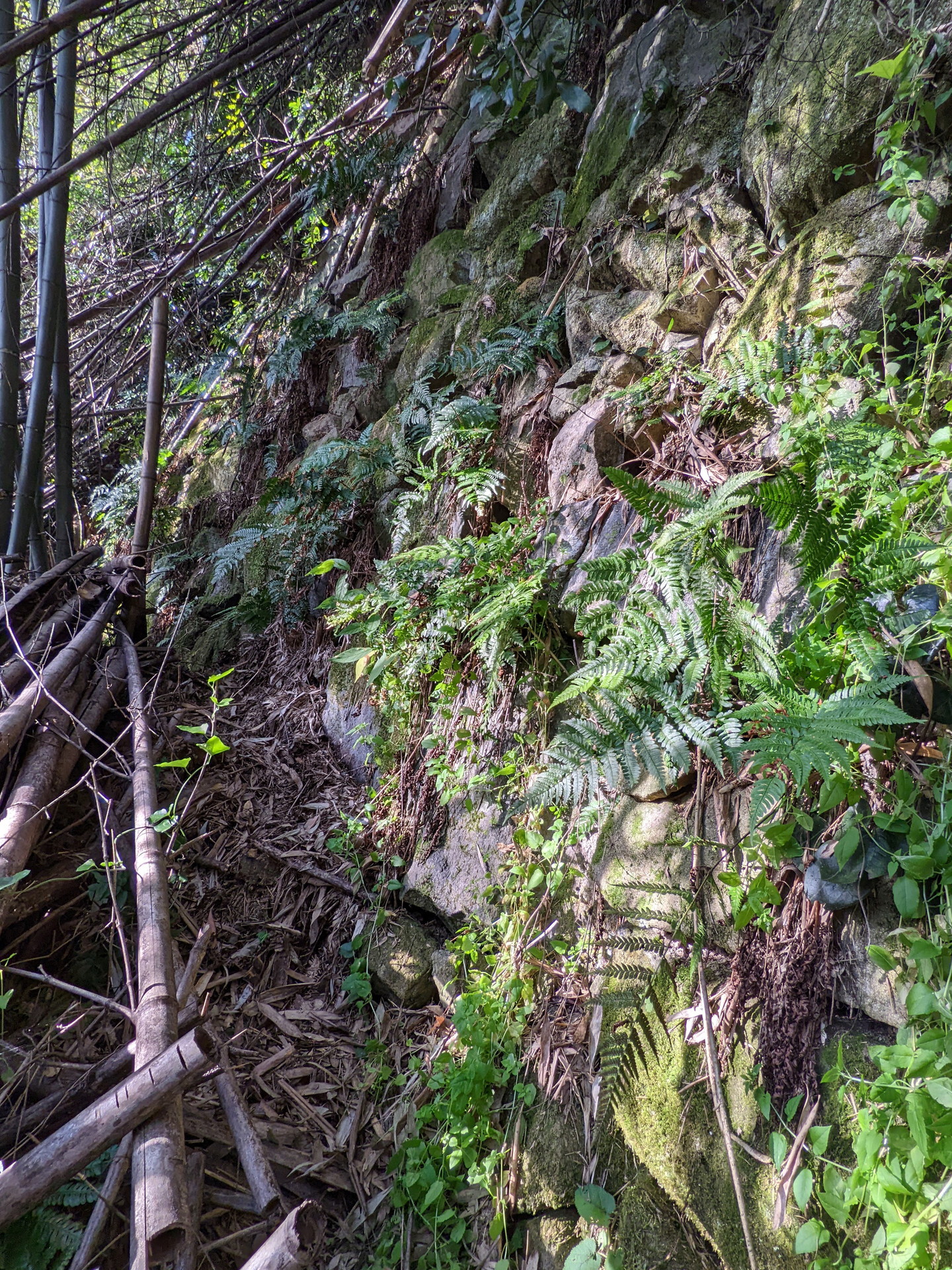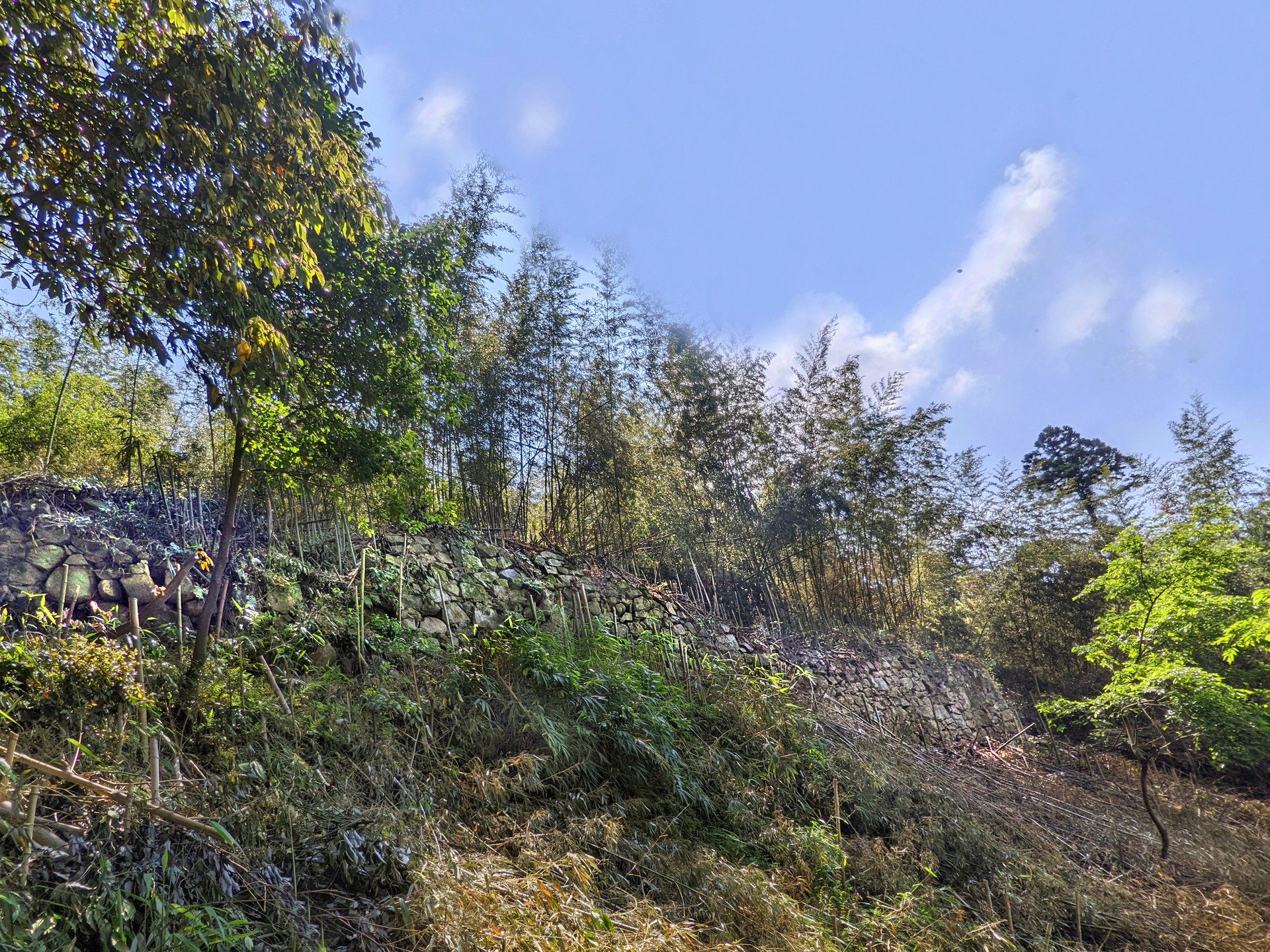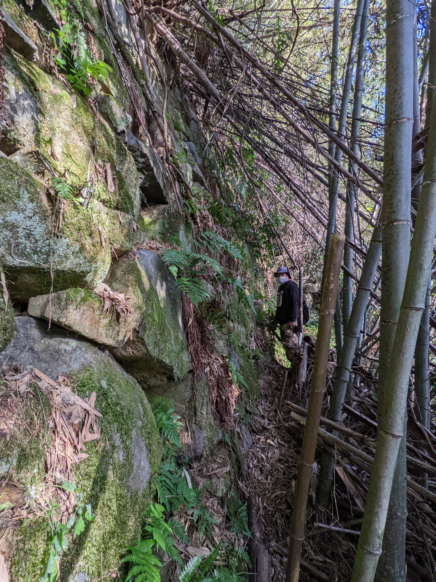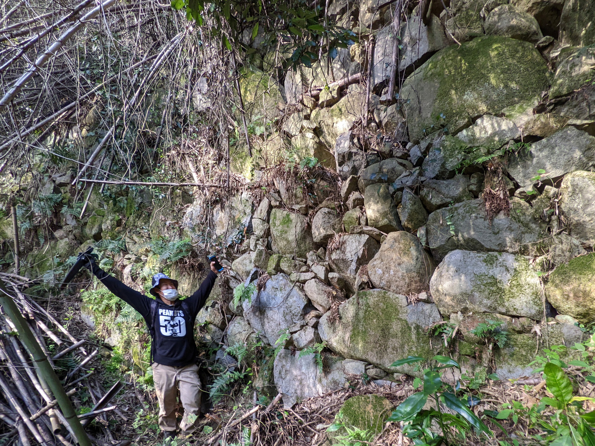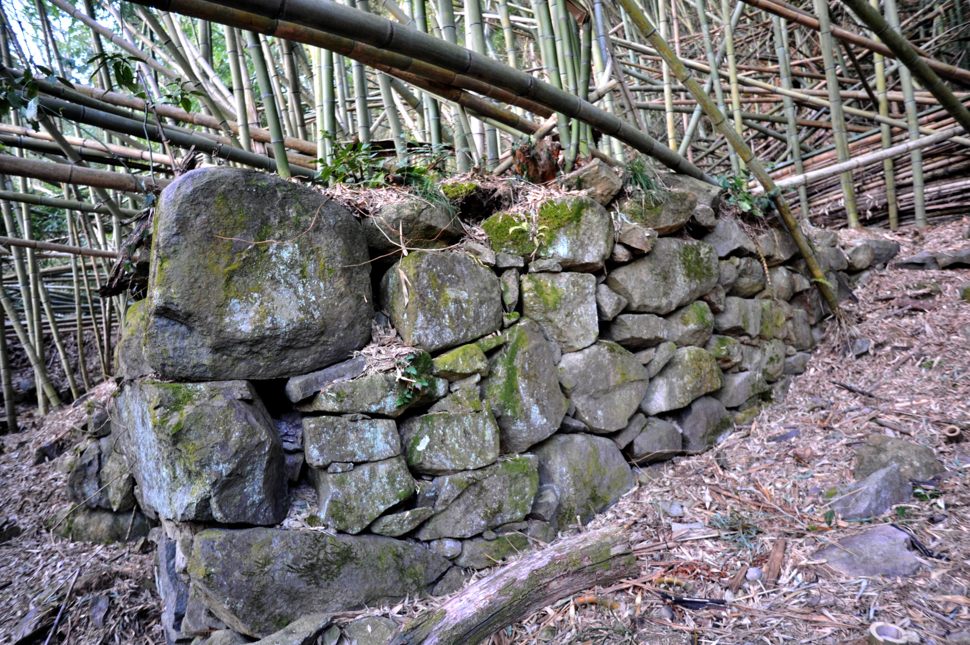西側からは折り重なった枯れr竹に阻まれて、中に入る事ができません。そこで今回は東側から入る事にしました。やっとの思いで東の角に辿り付き、そこで目に飛び込んできたのは、目を疑うほど巨大な石垣でした。