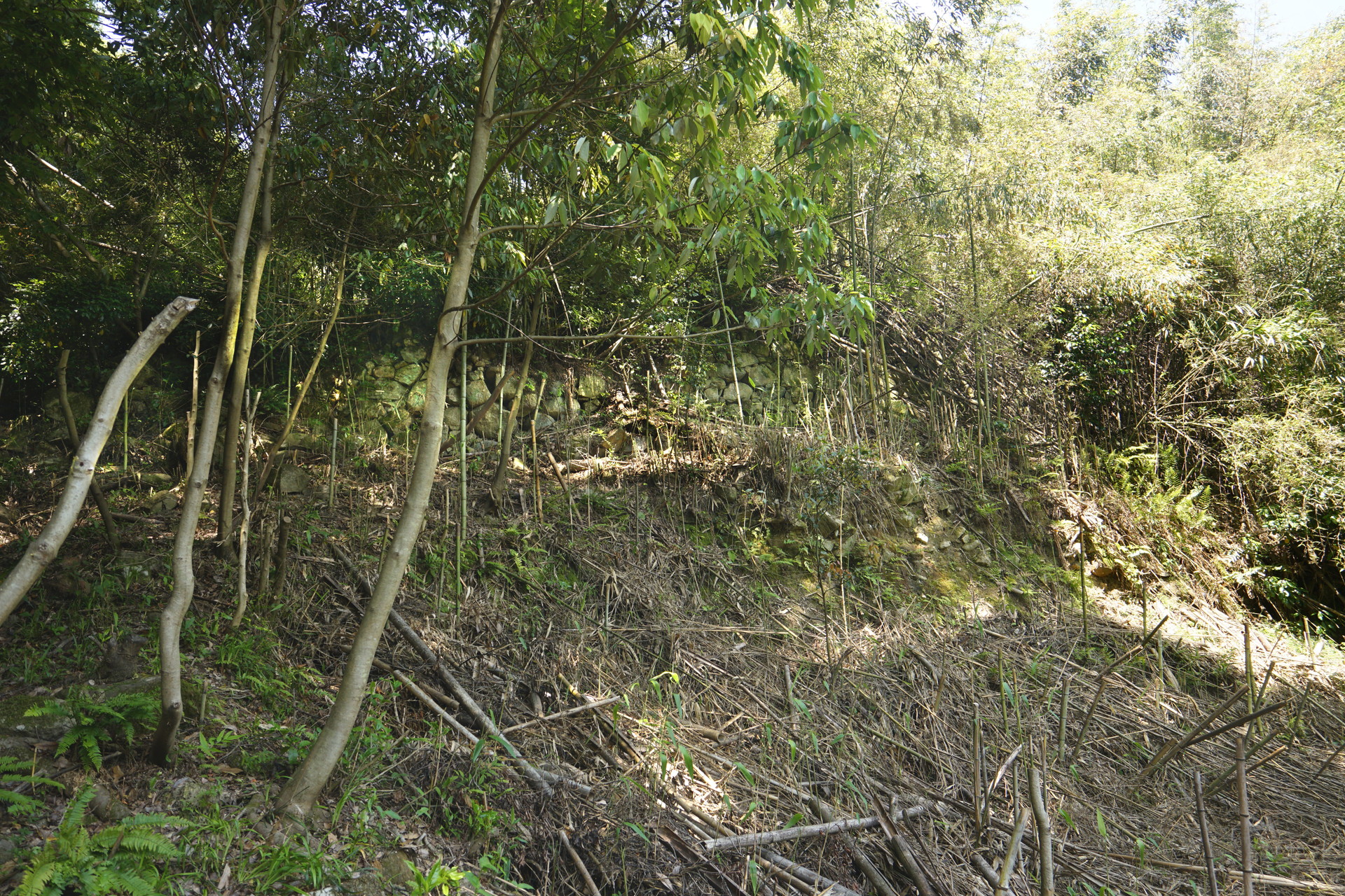 このように藪に埋もれた大手道ですが、現在ではいくらか道筋の掃除が進み、立ち入れる区間もあります。以下の写真は、射場と伝えられているあたりの写真です。大手道の途中、ちょうど後藤邸・進藤邸の直下にあり、見上げると後藤邸下段の石垣が目に飛び込んできます。