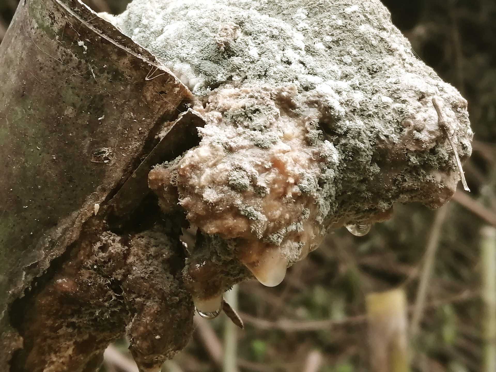 おそらくこれは、根に蓄えられた養分が吸い上げられているのだと思います。大なり小なり他の竹からも噴出しており、あたり一面に異様な匂いが漂っています。推論ではありますが、根の養分が大量に浪費されており、これなら竹の再生が抑えられるのではないかと期待しています。