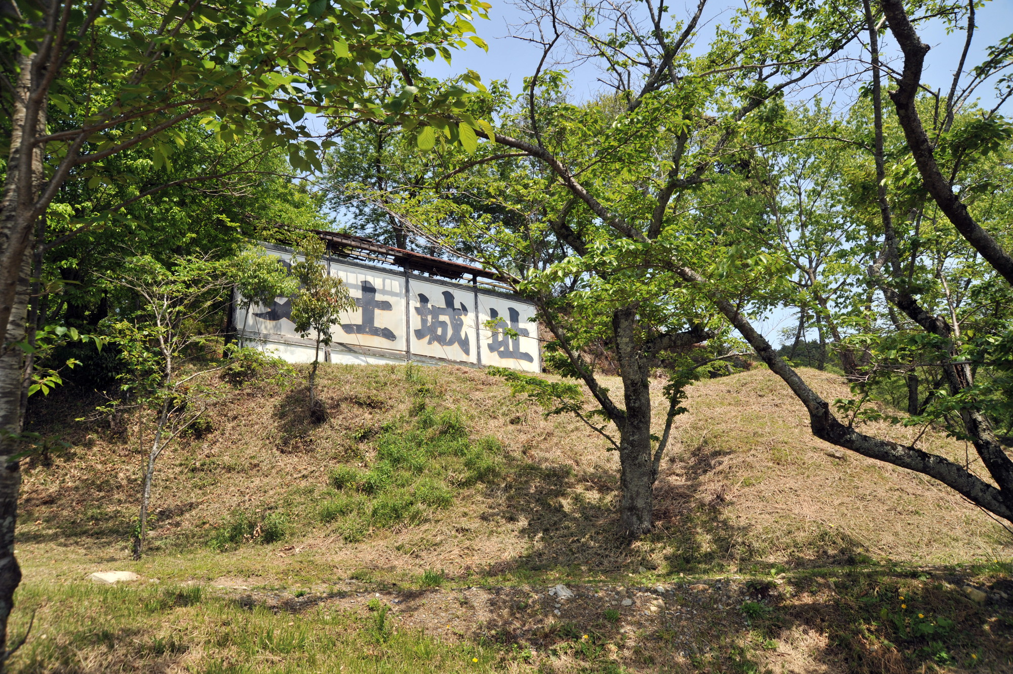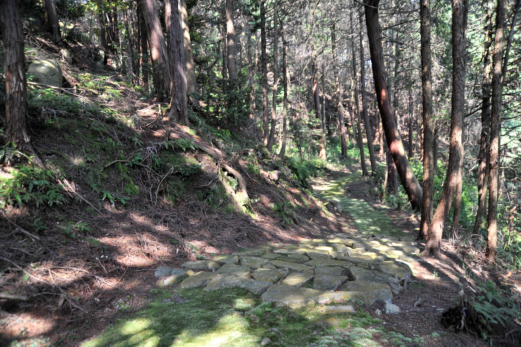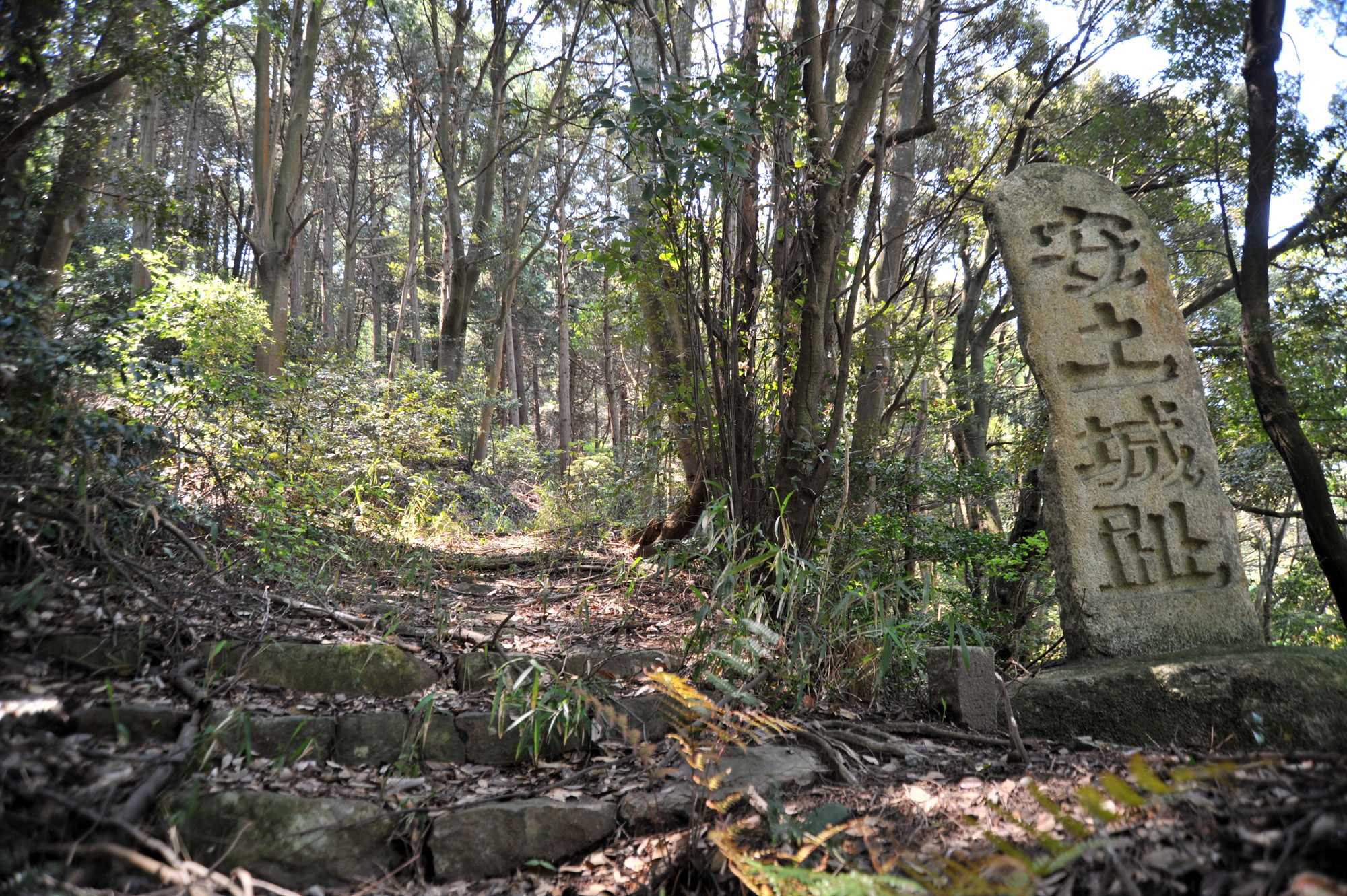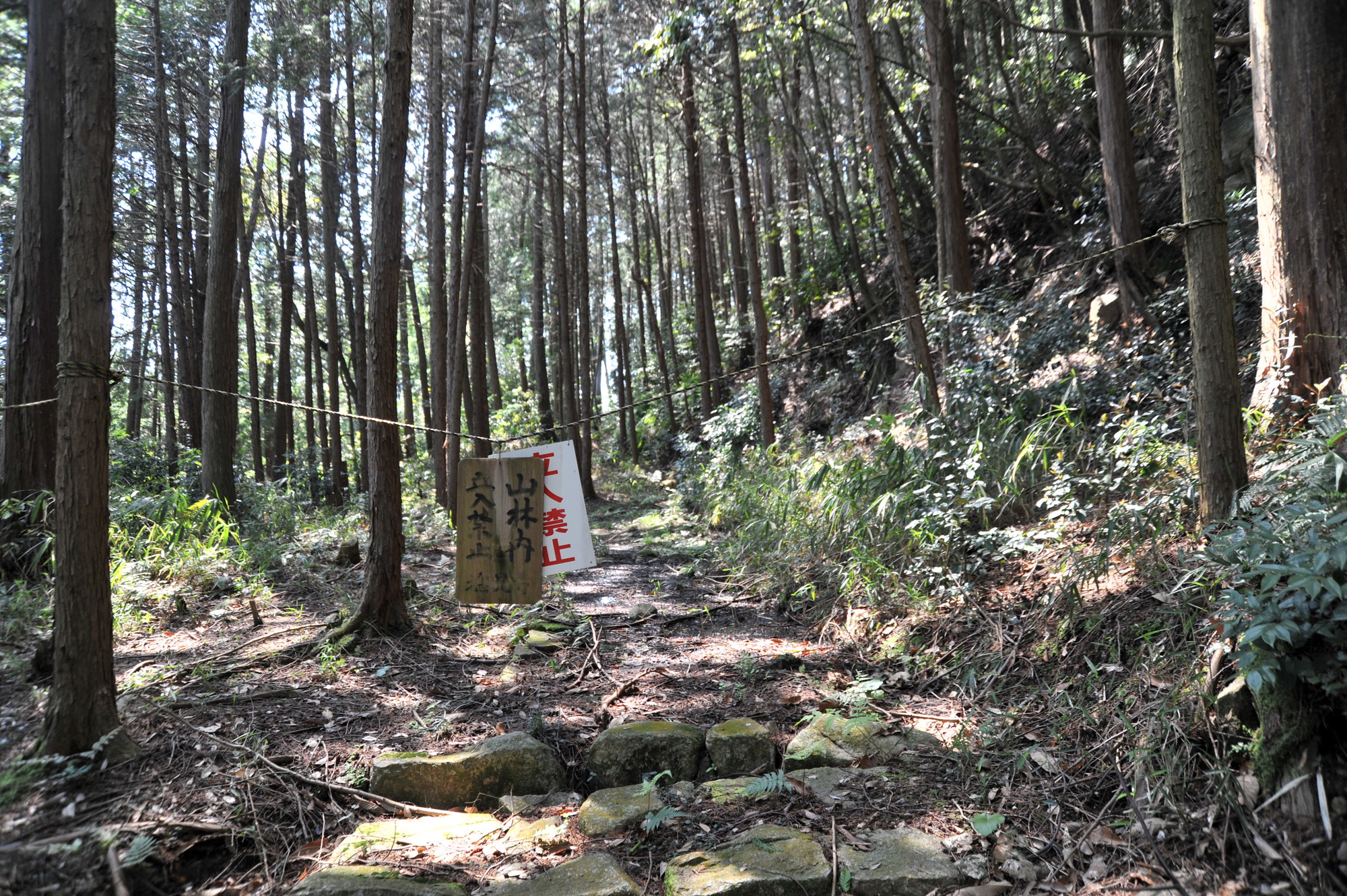 少し進むと立派な石垣があり、その角に「東門」の名が刻まれた石碑が立てられています。ちょうどここはその上にある郭の虎口にあたり、防御の為かここで道は折れ曲がっています。
