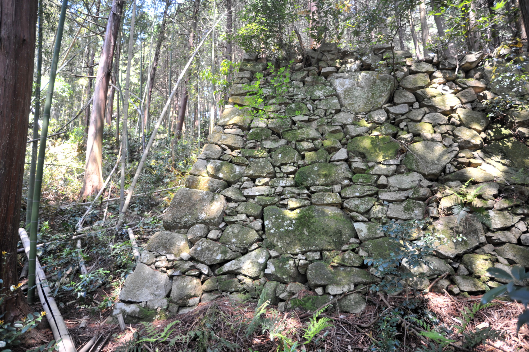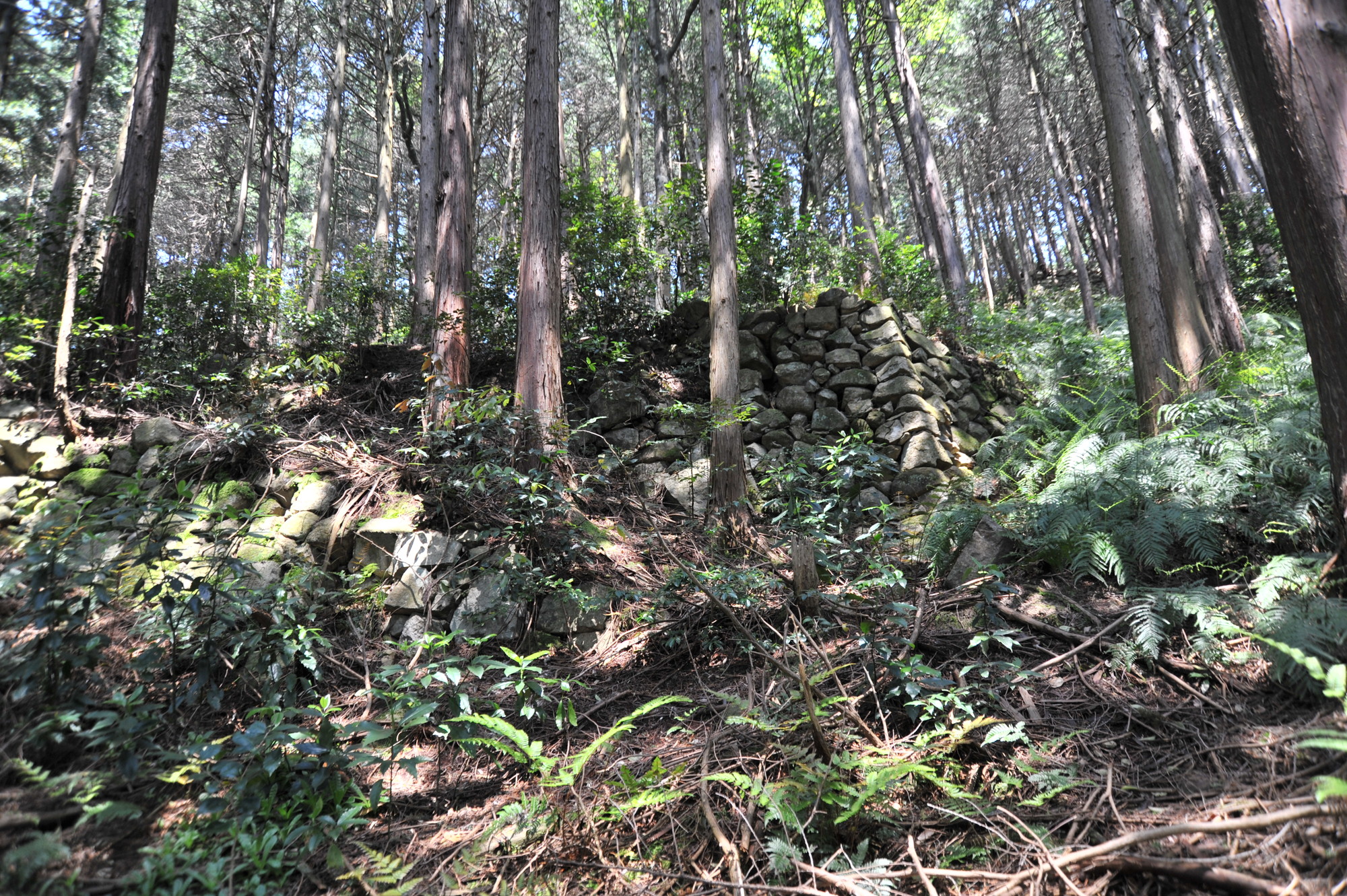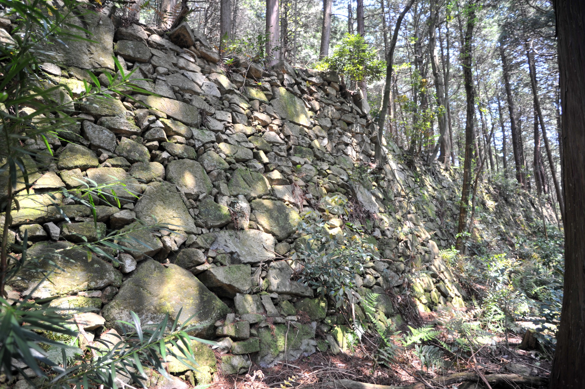 そのまま進むと御茶屋平を通過し東門道は終了しますが、御茶屋平に着く直前の斜面にも多くの石垣があります。この石垣は、松源院に入ったところから山腹を中堀跡に沿って戻ると見ることができます。