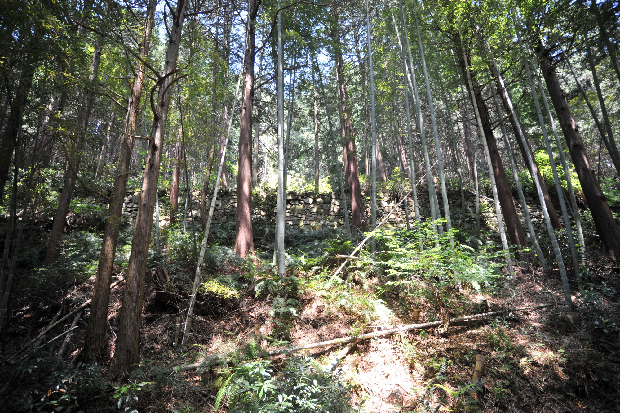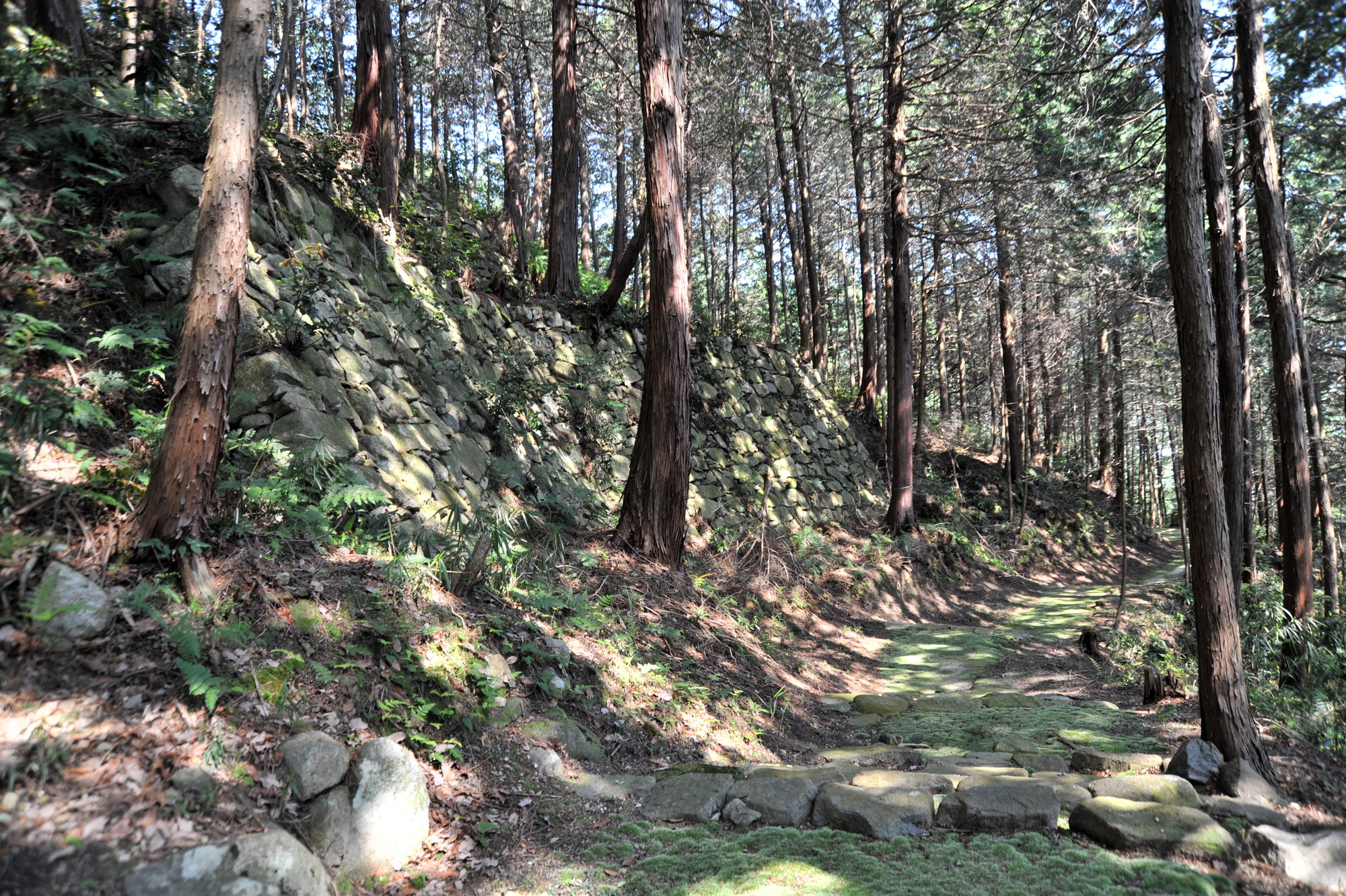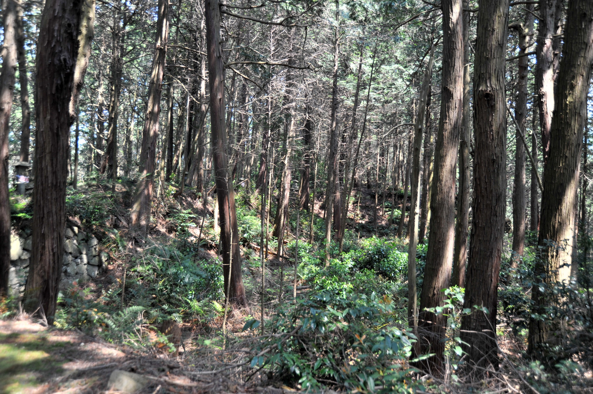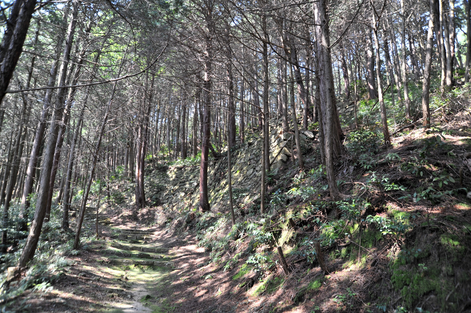 そのまま進むと御茶屋平を通過し東門道は終了しますが、御茶屋平に着く直前の斜面にも多くの石垣があります。この石垣は、松源院に入ったところから山腹を中堀跡に沿って戻ると見ることができます。