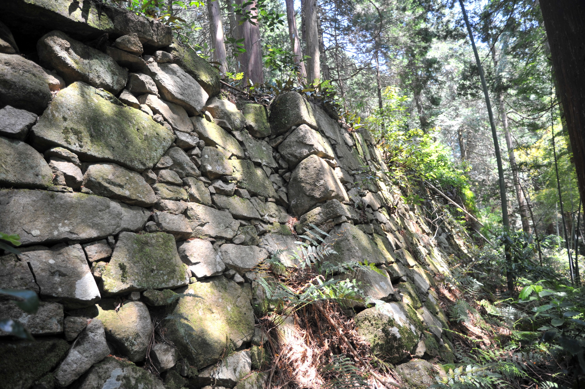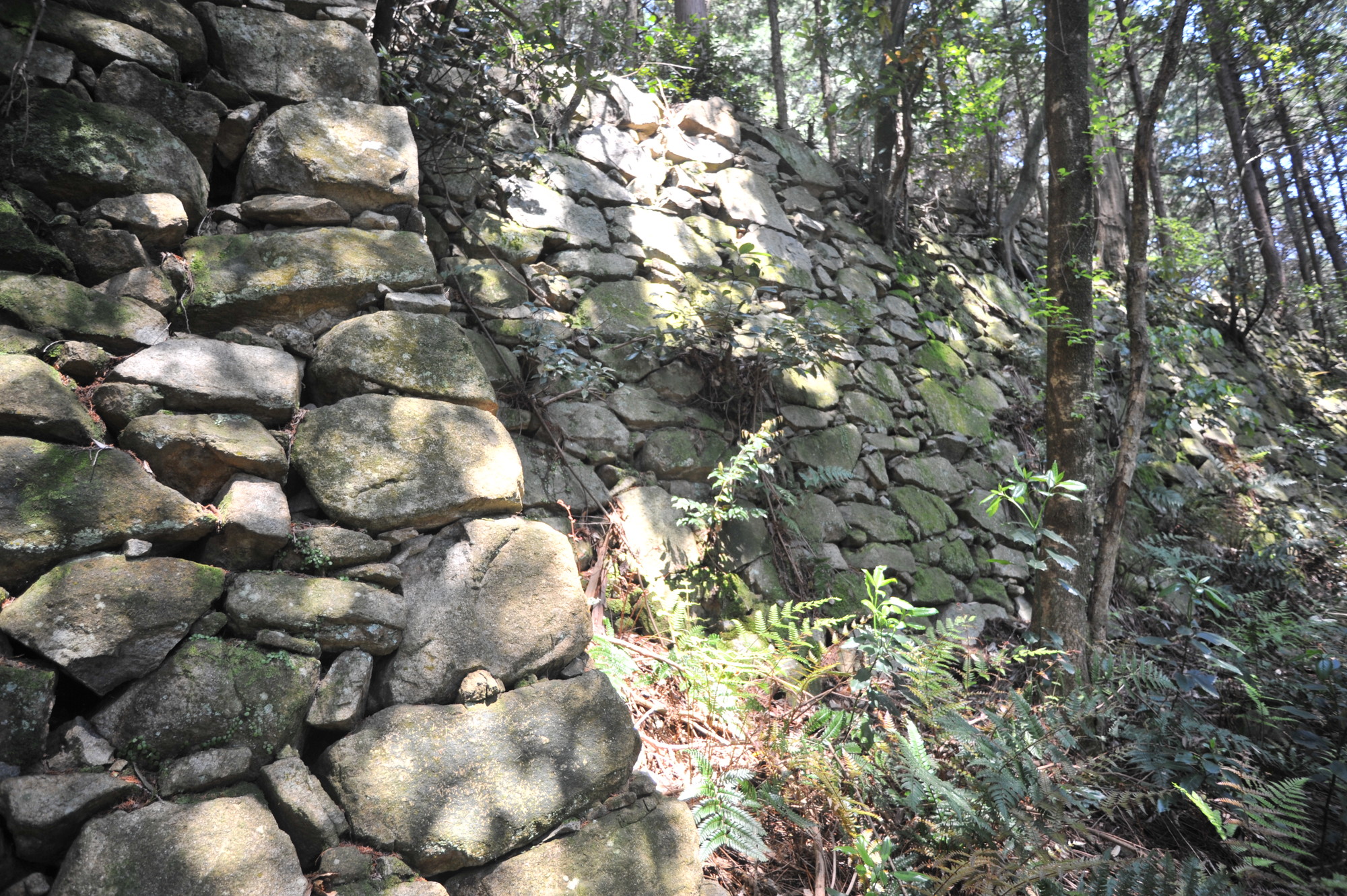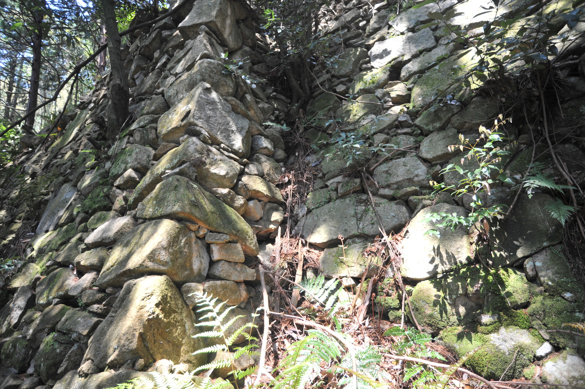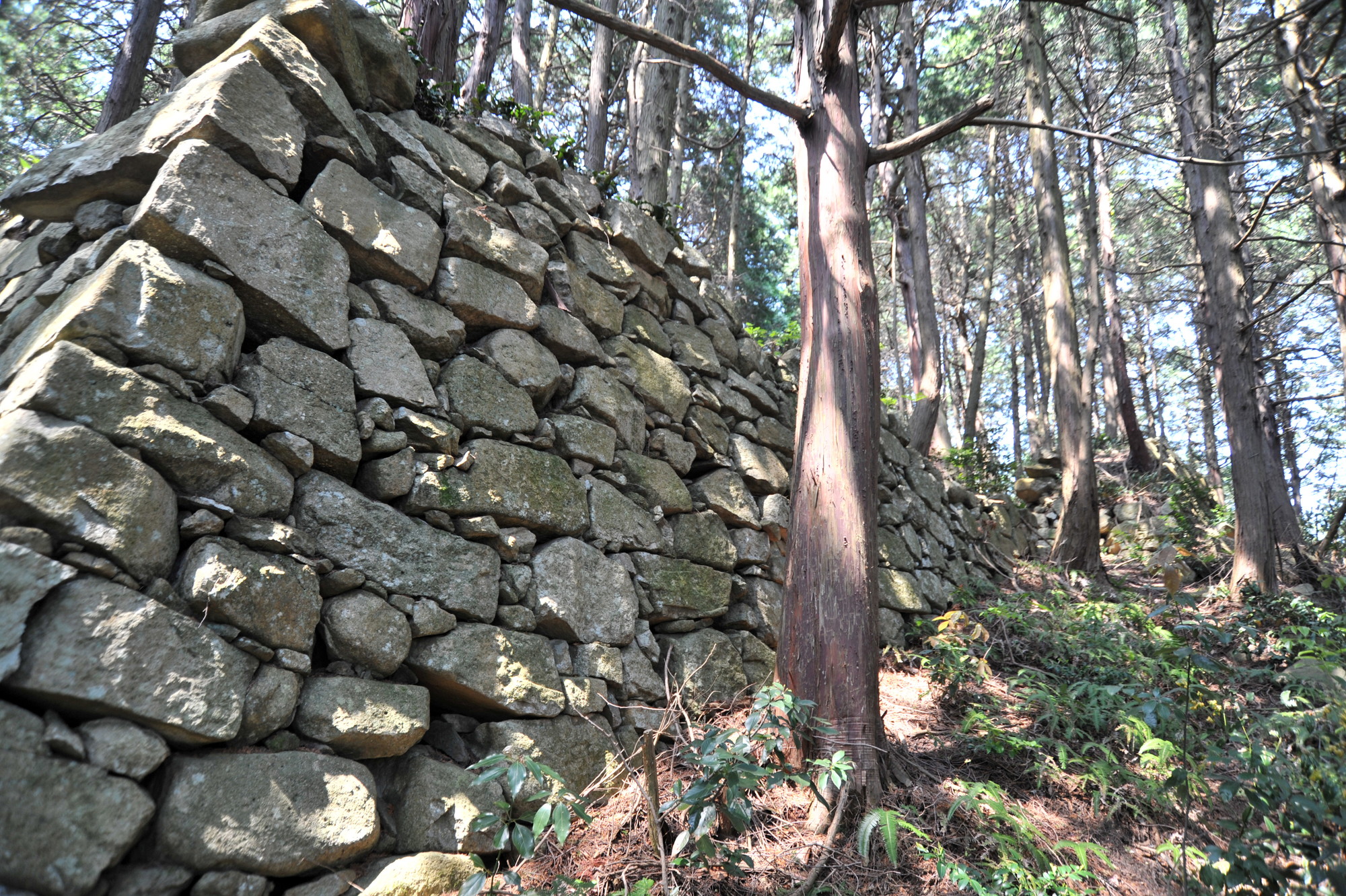 松源院の関係者用駐車場あたりから中堀跡に沿って山腹に入るとすぐこ右手に大小の石垣が見えます。多きなものは50メートルくらいの長さがあり、高さは最大で 5メートル近くあります。またこの大きな石垣は 2カ所で継ぎ足しが行われています。この継ぎ足しが工法によるものなのか、成り行きで増設されたものなのかは不明ですが、端の石垣の角は算木積になっており反り返りもあることから、素人の目には独立した石垣に別の石垣が継ぎ足されているように見えます。