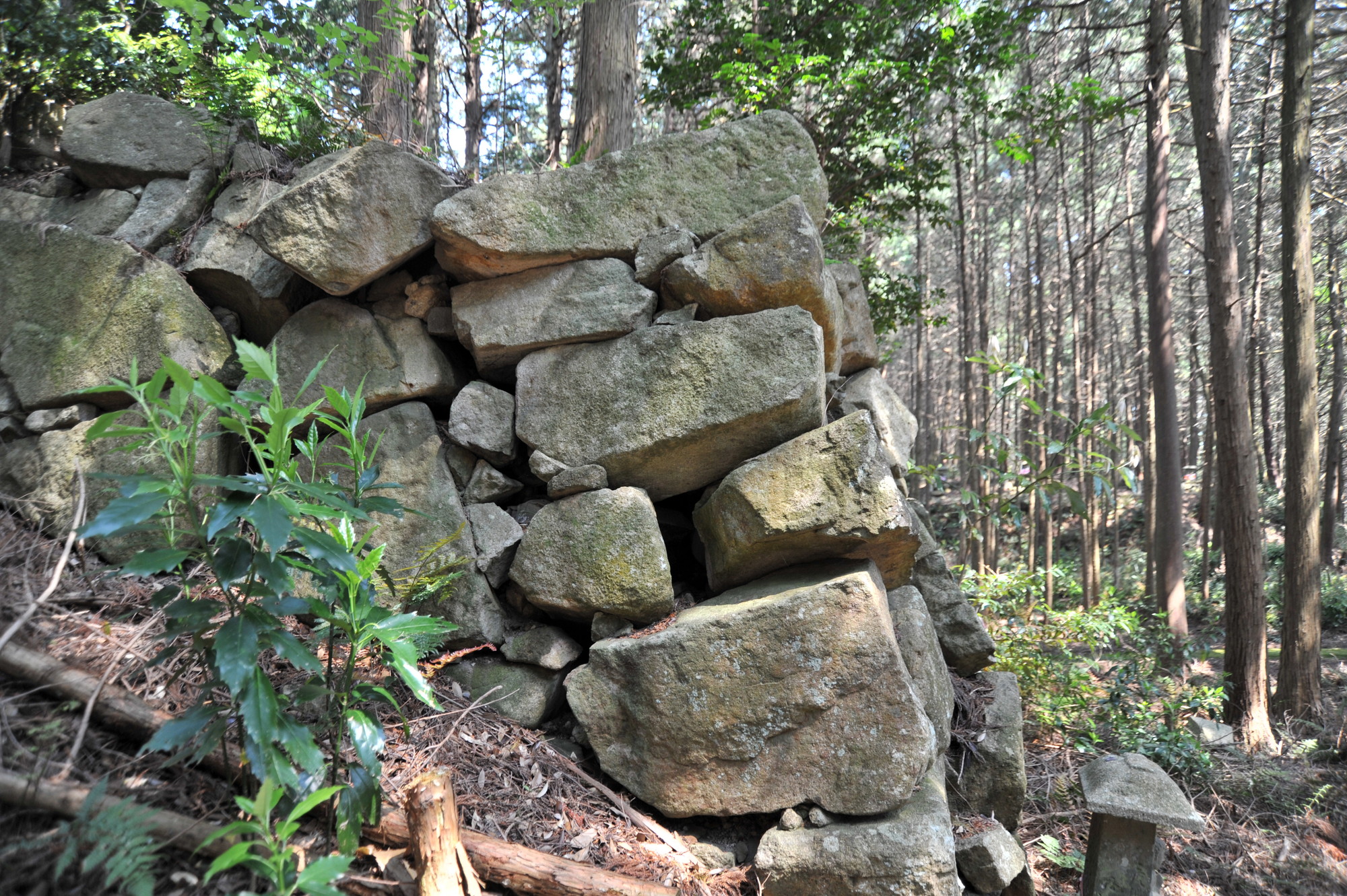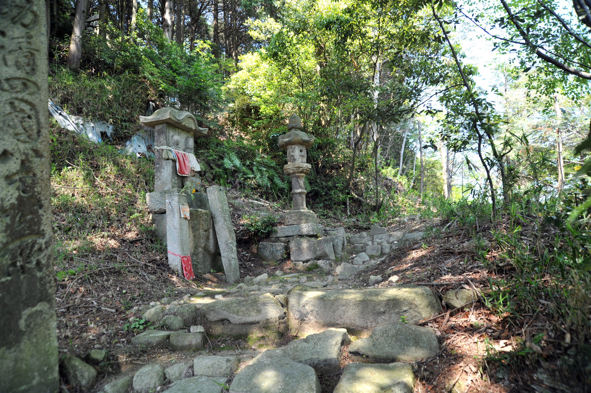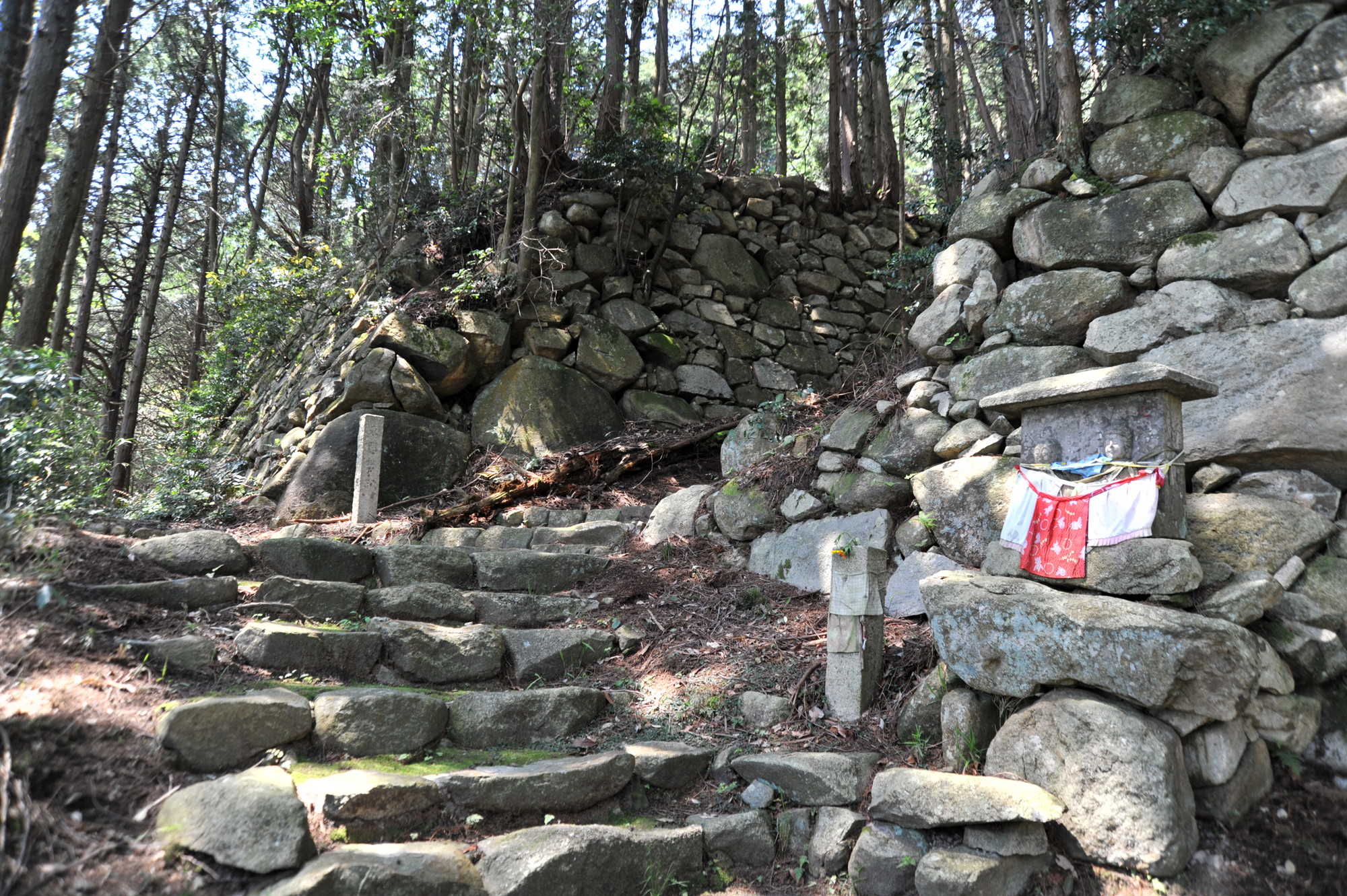 すぐその先には削平地があります。ここは御茶屋平と呼ばれる郭の跡地ですが、現在では四国八十八カ所巡りの起点を象徴するかのように、多くの石仏がピラミッドのように積み上げられれています。何とも不思議な光景です。
