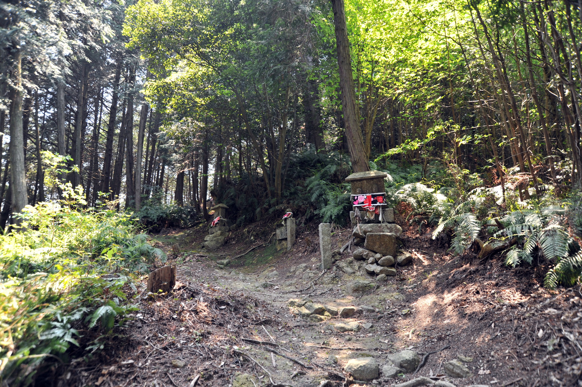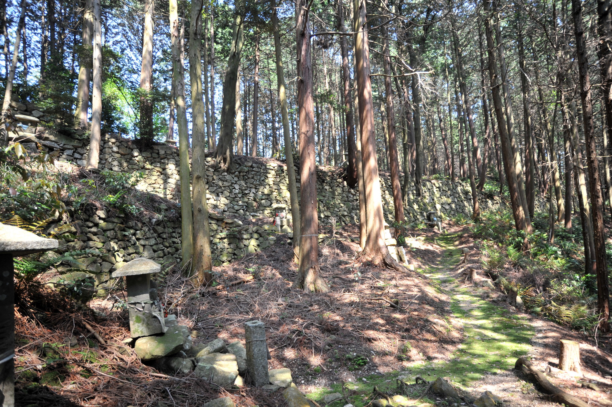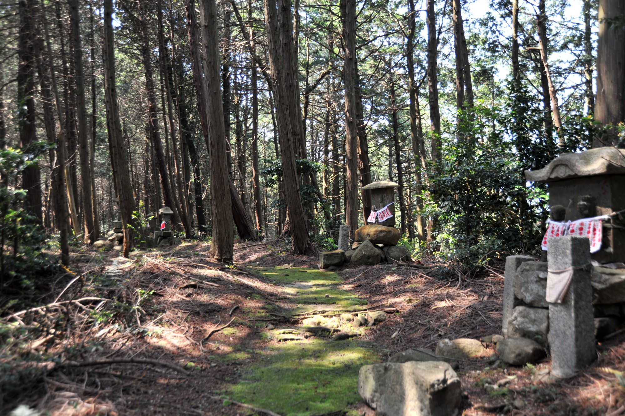 ここで尾根筋方向に向かうと、道に沿って石仏が並んでおり、最初に出会う石仏には八十七と書かれている事から、巡礼道を逆走していることが分かります。またこの道は幅もせまく、安土城の城道では無く巡礼道として造られた道のように見えます。