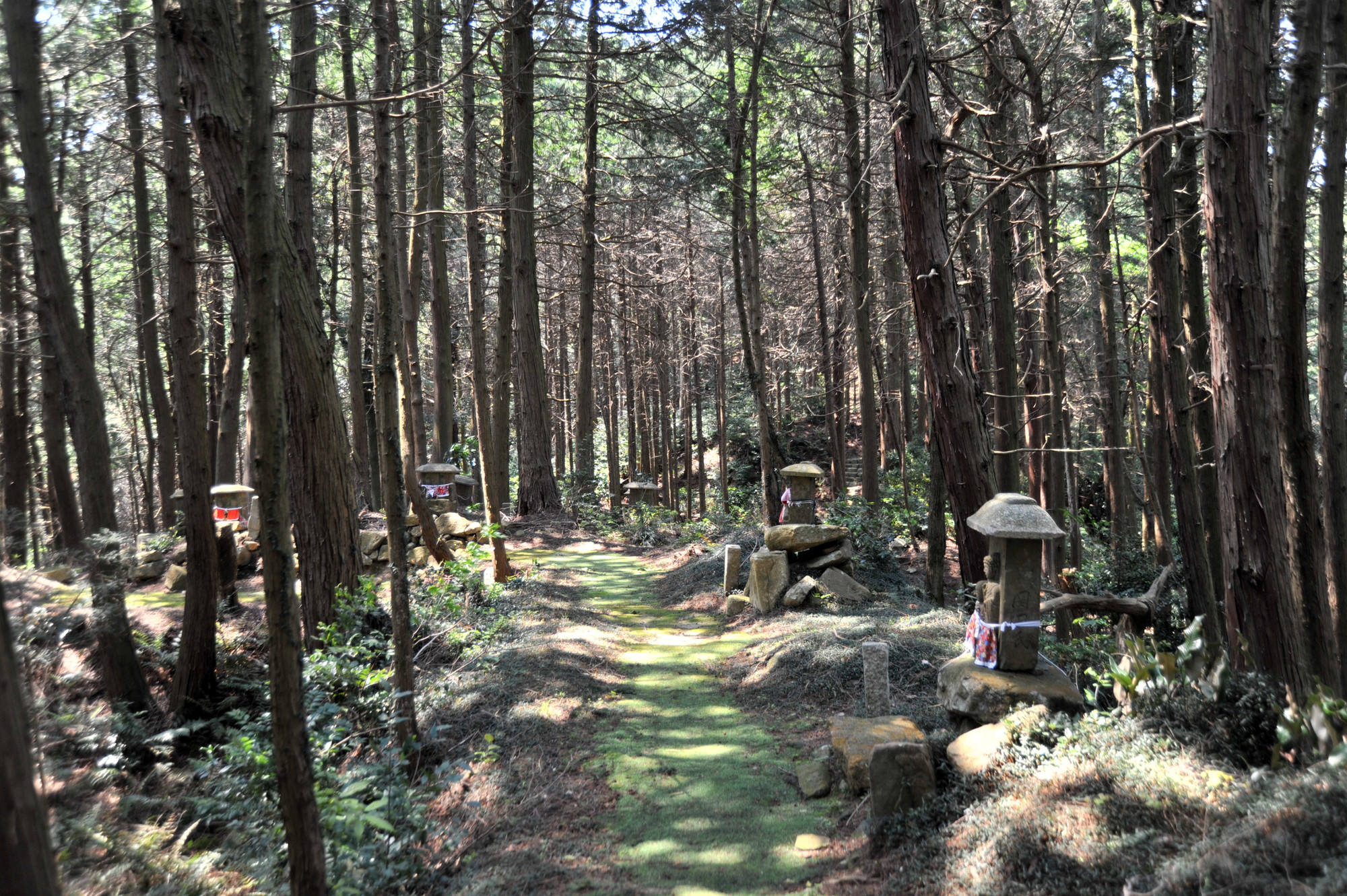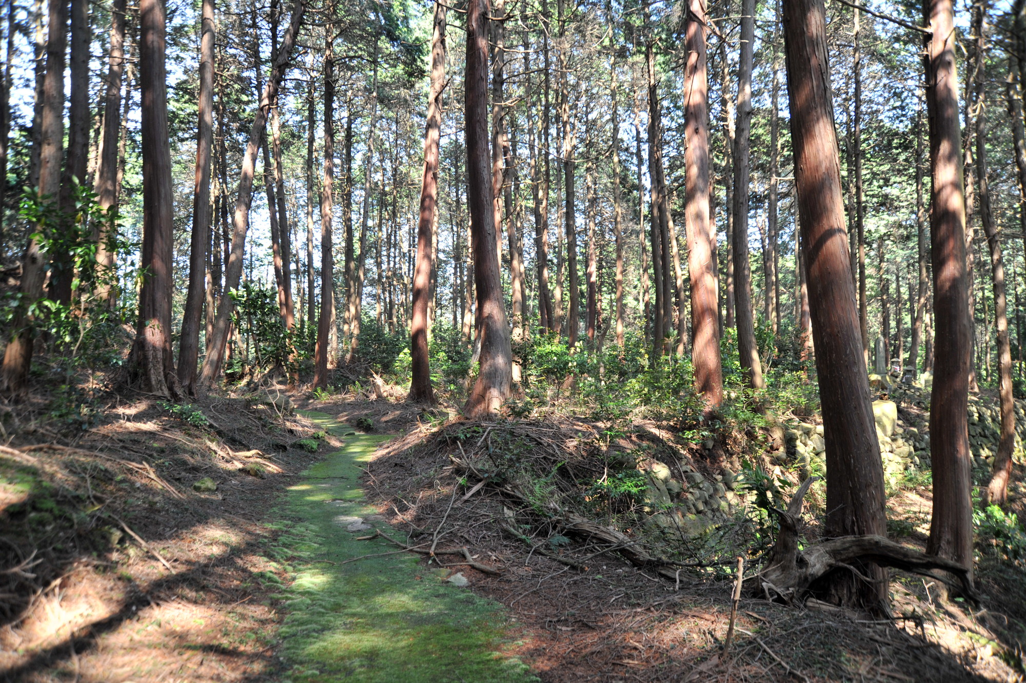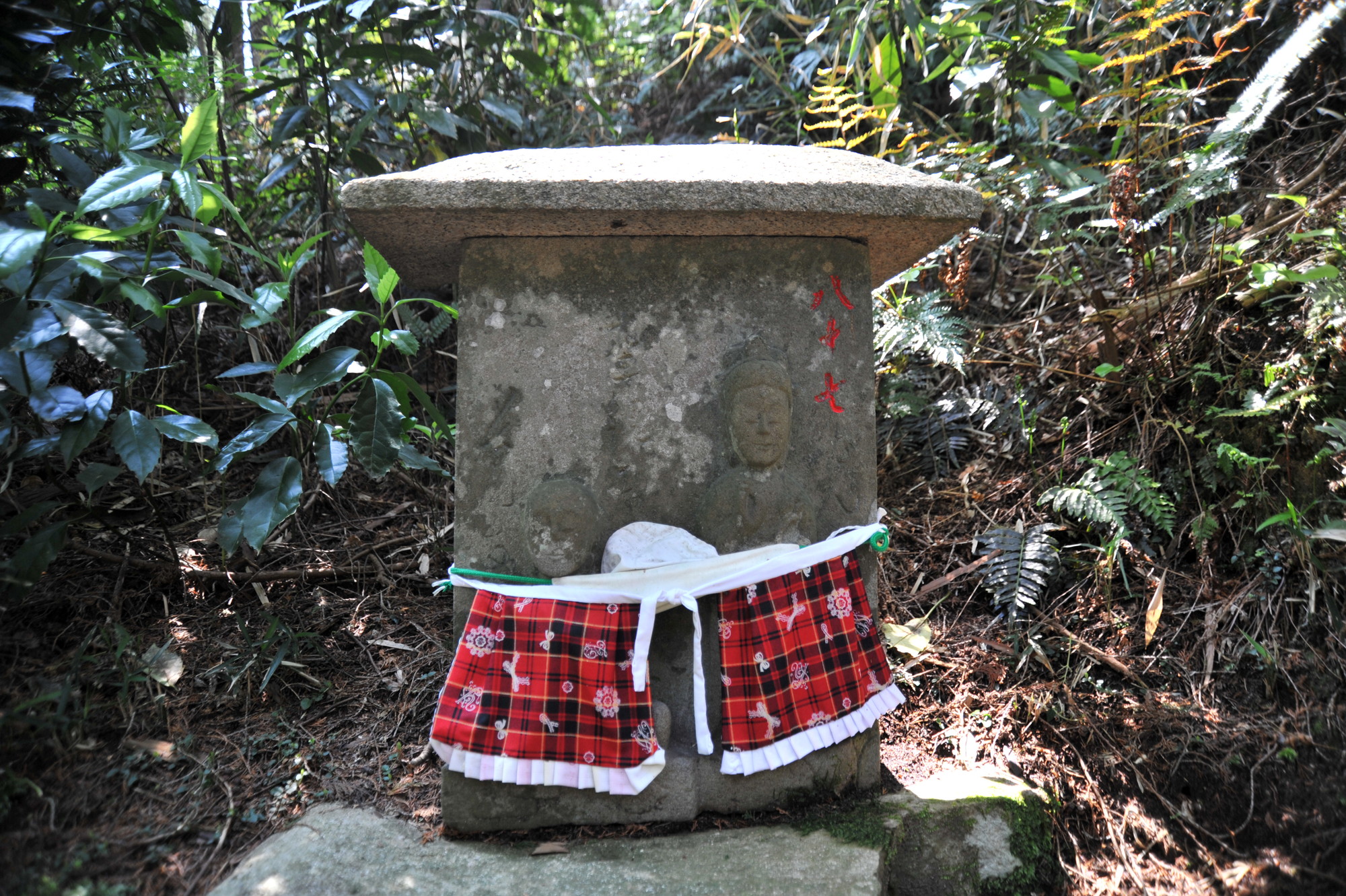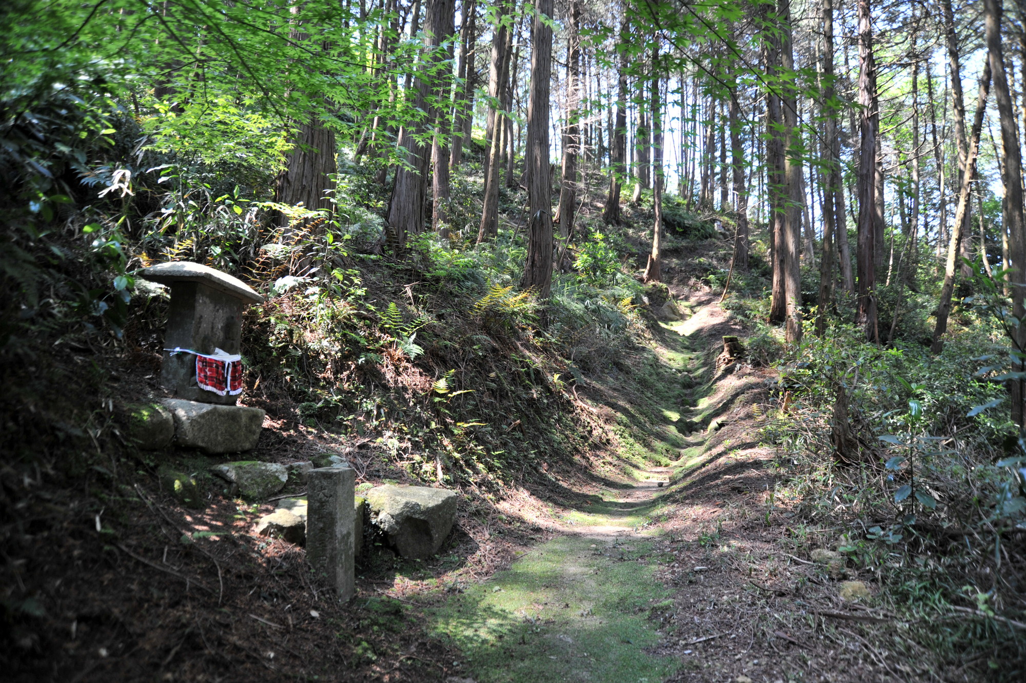 ここで尾根筋方向に向かうと、道に沿って石仏が並んでおり、最初に出会う石仏には八十七と書かれている事から、巡礼道を逆走していることが分かります。またこの道は幅もせまく、安土城の城道では無く巡礼道として造られた道のように見えます。
