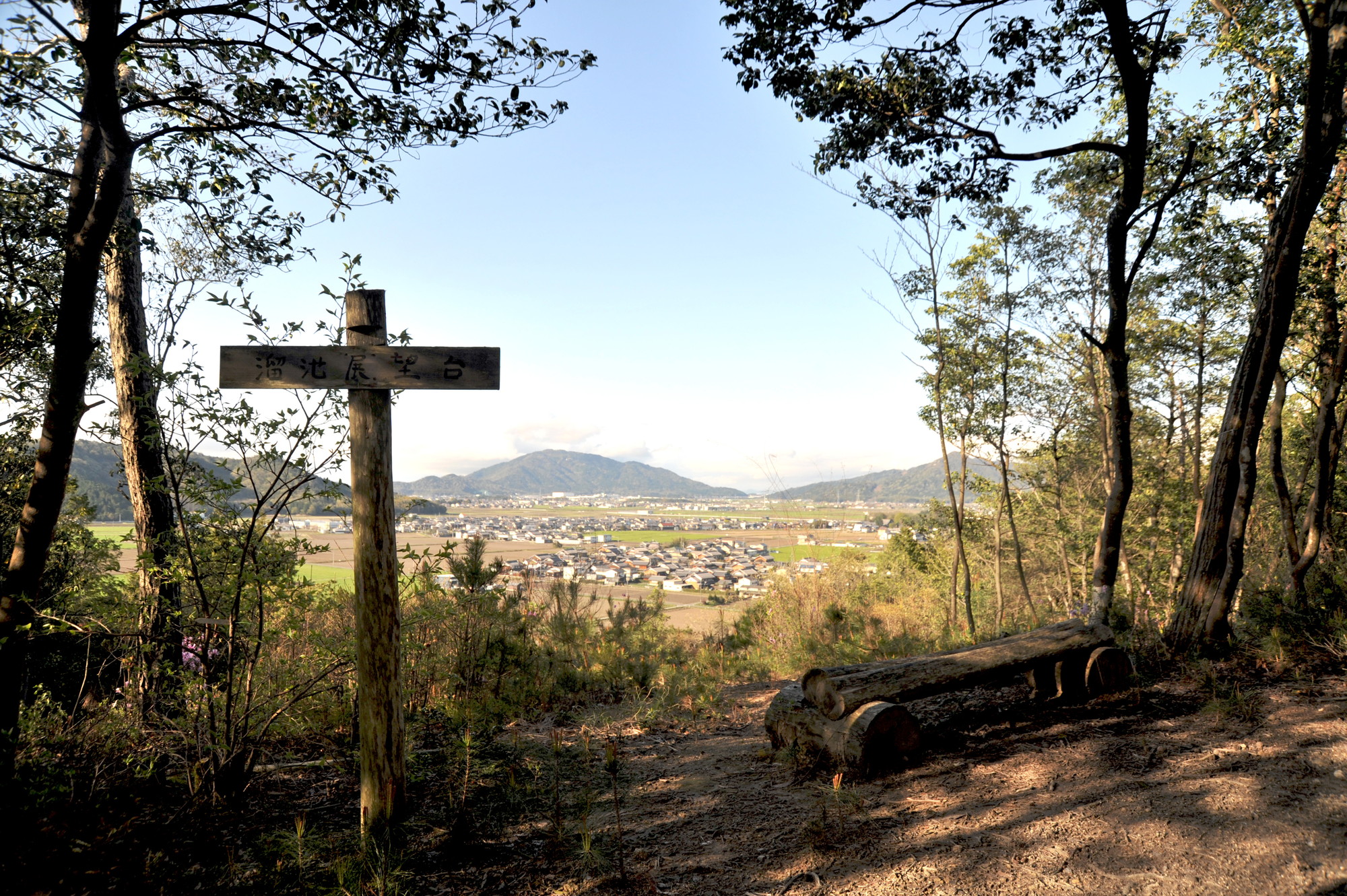 このあたりの尾根筋には大きな高低差はありません。このなだらかなアップダウンのある道をさらに 5分ほど進むと “溜池展望台” があります。この付近の山中に溜池があった訳ではなくこの下の山裾に溜池があったので、”溜池” という名前が付いています。