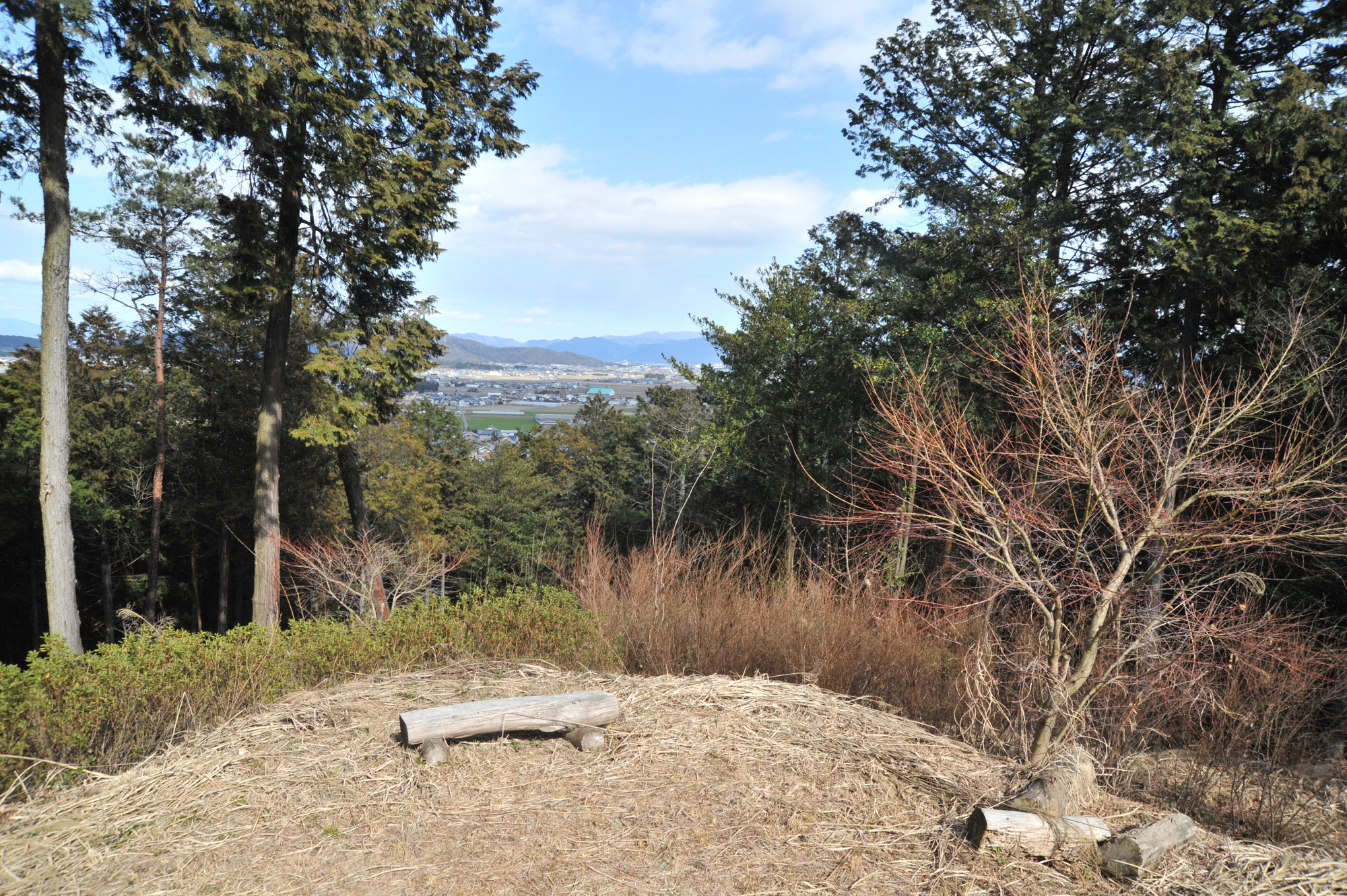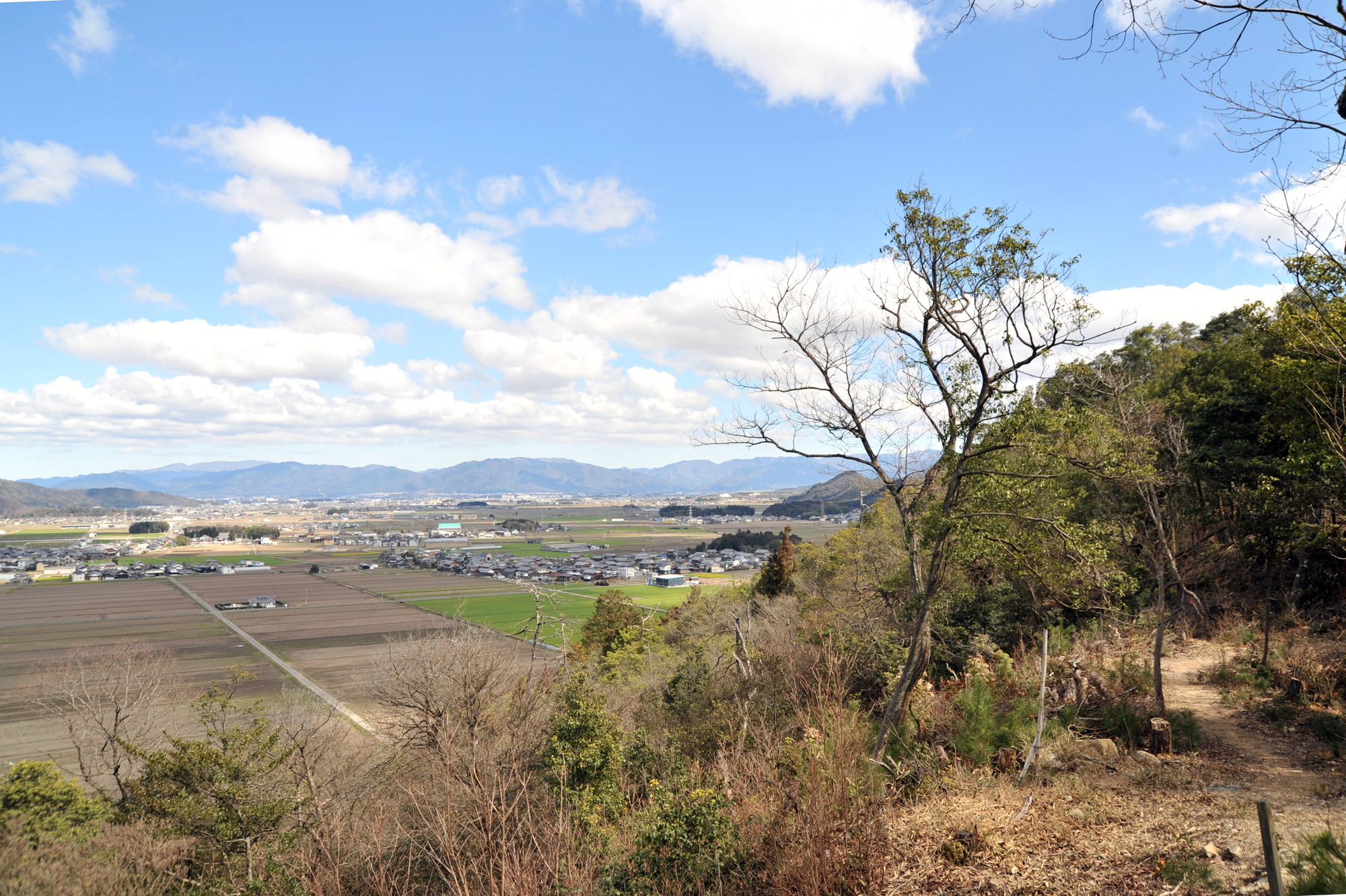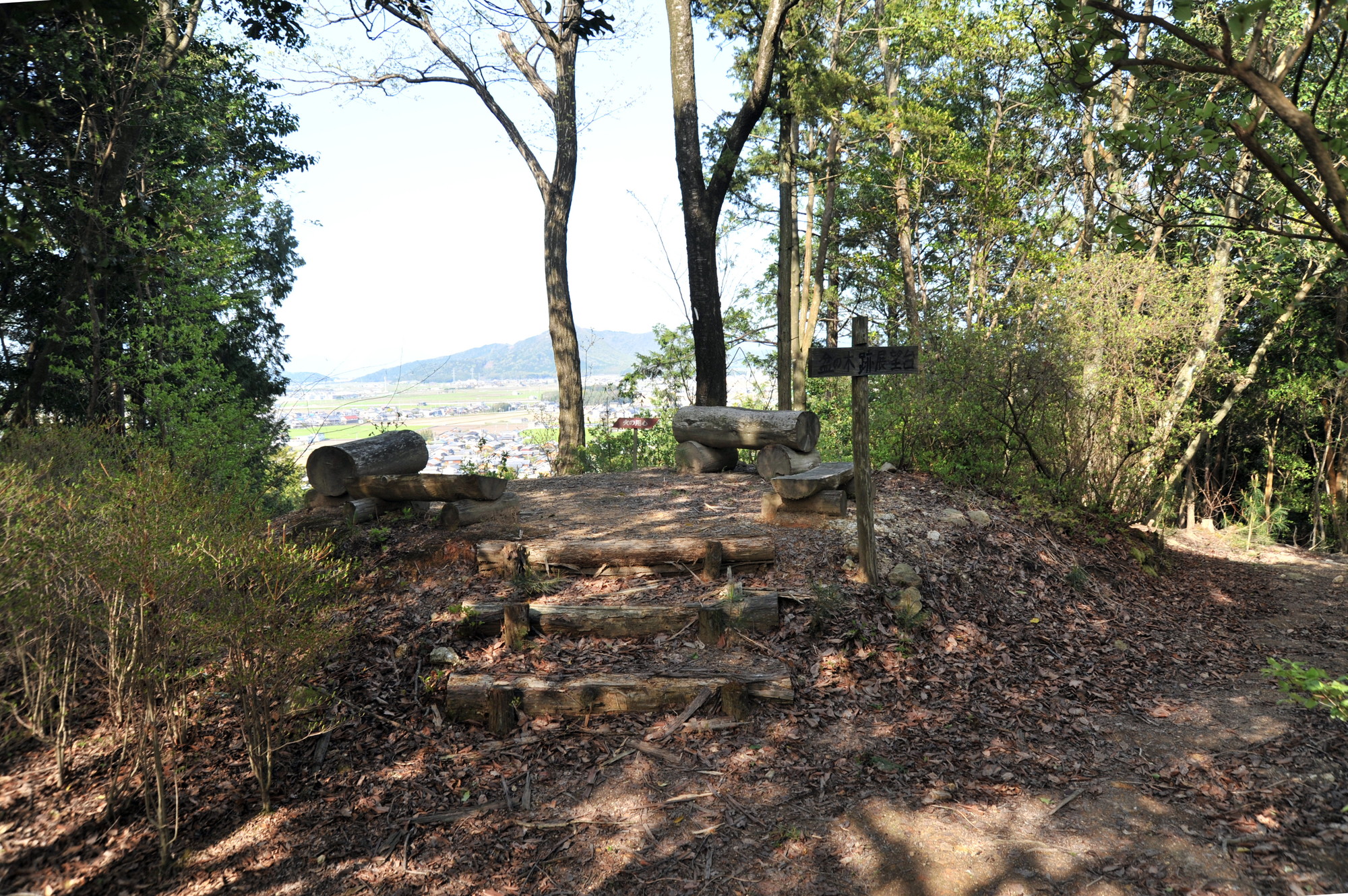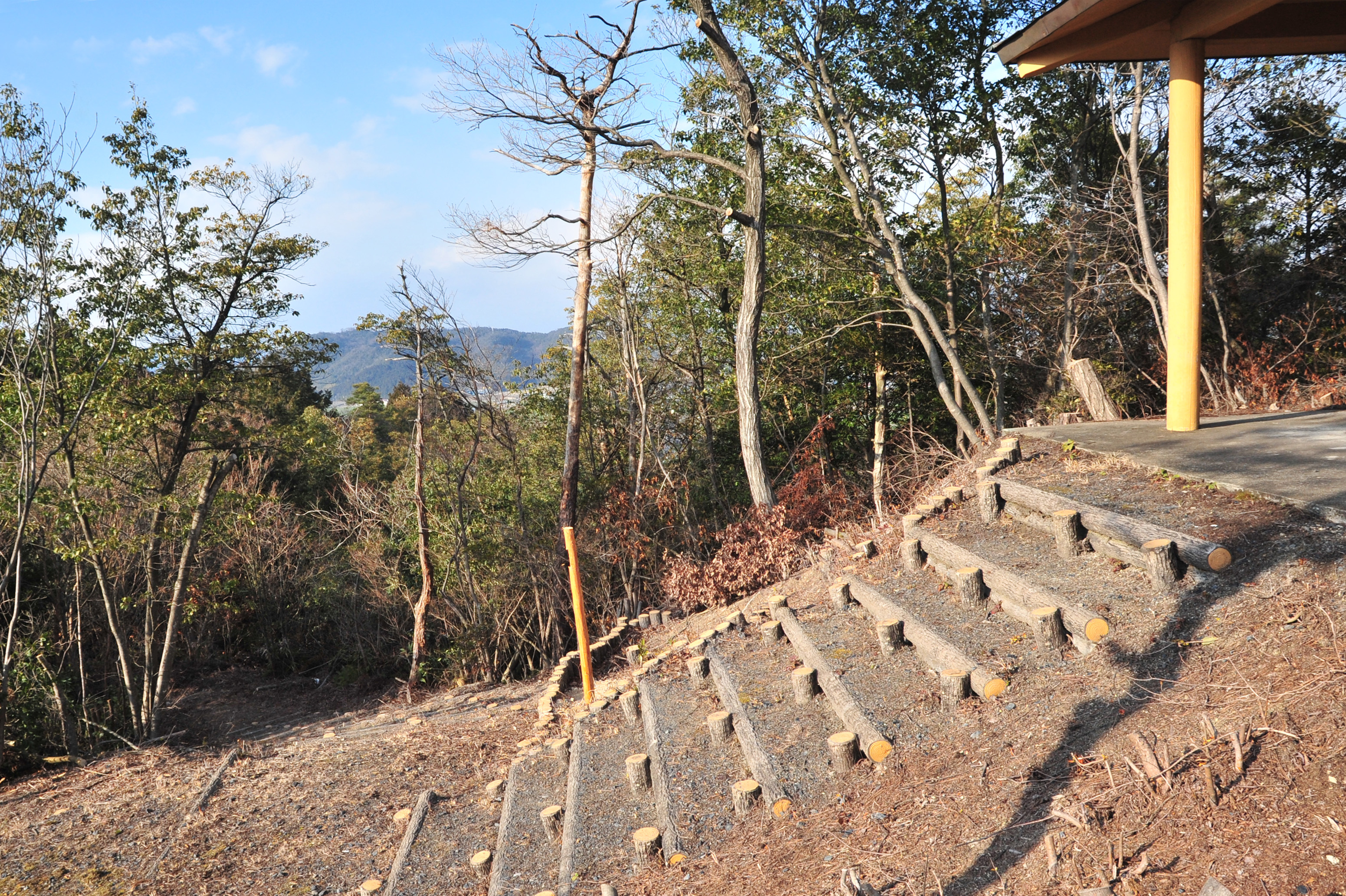 雪野山古墳から尾根筋を北西部に歩いてくると、中羽田付近で女坂に出ます。この女坂を下ると多聞院がありますがここを下らず女坂を渡り、階段が設置された向かいの尾根道を登ります。すこし急ですが、すぐにあずま屋に辿りつきます。ここからは、竜王町方面が良く見えます。