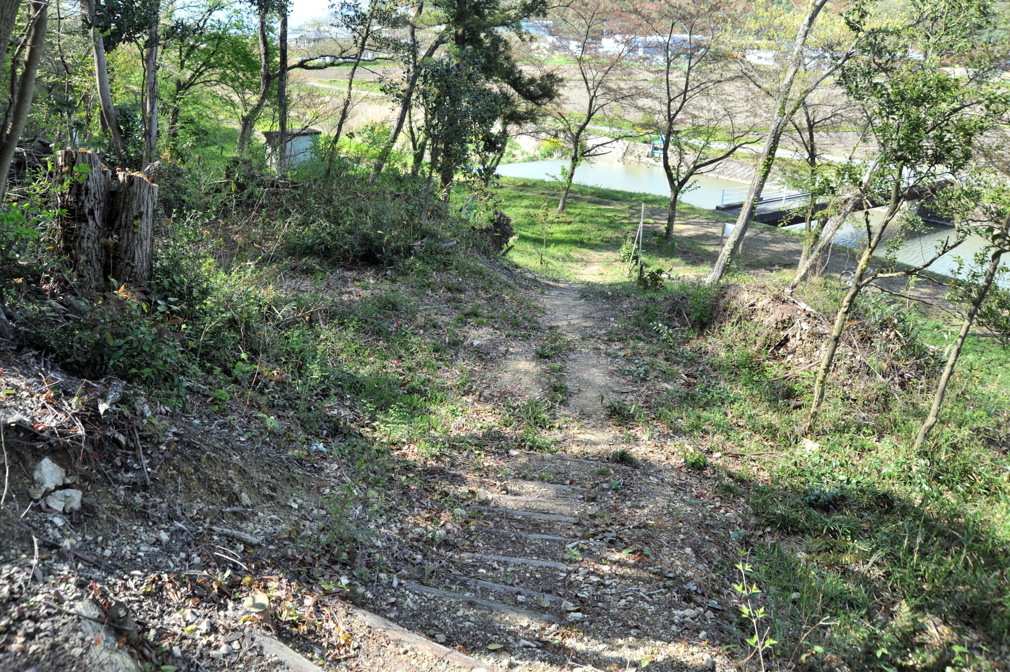 この先、あずま屋の手前を左(北西)に折れ少し下ります。このあたりの展望はイマイチですが道は散策道として整備されており普通に歩けます。2-3 分歩くと左手に階段の付いた下り道が見えます。この道を下りると天神社の参道に出ます。さらにこの先もう一本下り道があり、こちらは天神社の境内にでます。