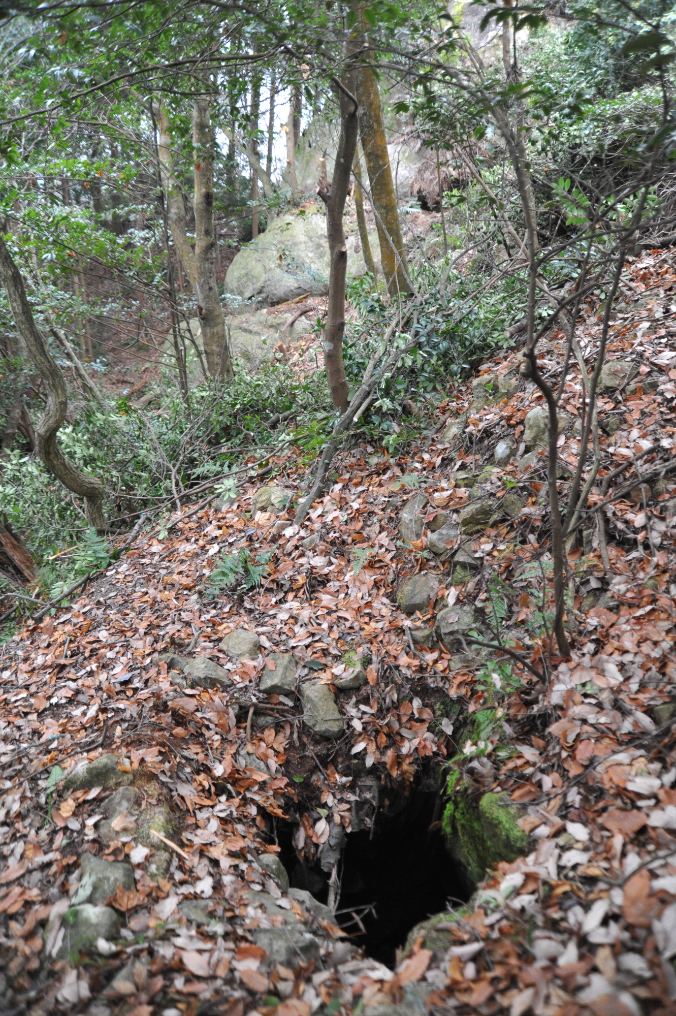 岩の手前に古墳の入り口のような竪穴があり、1m ほど先で山頂方向に折れ曲がっています。ここは瓶割り山の真向いであり、古墳の石室が隠し場所としてちょうど良かったかも知れません。