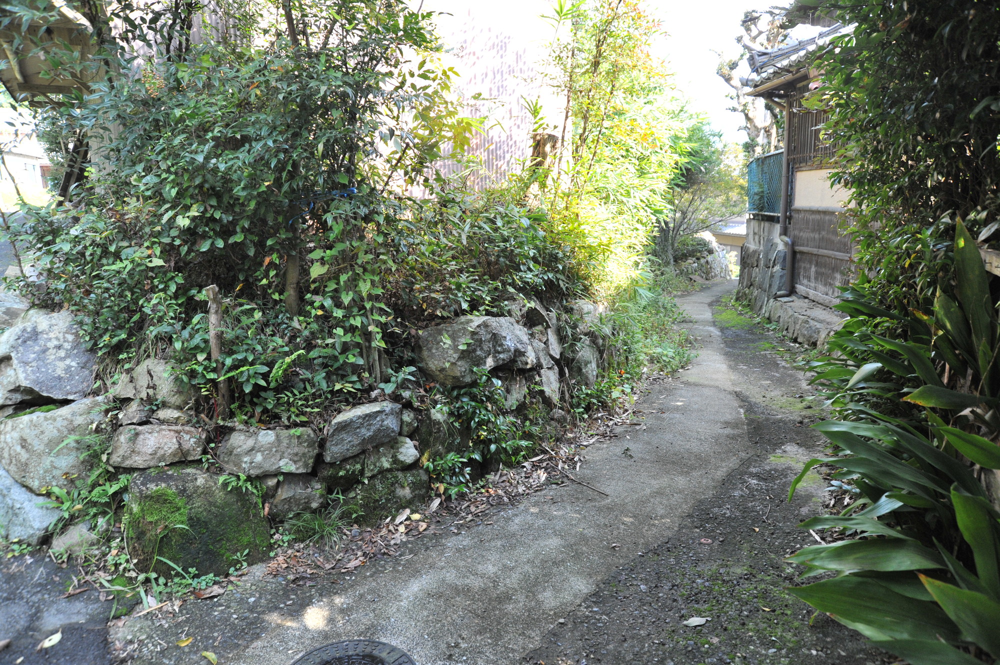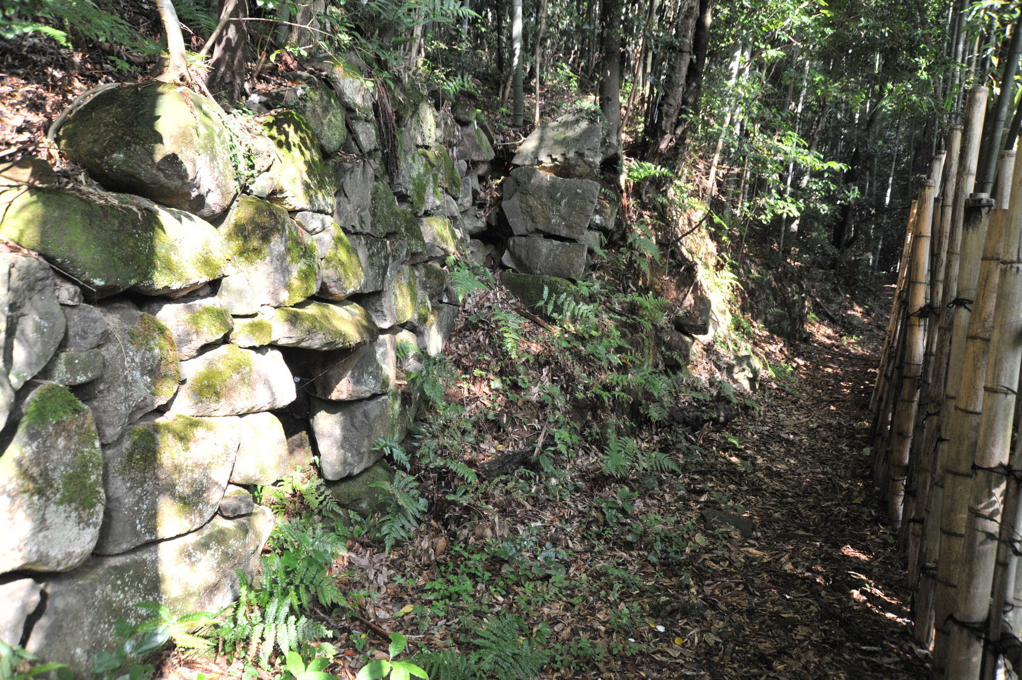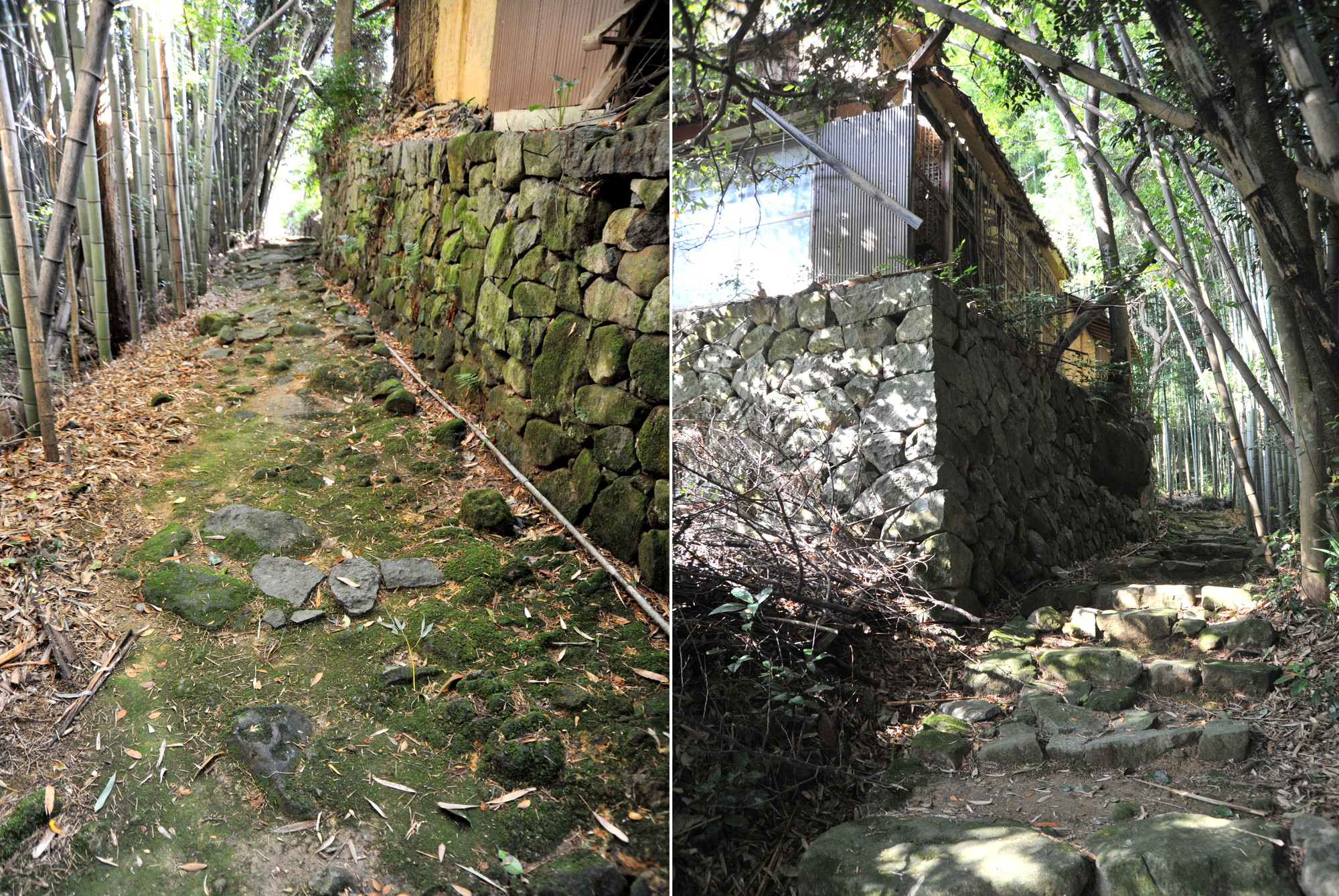 道沿いには屋敷跡の石垣が続く。道の周りは竹林で、雑木が混生しているところも多い。