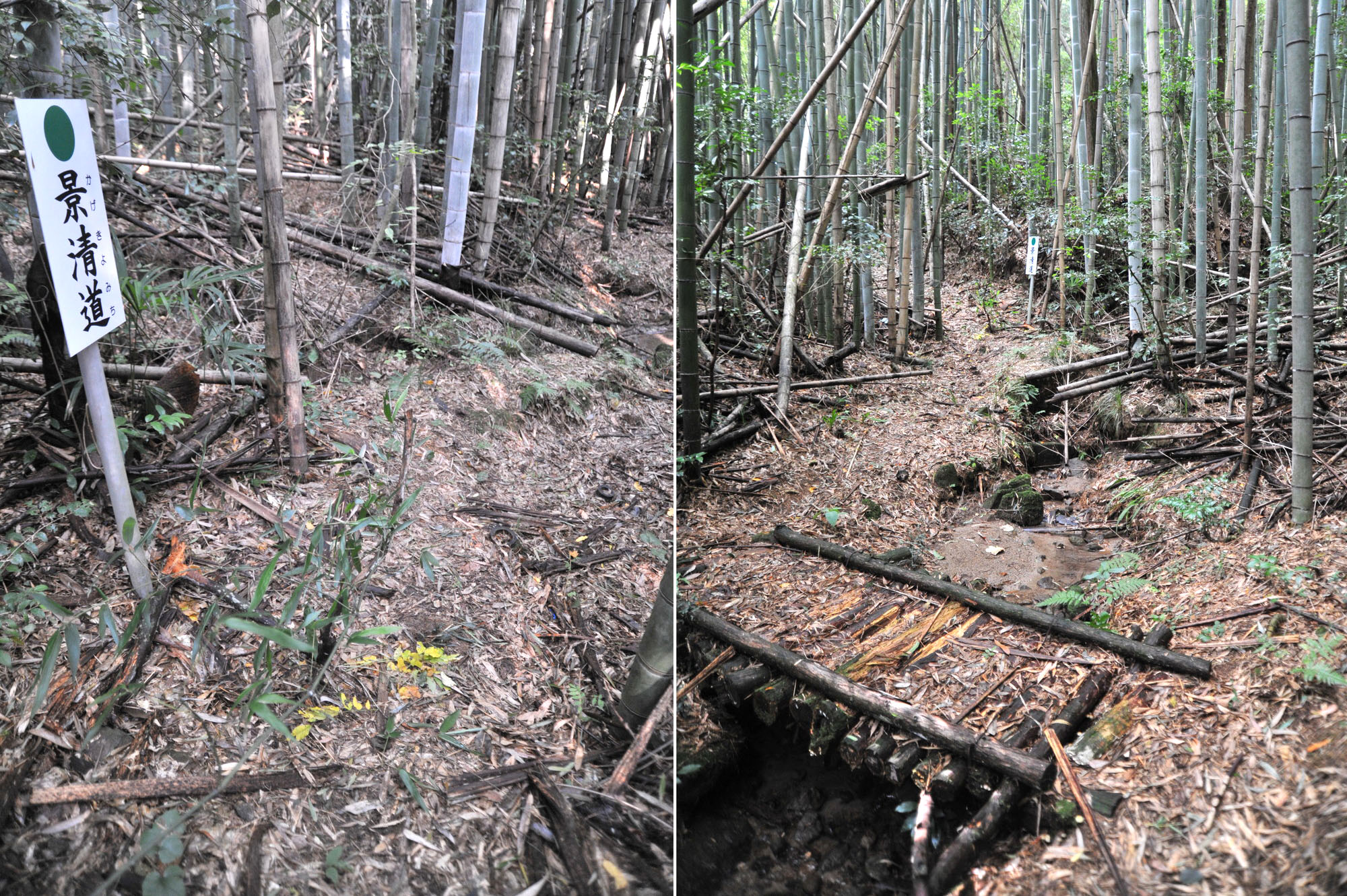 同じような道がしばらく続く。道の山側には石垣が続いているが崩れているところが多い。周囲は竹薮。雑木が混生しているところも多い。