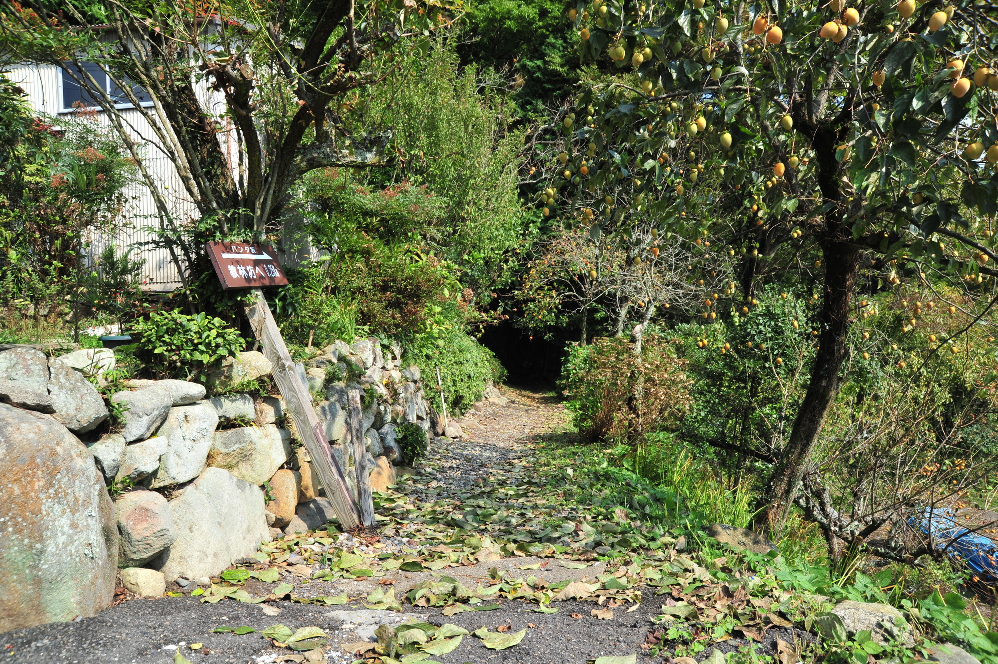 石段のある左側の平地は墓地になっている。景清道はこの先、観音谷、源三谷方向に延びている。