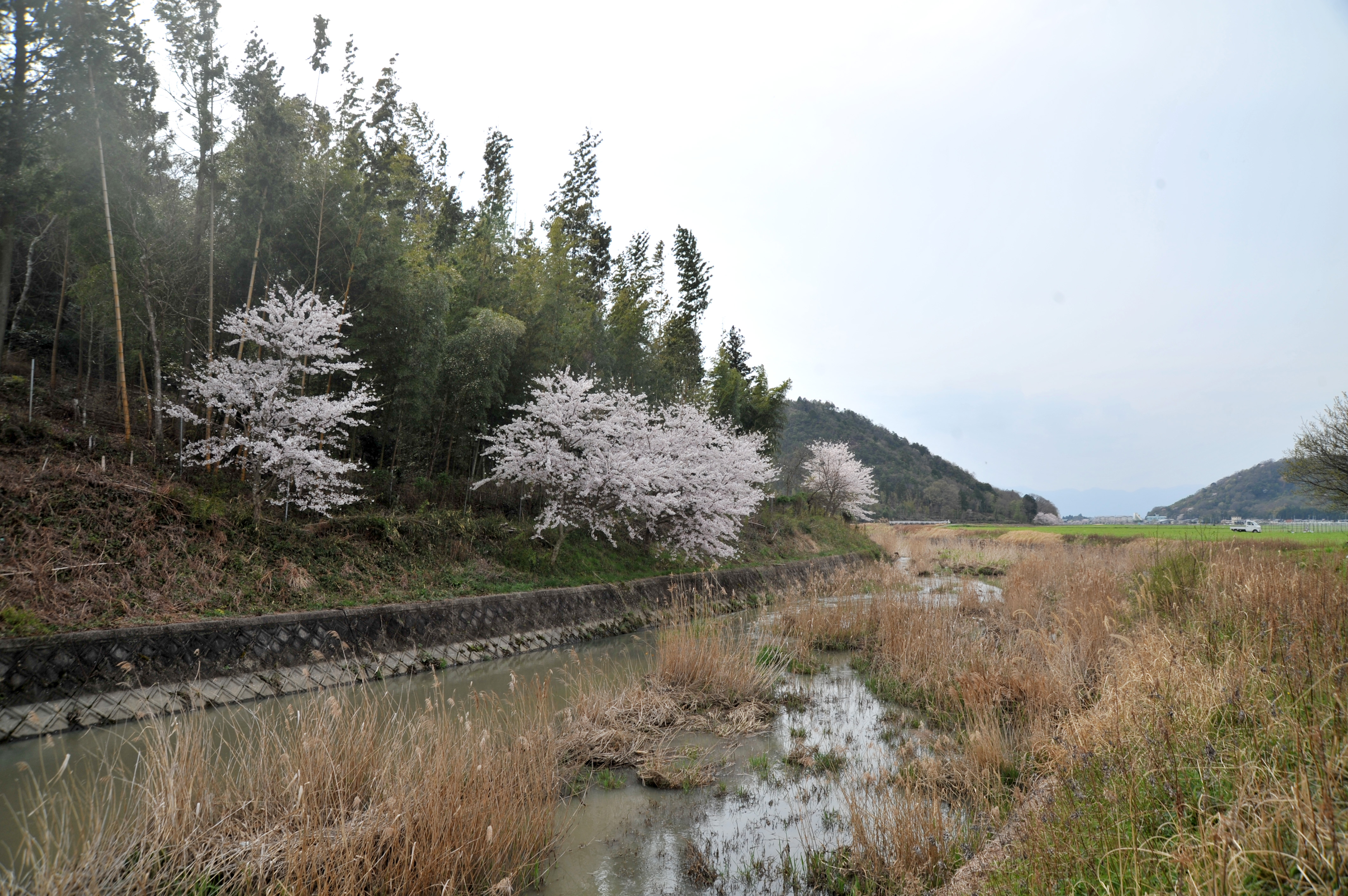 川がある山裾の風景は穏やかで心を癒すものがあります。川と山裾側には多くの桜が植えられており、4月上旬には満開の桜が楽しめます。