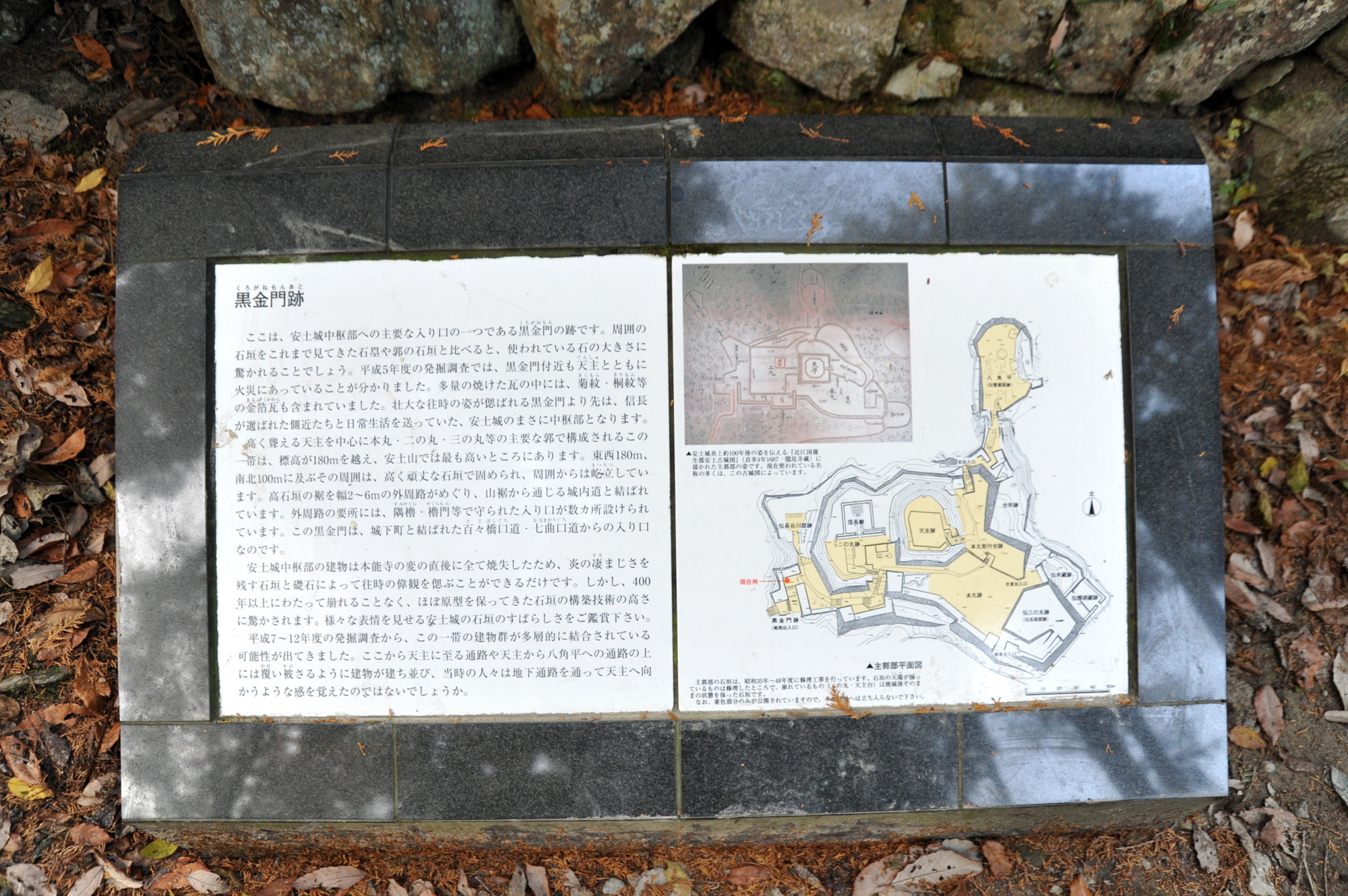 ここは、安土城中枢部への主要な入り口の一つである黒金門の跡です。周囲の石垣をこれまで見てきた石塁や郭の石垣と比べると、使われている石の大きさに驚かれることでしよう。平成 5年度の発掘調査では、黒金門付近も天主とともに火災にあっていることが分かりました。多量の焼けた瓦の中には、菊紋・桐紋等の金箱瓦も含まれていました。壮大な往時の姿が偲ばれる黒金門より先は、信長が選ばれた側近たちと日常生活を送っていた、安土城のまさに中枢部となります。高く聳える天主を中心に本丸・二の丸・三の丸等の主要な郭で構成されるこの 一帯は、標高が180mを越え、安土山では最も高いところにあります。東西180m、南北100mに及ぶその周囲は、高く頑丈な石垣で固められ、周囲からは屹立しています。高石垣の裾を幅2〜6mの外周路がめぐり、山裾から通じる城内道と結ばれています。外周路の要所には、隅櫓・楕門等で守られた入り口が数カ所設けられています。この黒金門は、城下町と結ばれた百々橋口道・七曲口道からの入り口なのです。 安土城中枢部の建物は本能寺の変の直後に全て焼失したため、炎の凄まじさを残す石垣と礎石によって往時の偉観を偲ぶことができるだけです。しかし、400年以上にわたって崩れることなく、ほぼ原型を保ってきた石垣の構築技術の高さに驚かされます。様々な表情を見せる安土城の石垣のすばらしさをご鑑賞下さい。 平成7〜12年度の発掘調査から、この一帯の建物群が多層的に結合されている可能性が出てきました。ここから天主に至る通路や天主から八角平への通路の上には覆い被さるように建物が建ち並び、当時の人々は地下通路を通って天主へ向かうような感を覚えたのではないでしょうか。