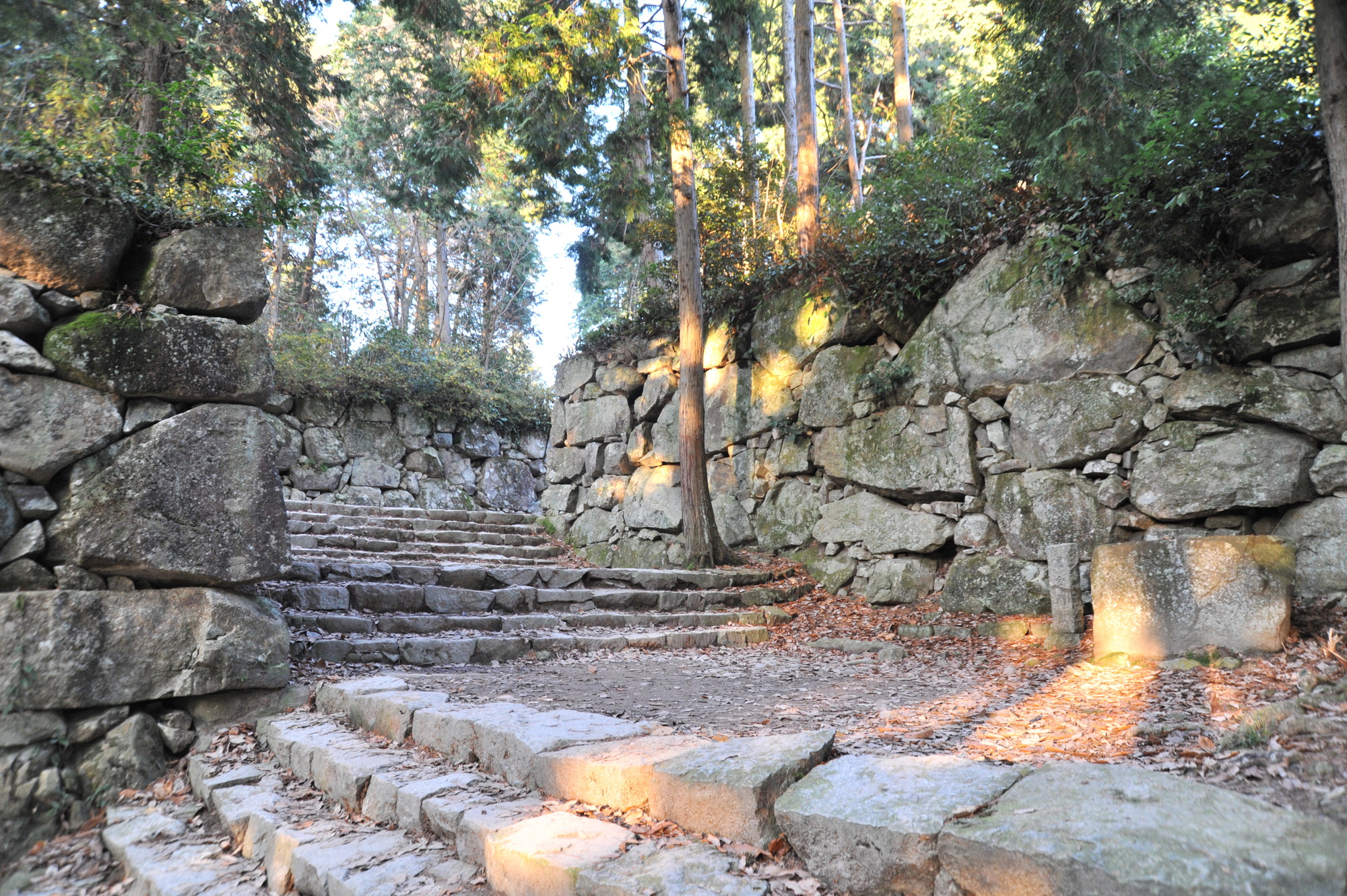 楕門の内側には、屋敷に通じる石 段とこれに伴う石組みの排水路があ り、水路の縁石には石仏が使用され ていました。門の前では大手道から 楕門へ入るための橋を支えたと考え られる3本の長い花岡岩製の転用石を発見しました。