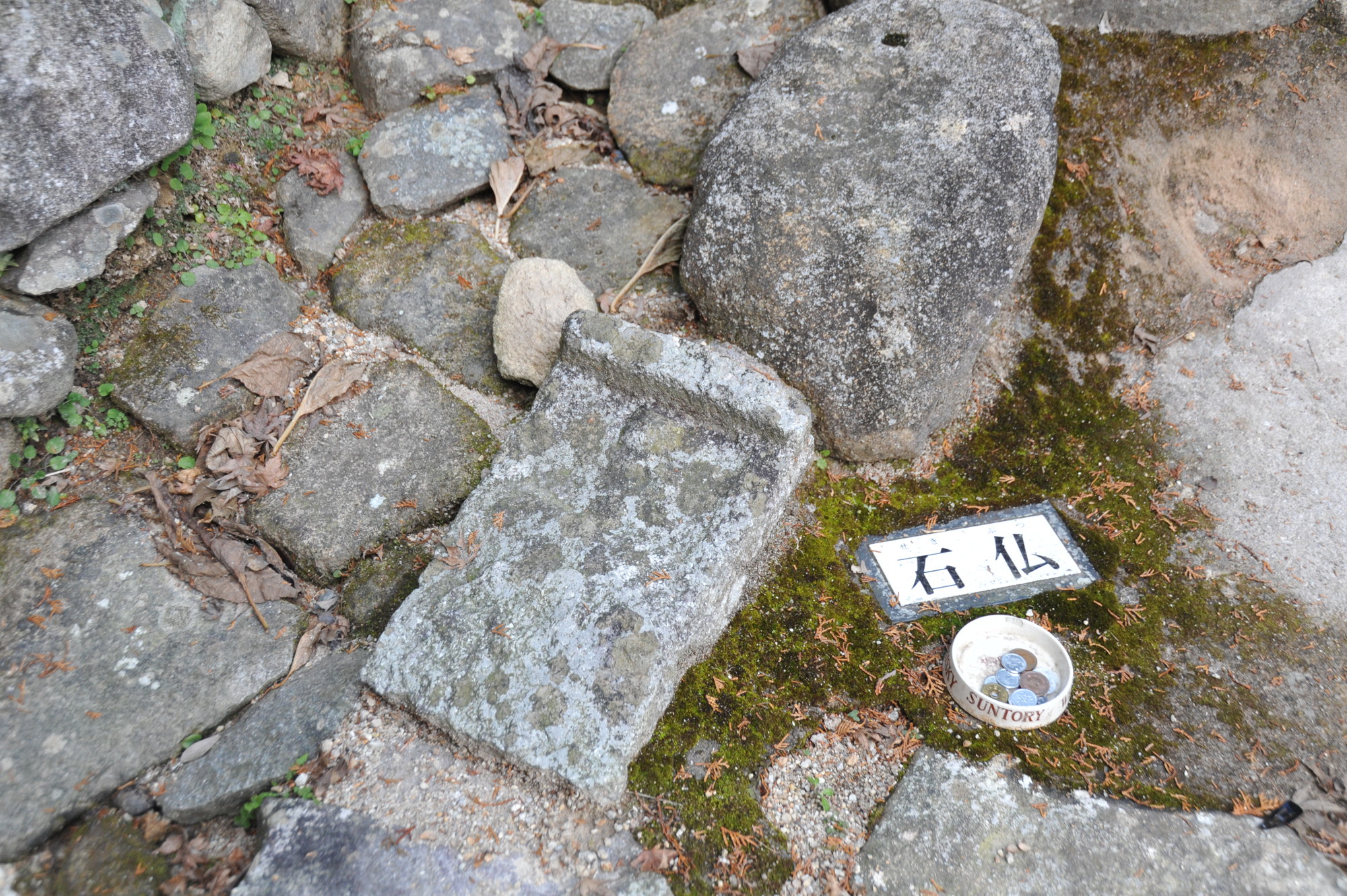 この佛足石は大手道石段などに見られる石佛と同様に築城当時単なる石材として集められ石垣に使われて居た様で昭和の初期、登山道整備工事の時この付近の崩れた石垣の中から発見されました。佛足跡は、お釈迦様の足跡を表現したもので古代インドでは仏像に先立ち崇拝の対象にされて居ました。我が国では奈良の薬師寺のものが現存する最古(奈良時代国宝級)の物とした有名ですが、此の佛足石も中性の数少ない遺物として大変貴重なものです。