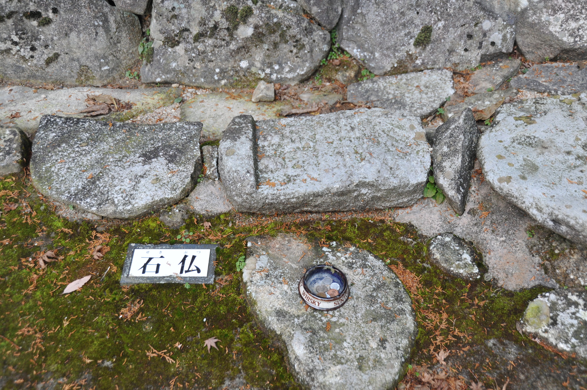 この石仏は築城の際に大手道の石材として使われたものです。城普請に使用する多くの石材は近郊の山々から採取しましたが、石仏や墓石等も含まれていました。 出土した石仏等は、本来は信仰の対象となっていたものですが、築城の経緯を示すために発見当時の状態で保存しています。趣旨をこ理解の上、見学して下さい。