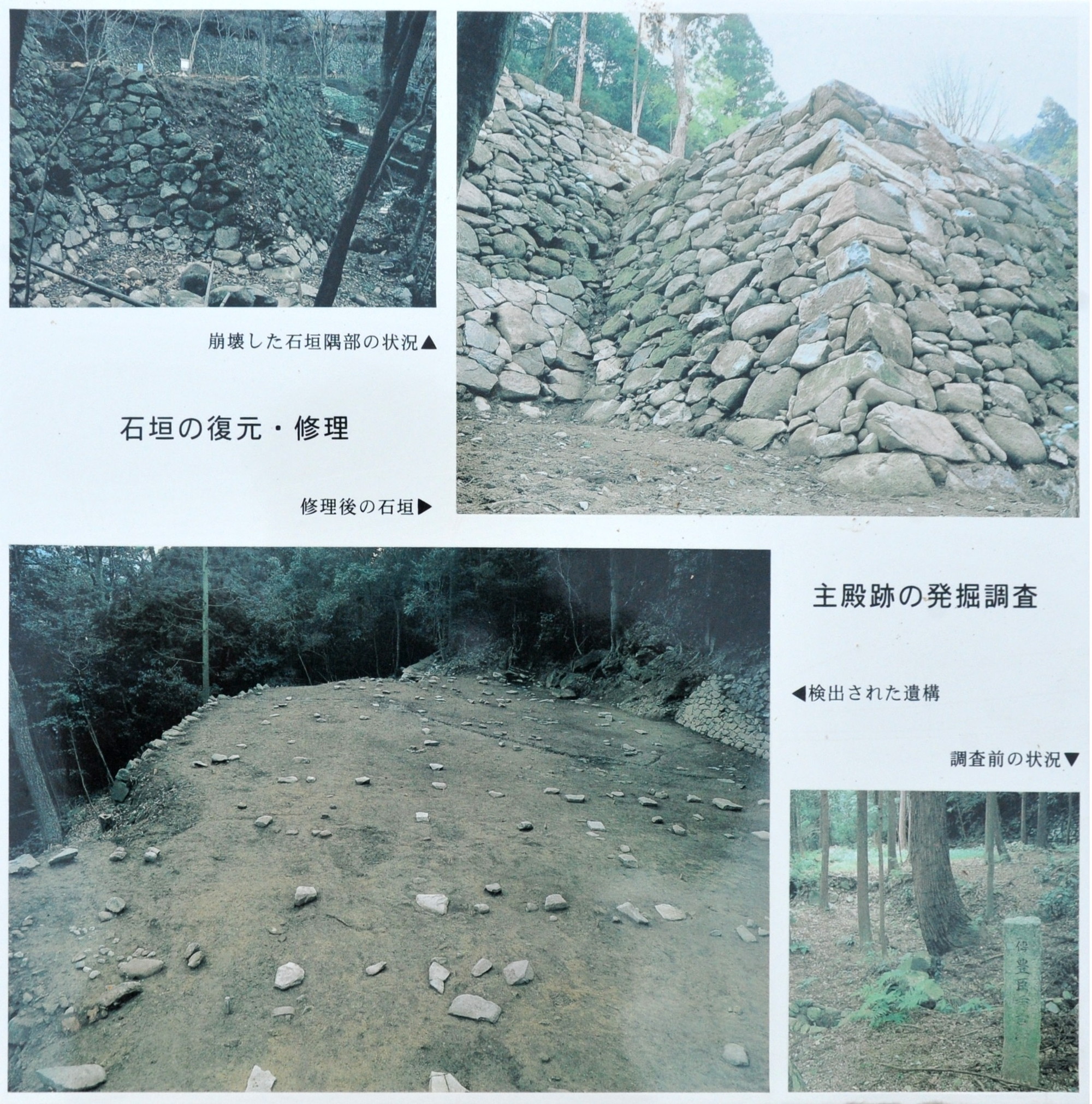 昭和15・16年(1940・41)に天主跡と本丸跡の発掘調査と整備が行われ、昭和35年? 50年(1960?1975)にわたって主郭部の石垣修理が行われました。昭和57・58年には信長400回忌にあわせて城跡南面の平面整備が行われています。そして、平成元年度(1989)から安土城跡を将来にわたって永く保存し、広く活用することを目的として『特別史跡安 土城跡調査整備事業』が20年計画で行われています。