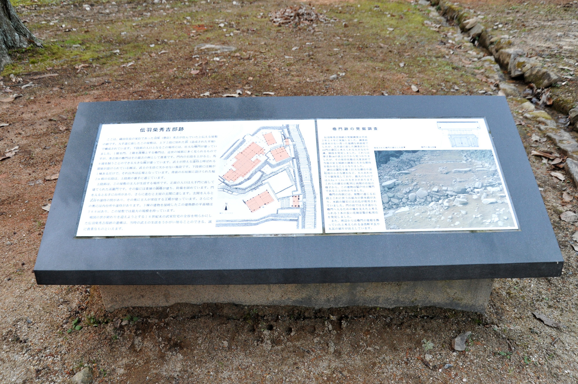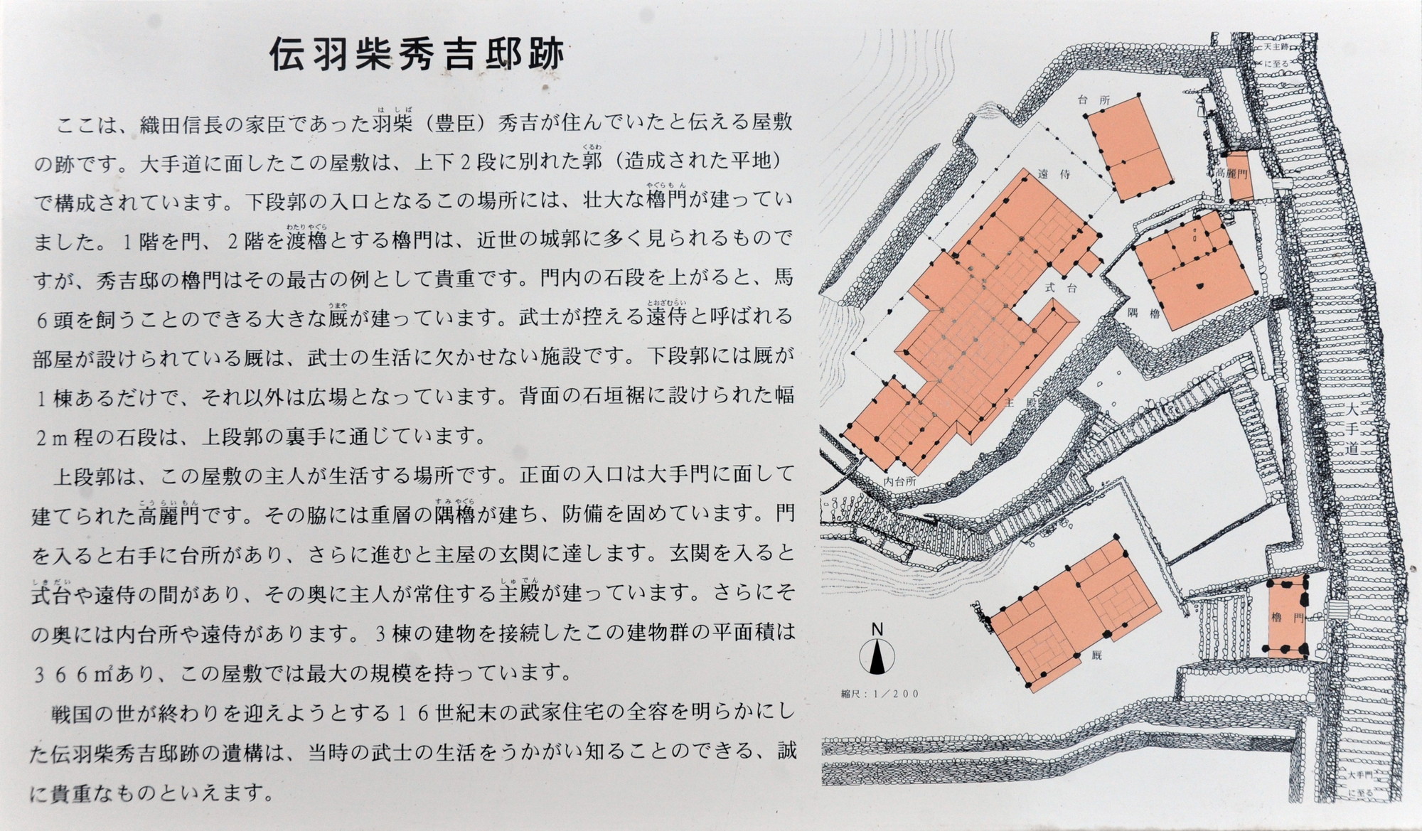 ここは、織田信長の家臣であった羽柴(豊臣)秀吉が住んでいたと伝える屋敷の跡です。大手道に面したこの屋敷は、上下2段に別れた郭(造成された平地)で構成されています。下段郭の入口となるこの場所には、壮大な櫓門が建っていました。1階を門、2階を渡櫓とする櫓門は、近世の城郭に多く見られるもので すが、秀吉邸の櫓門はその最古の例として貴重です。門内の石段を上がると、馬6頭を飼うことのできる大きな厩が建っています。武士が控える遠侍と呼ばれる 部屋が設けられている厩は、武士の生活に欠かせない施設です。下段郭には厩が 1棟あるだけで、それ以外は広場となっています。背面の石垣裾に設けられた幅 2m程の石段は、上段郭の裏手に通じています。 上段郭は、この屋敷の主人が生活する場所です。正面の入口は大手門に面して建てられた高麗門です。その脇には重層の隅櫓が建ち、防備を固めています。門を入ると右手に台所があり、さらに進むと主屋の玄関に達します。玄関を入ると武台や遠侍の間があり、その奥に主人が常住する主殿が建っています。さらにその奥には内台所や遠侍があります。3棟の建物を接続したこの建物群の平面積は 366㎡あり、この屋敷では最大の規模を持っています。戦国の世が終わりを迎えようとする16世紀末の武家住宅の全容を明らかにした伝羽柴秀吉邸跡の遺構は、当時の武士の生活をうかがい知ることのできる、誠に貴重なものといえます。