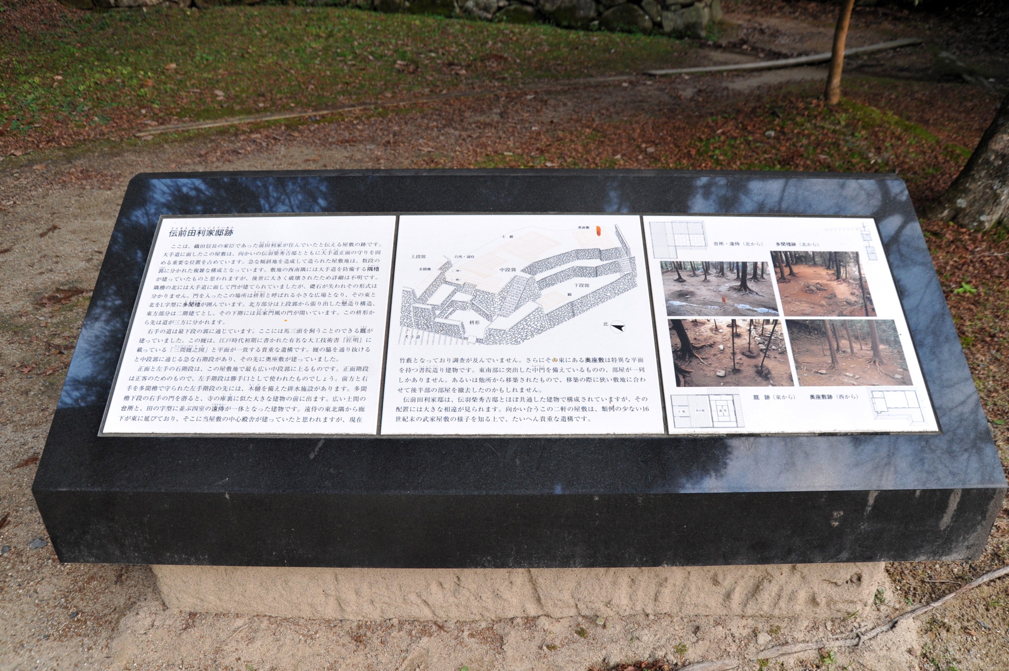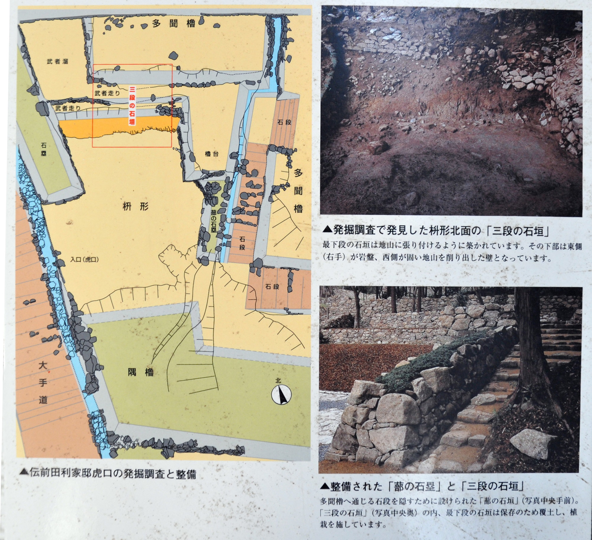 ここは、織田信長の家臣であった前田利家が住んでいたと伝える屋敷の跡です。 大手道に面したこの屋敷は、向かいの伝羽柴秀吉邸とともに大手道正面の守りを固 める重要な位置を占めています。急な傾斜地を造成して造られた屋敷地は、数段の 郭に分かれた複雑な構成となっています。敷地の西南隅には大手道を防備する隅権 が建っていたものと思われますが、後世に大きく破壊されたため詳細は不明です。 隅槽の北には大手道に面して門が建てられていましたが、礎石が失われその形式は 分かりません。門を入ったこの場所は析形と呼ばれる小さな広場となり、その東と北をL字型に多聞槽が囲んでいます。北方部分は上段郭から張り出した懸造り構造、 東方部分は二階建てとし、その下階には長家門風の門が開いています。この析形から先は道が三方に分かれます。