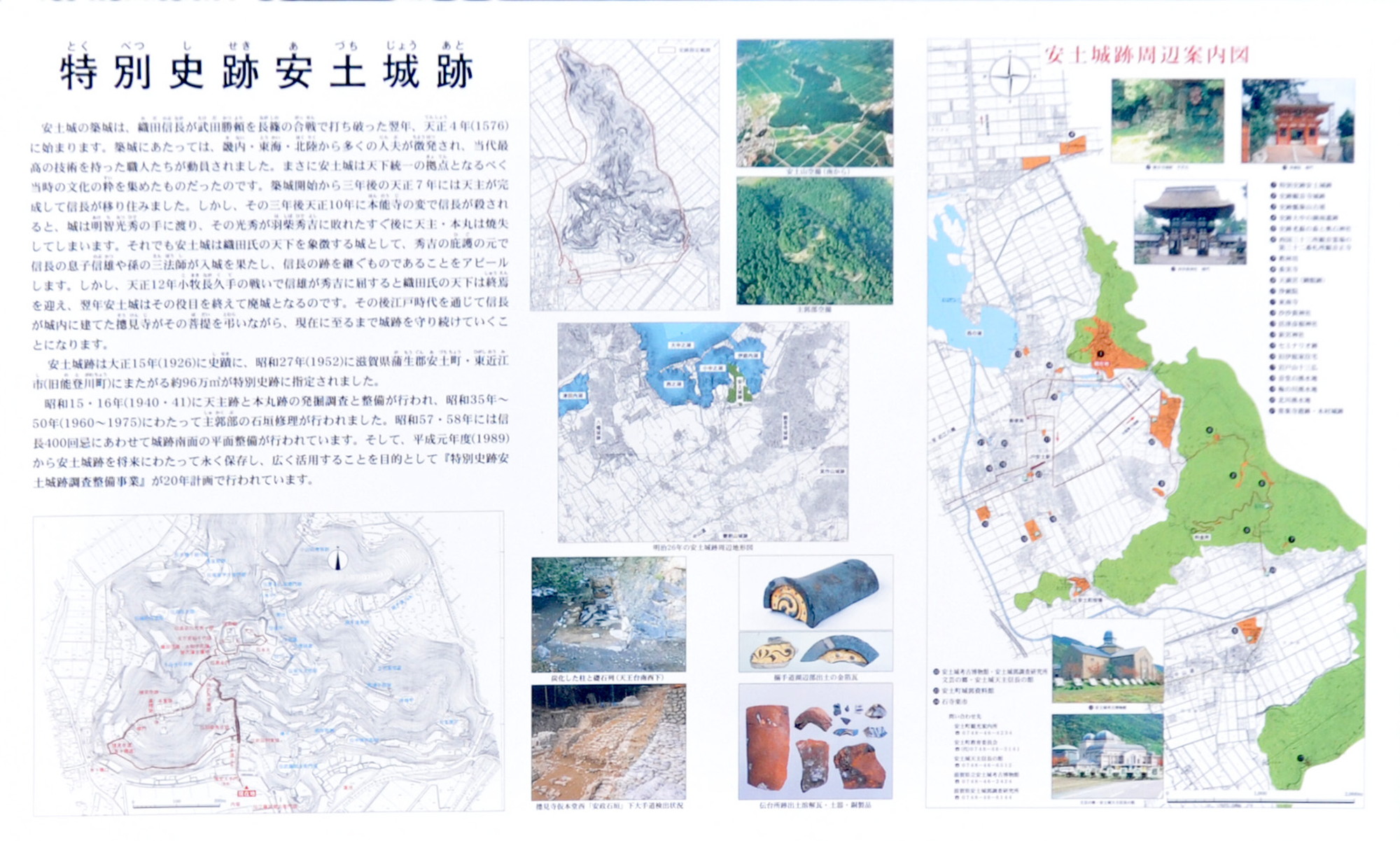 下羽田の里山から安土山が見え、安土城跡はこのサイトでは外せないアイテムの一つです。しかし安土城跡の紹介はすでに多くのサイトで行われていますので、有意なものにするためには内容を一ひねりする必要があります。そこで思いついたのが、安土城跡に設置された案内板の紹介に特化したページです。