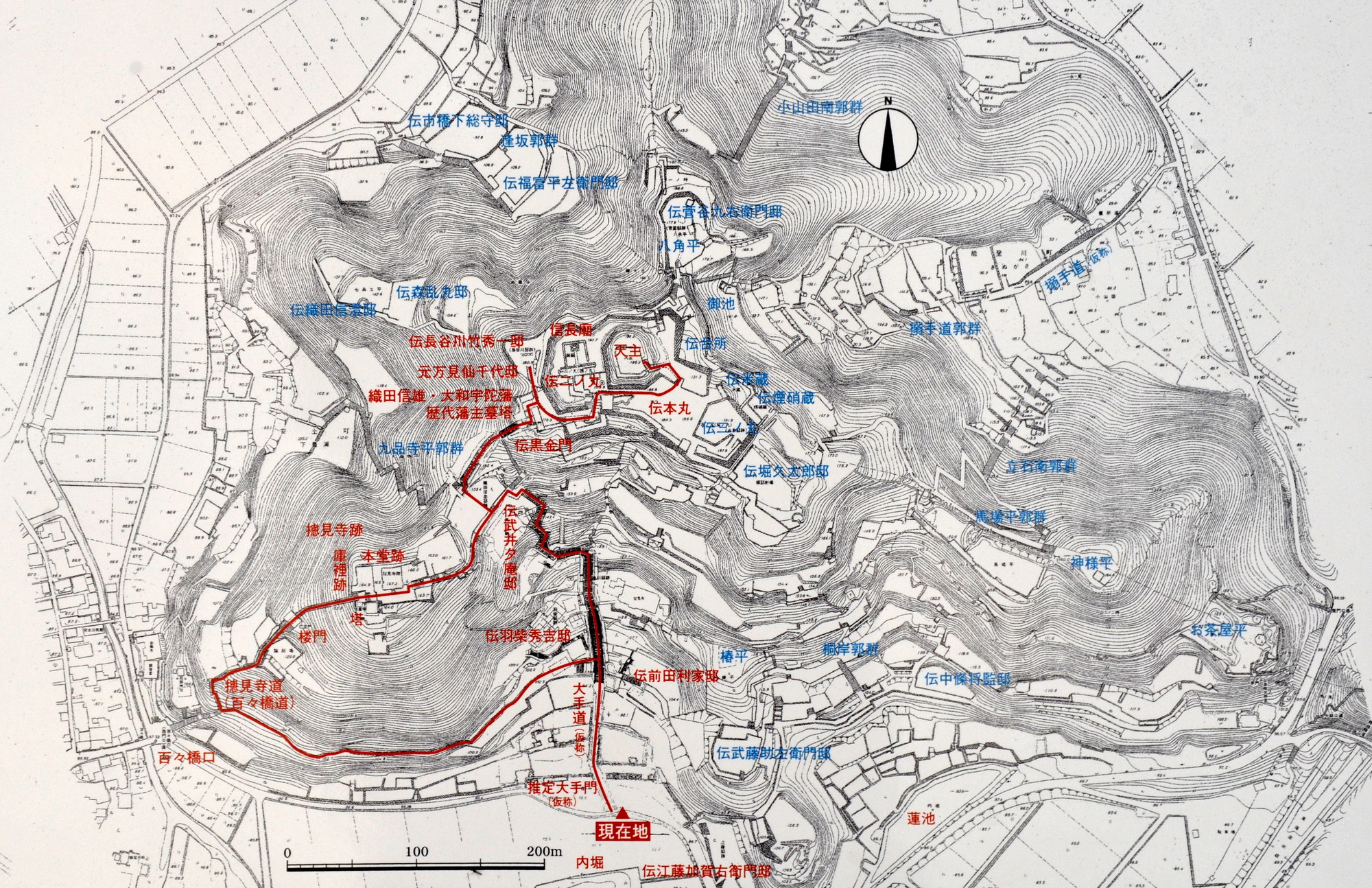 現在の安土城跡の見学コースは、大手道から天主に登り、帰りは中腹あたりで百々橋道方向に折れ、西側を周回するルートになっています。一方で案内板の縄張図にはこの他に、七曲り道、搦手道、東門道などが描かれており当時は多くの城道が使われていた事が分かります。また近江蒲生郡志に綴じ込まれている 大正時代に作られた縄張図 も安土城の全貌を知るのに役立ちます。