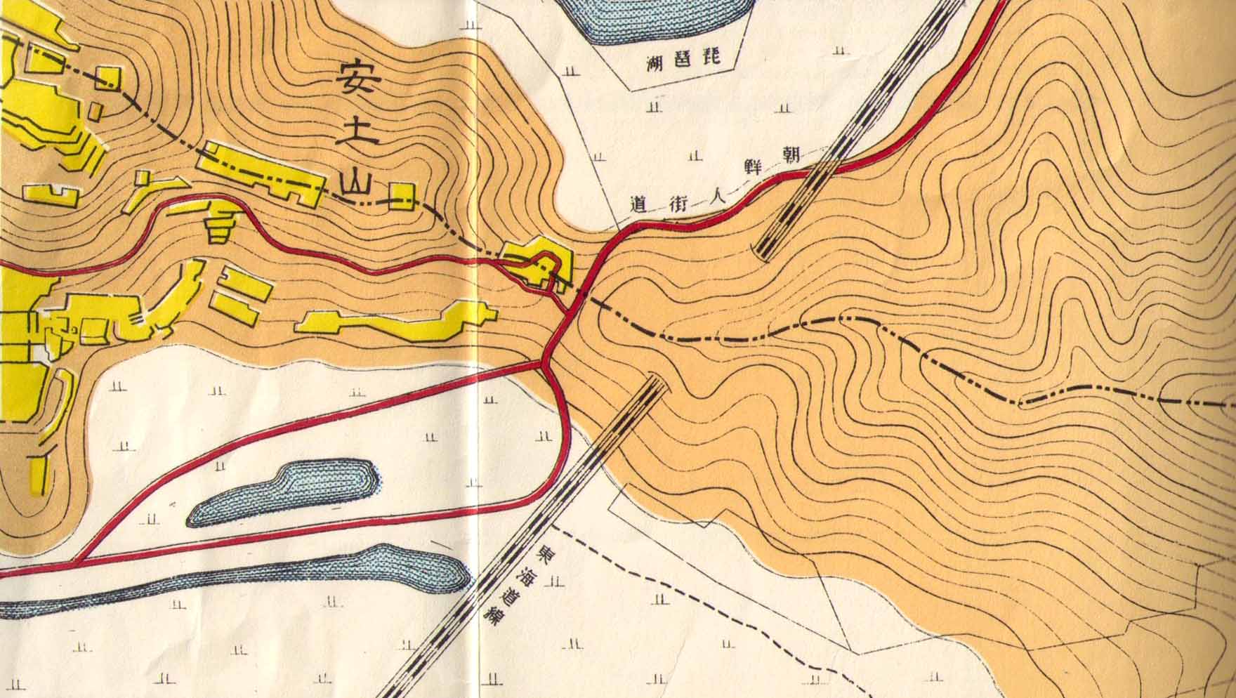 現在、観音寺街道と呼ばれる舗装道路が上羽田町を経由して老蘇方向に延びていますが、この古地図でもほぼ同じルートで道が通っています。おそらくこの道のルートは六角氏が支配していた時代から大きく変わっておらず、後藤館や布施山城と観音寺城とを結ぶ街道として利用されたため、この道が観音寺街道と呼ばれるようになったのではないでしょうか?