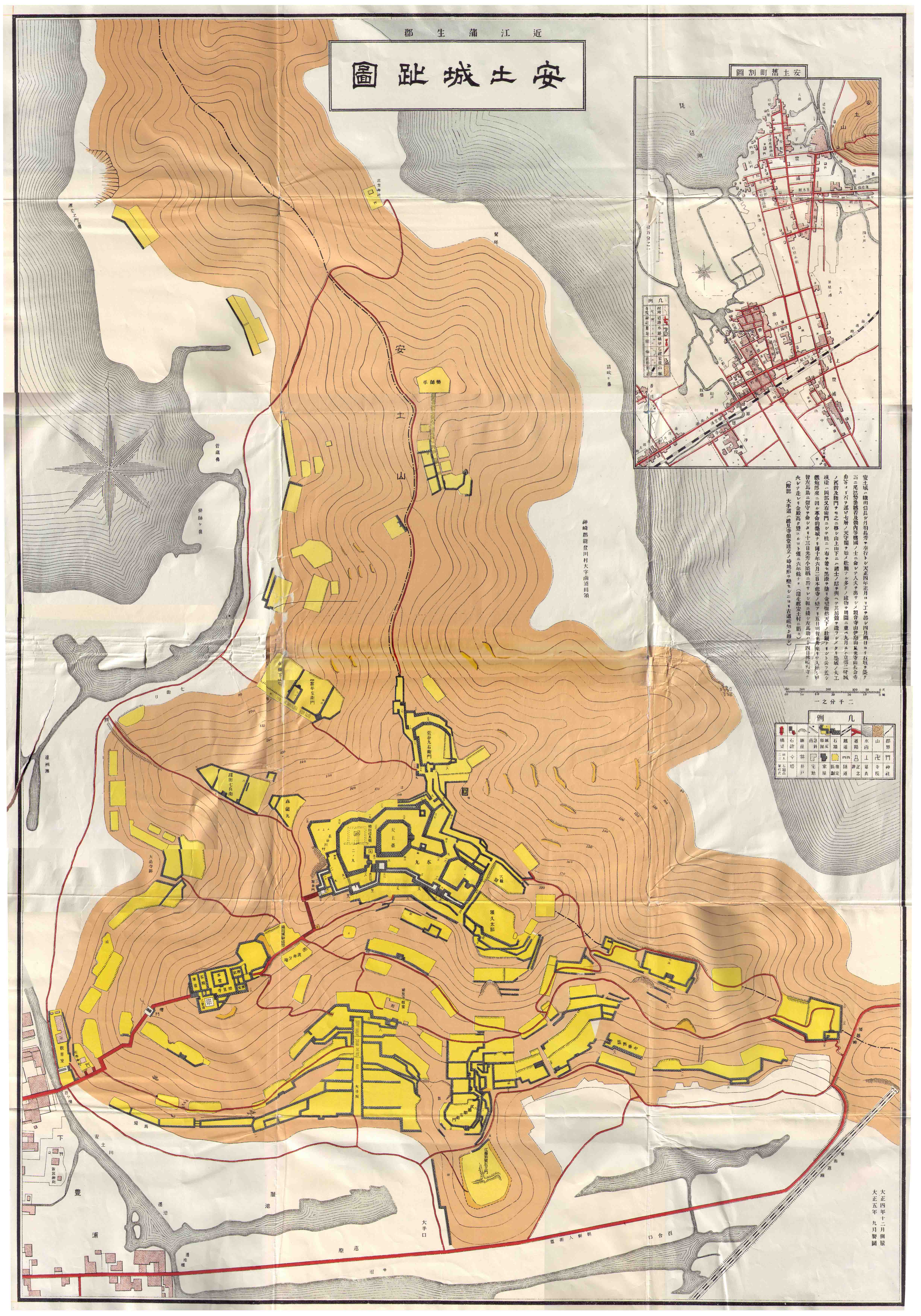 このように、これらの縄張図の多くは大正時代の測量によるものであり、地図には作成された大正時代の街並みや道路が描かれています。このため 400年以上前の城跡遺構に加え 100年前の周囲の様子を見て取る事ができます。