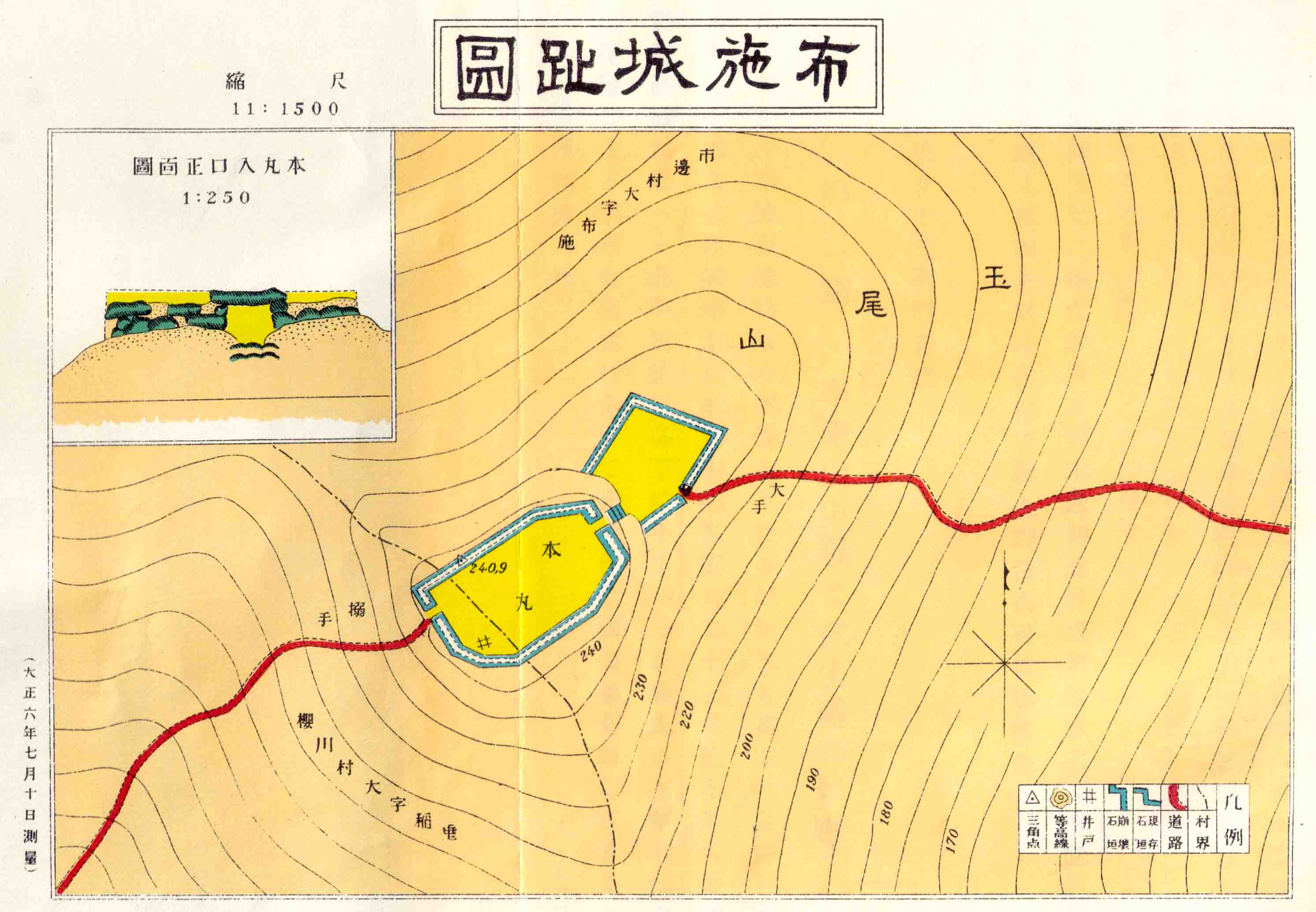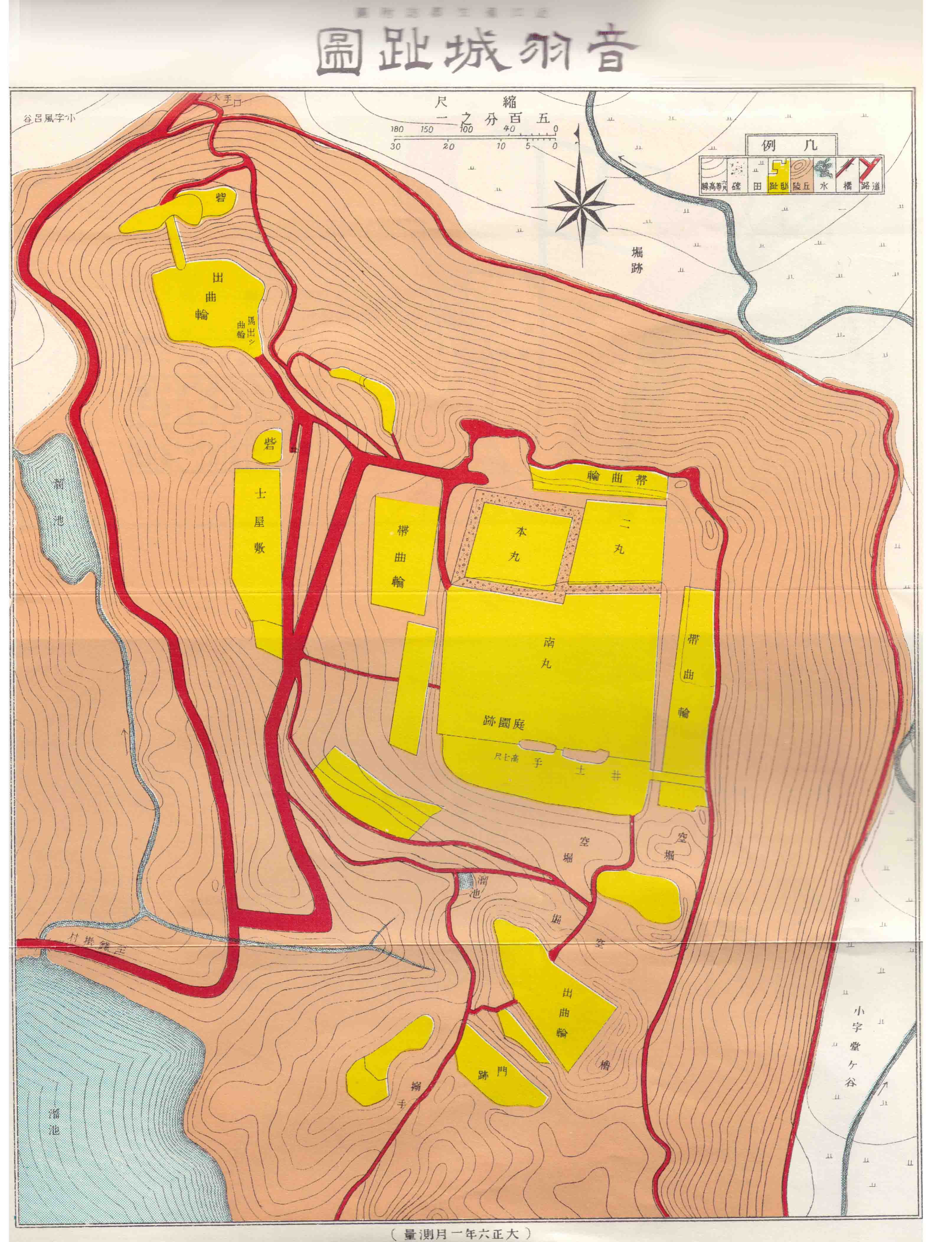このように、これらの縄張図の多くは大正時代の測量によるものであり、地図には作成された大正時代の街並みや道路が描かれています。このため 400年以上前の城跡遺構に加え 100年前の周囲の様子を見て取る事ができます。