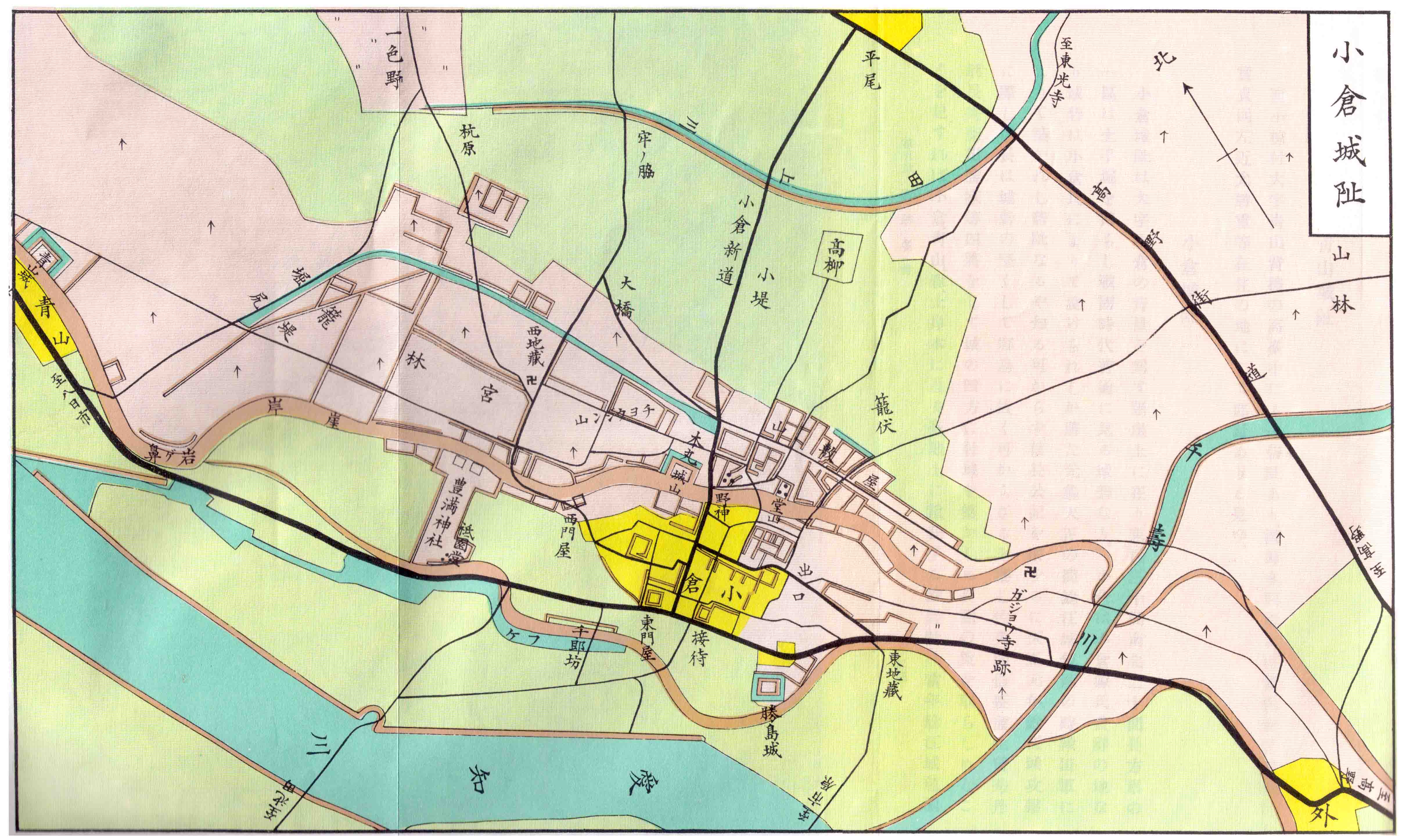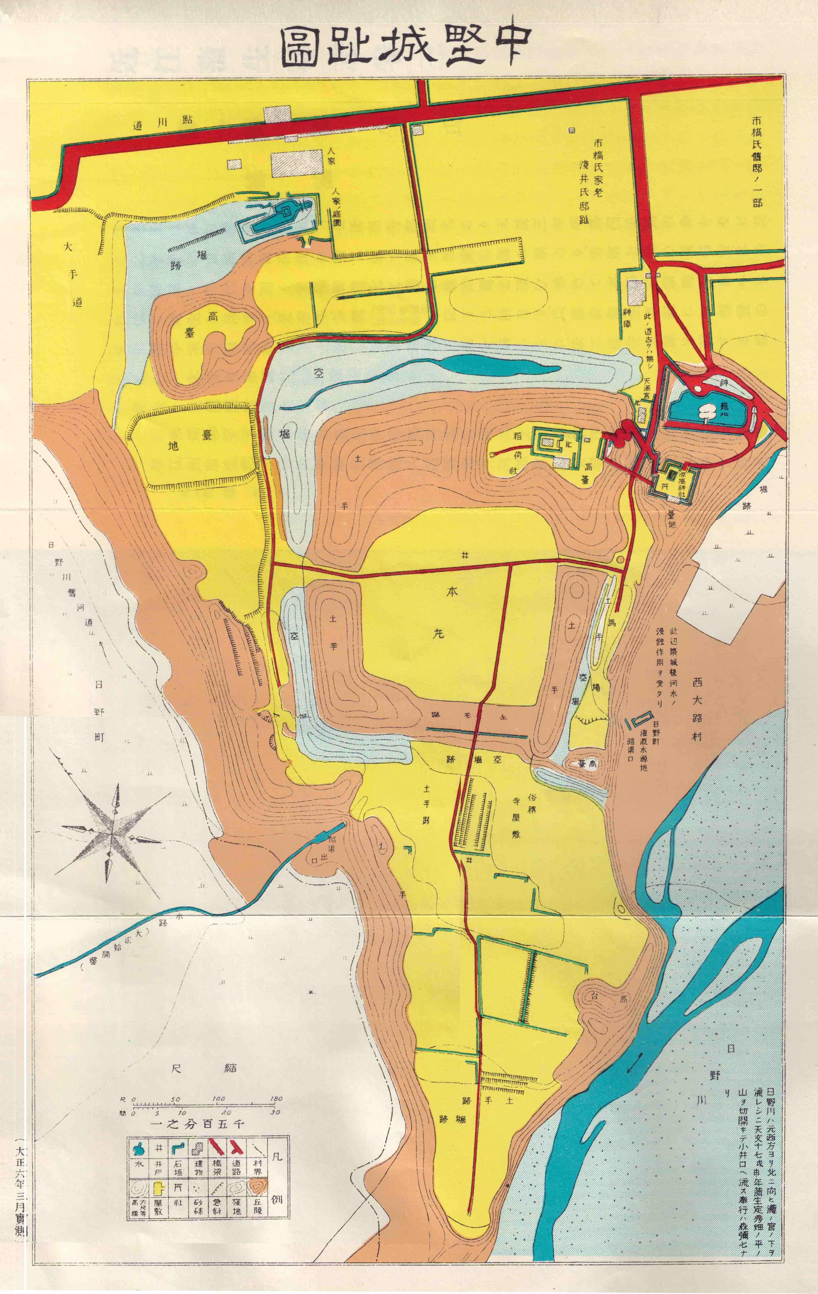 この図には、地図が作成された時期(大正時代)の道と、古い城道(戦国時代)の両方が示されています。
